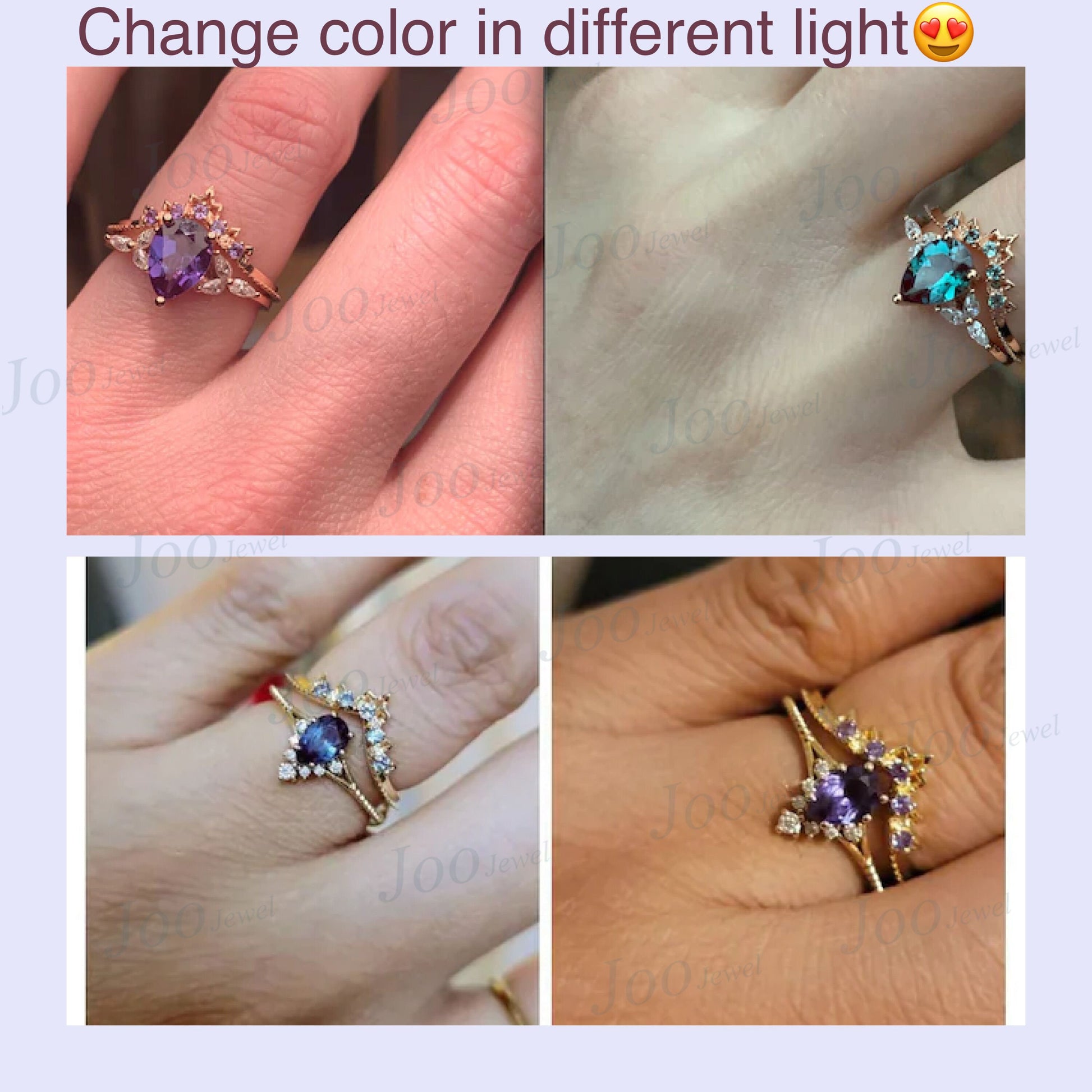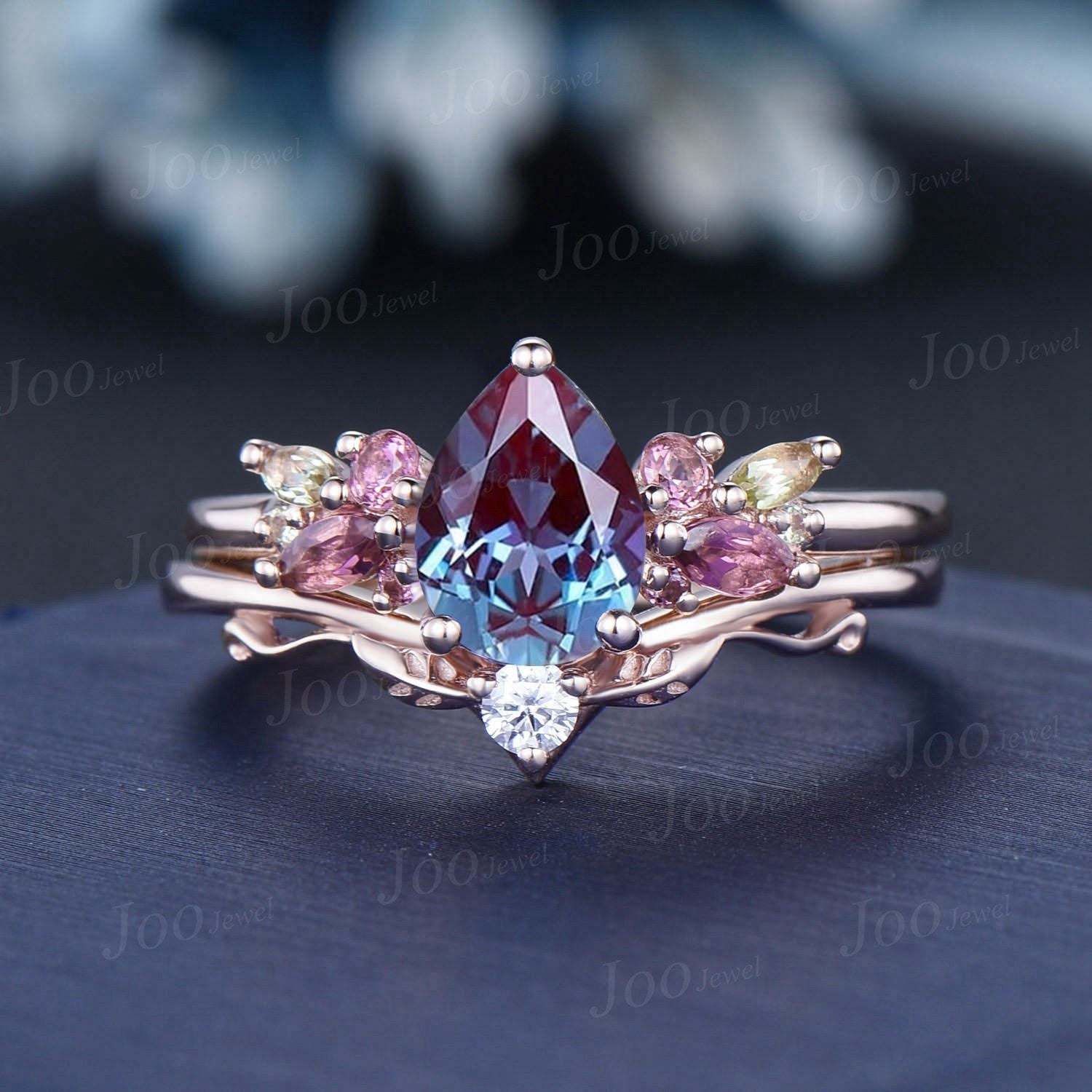 1.25ct Pear Alexandrite Peridot Engagement Ring Cluster Branch Leaf Diamond Band Alexandrite Pink Tourmaline Bridal Set June Birthstone Gift