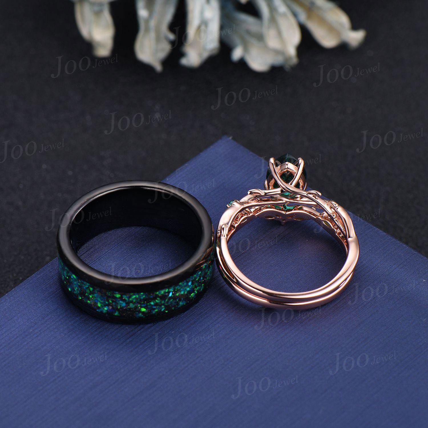 1.25ct Pear Cut Black Fire Opal Couple Promise Ring Set 925 Sterling Silver & Tungsten Matching Ring