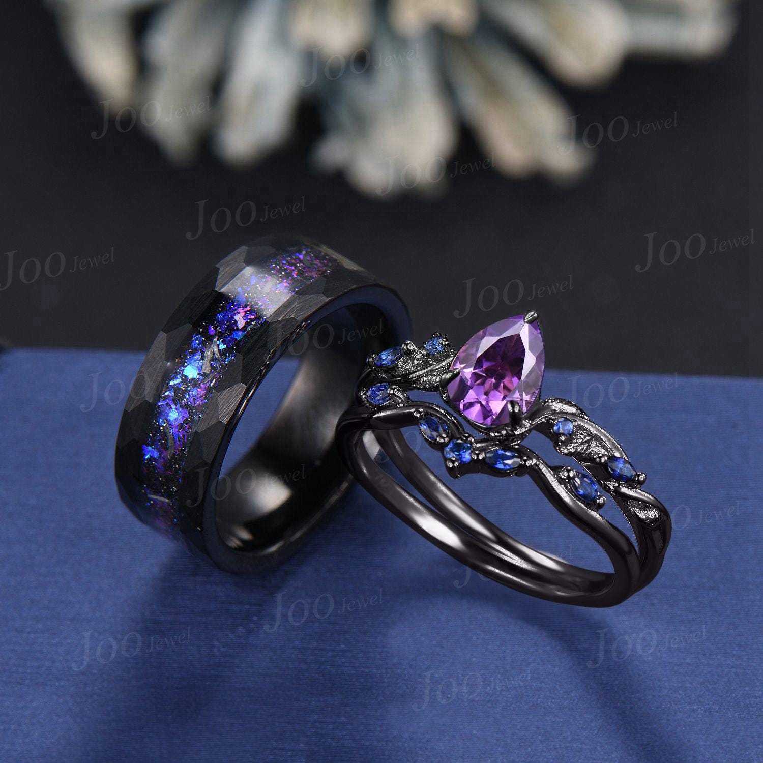 1.25ct Pear Cut Natural Amethyst Sapphire Vine Leaf Couples Ring Set Wear-resistant Men Tungsten Galaxy Nebula Matching Ring Set for Lover