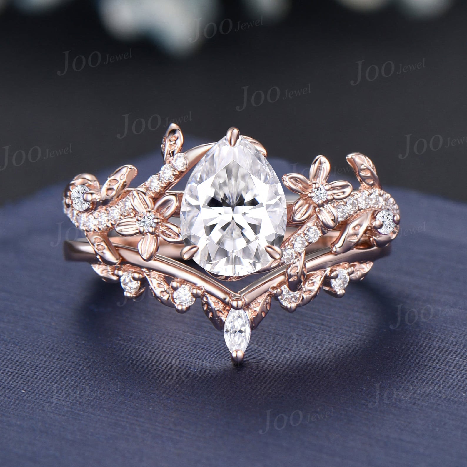 1.25ctw Pear Cut Lab Grown Diamond Wedding Ring 14K Rose Gold Leaf Vine Floral Bridal Ring