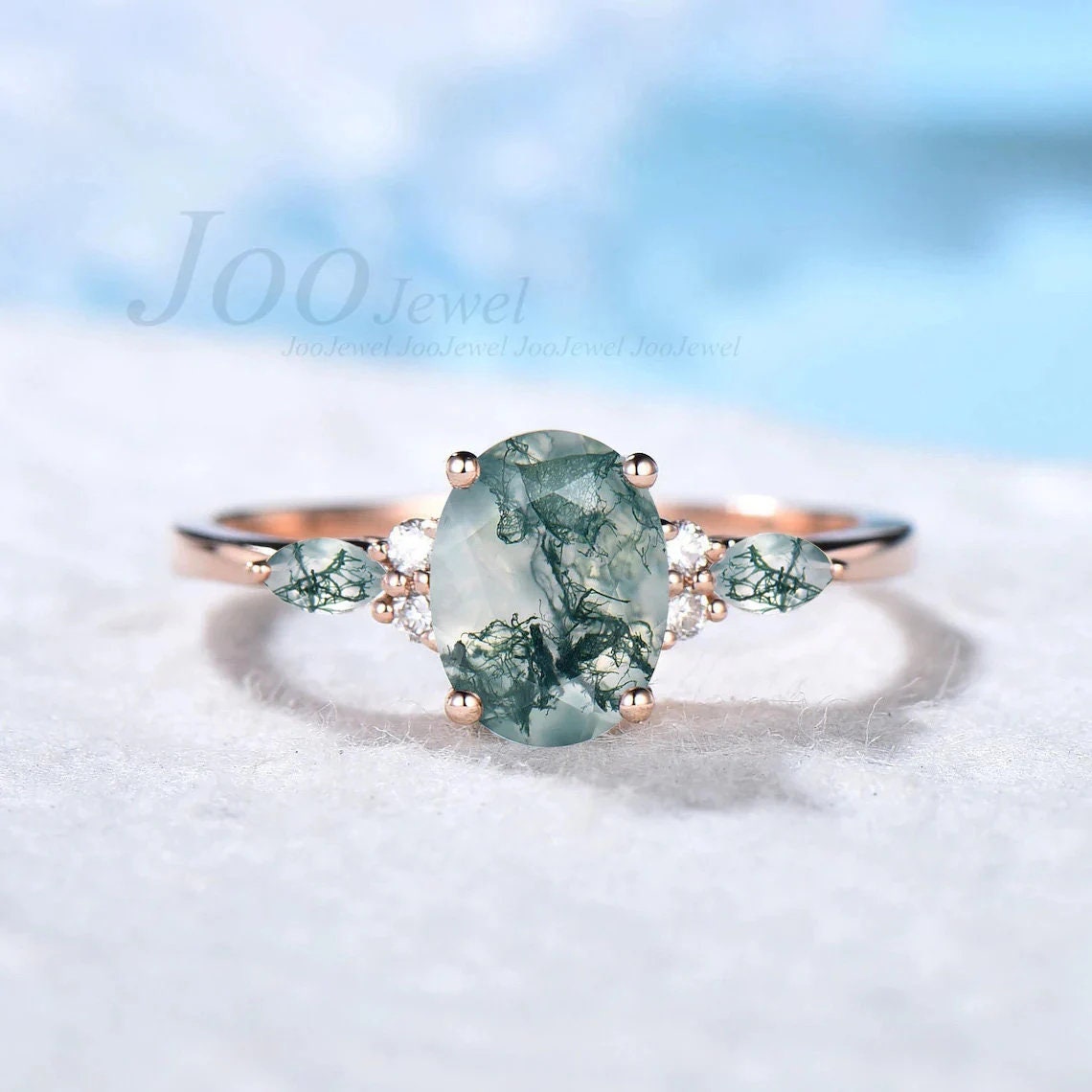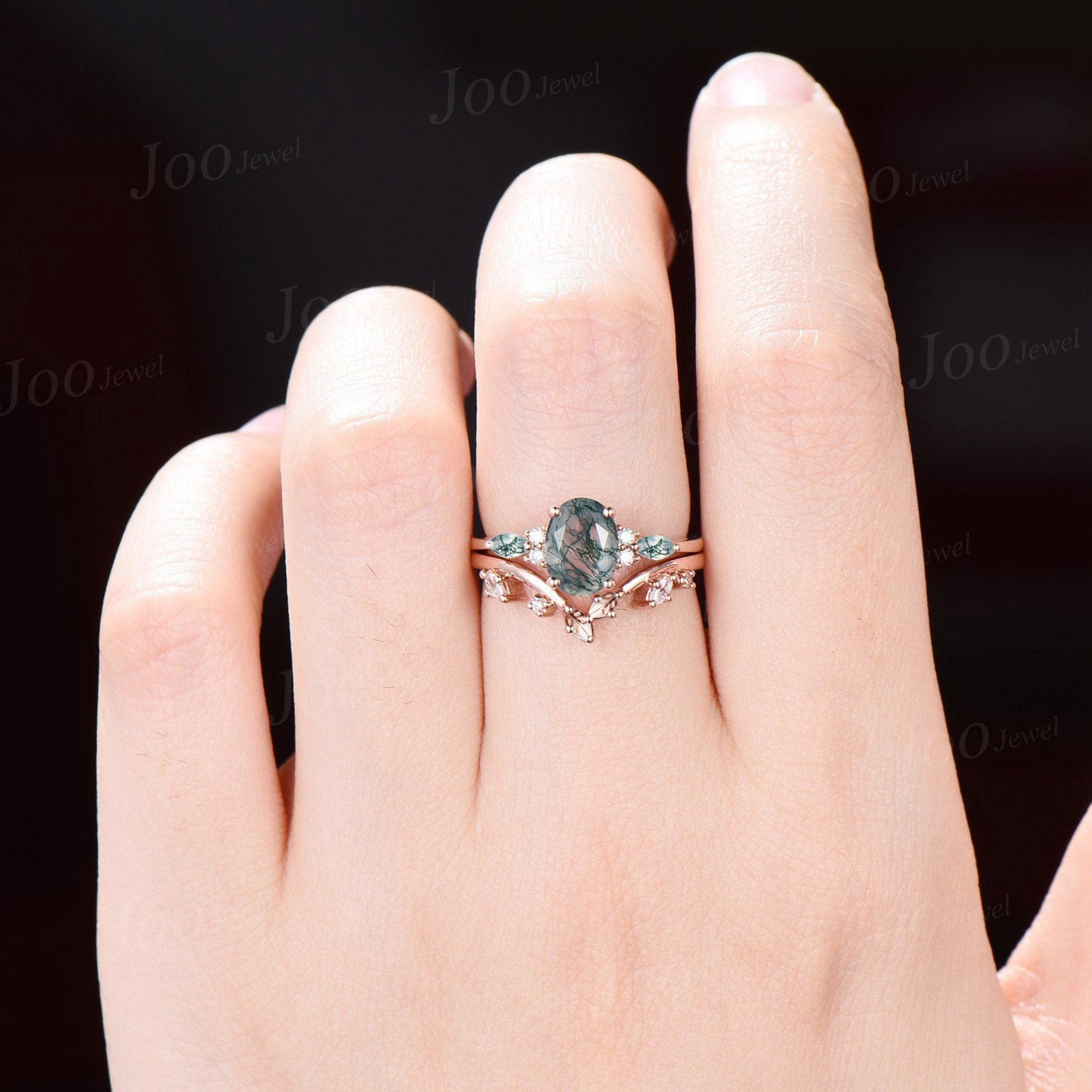 1.5ct Nature Inspired Natural Moss Agate Engagement Rings 10K Rose Gold Oval Bridal Set Cluster Aquatic Agate Leaf Moissanite Wedding Rings