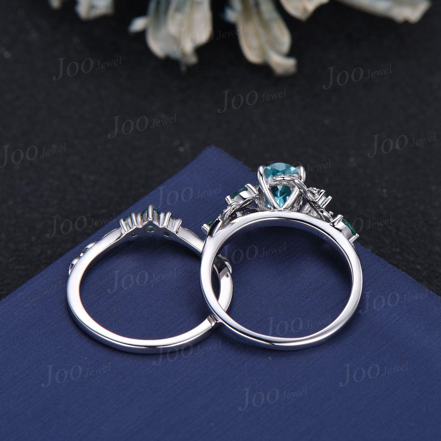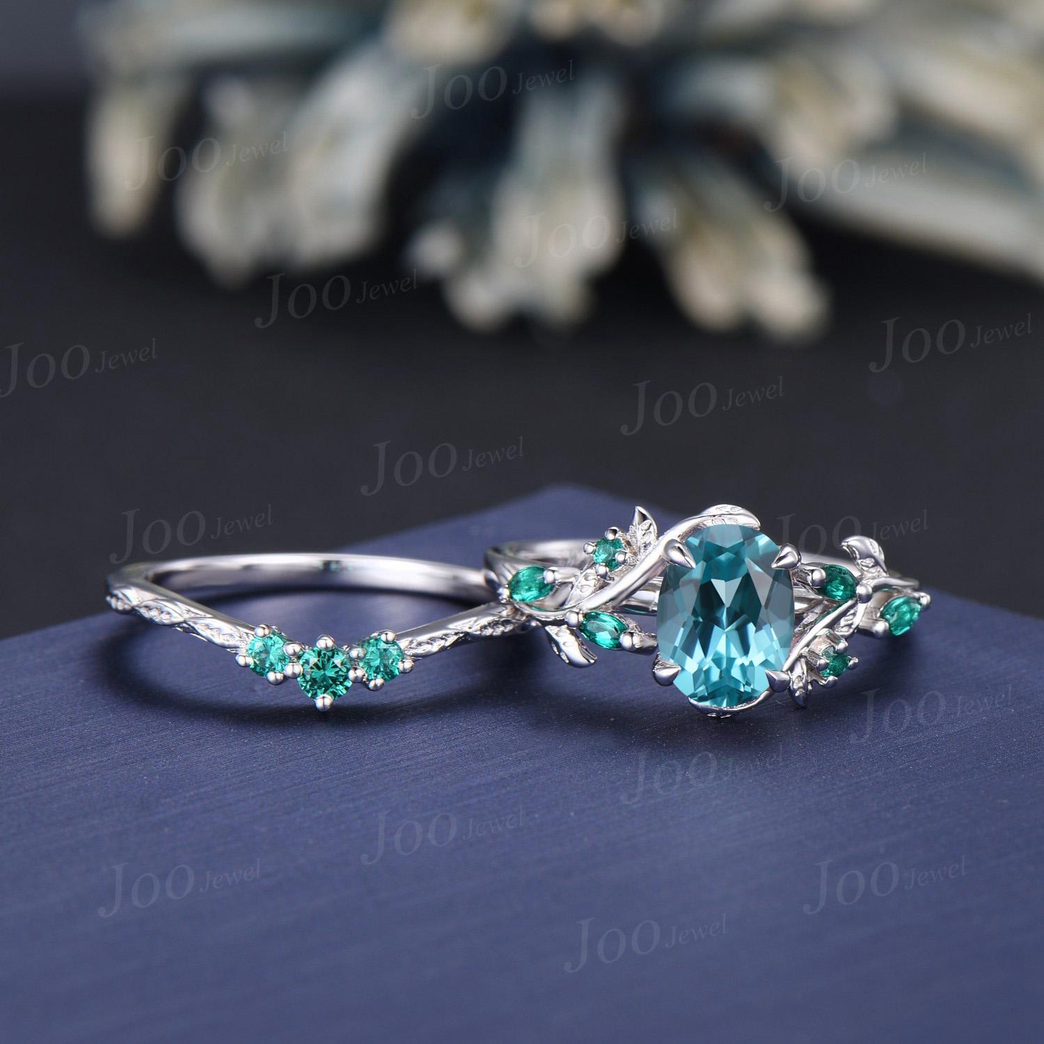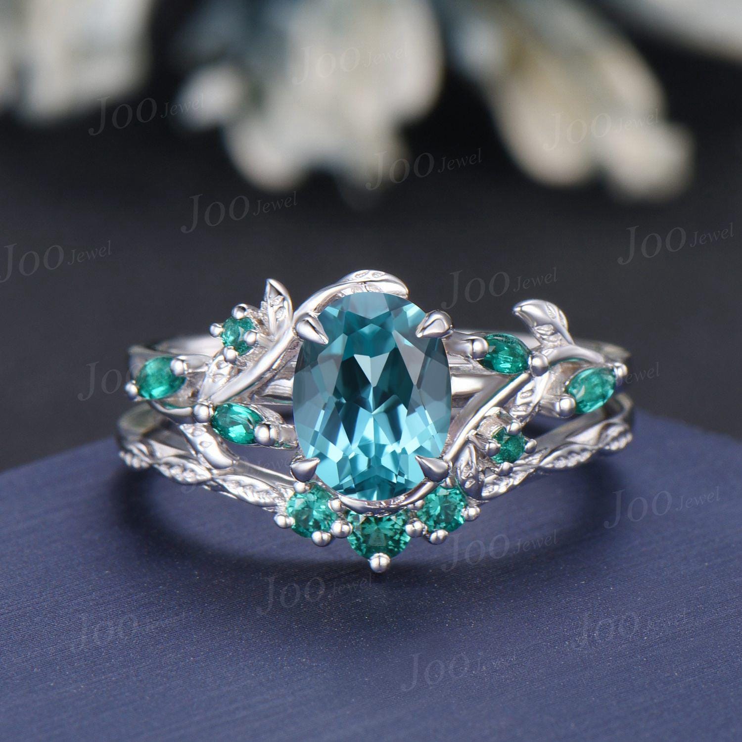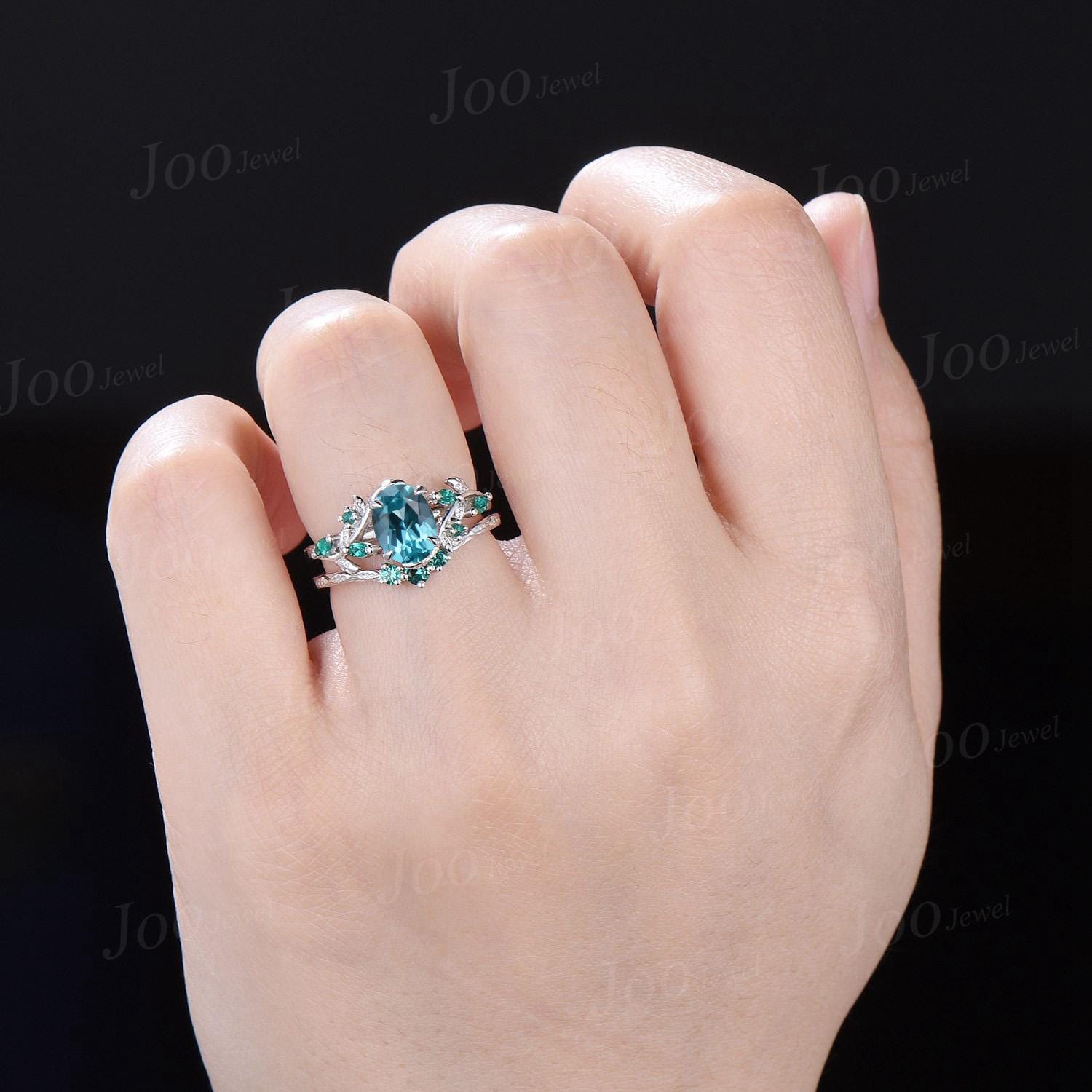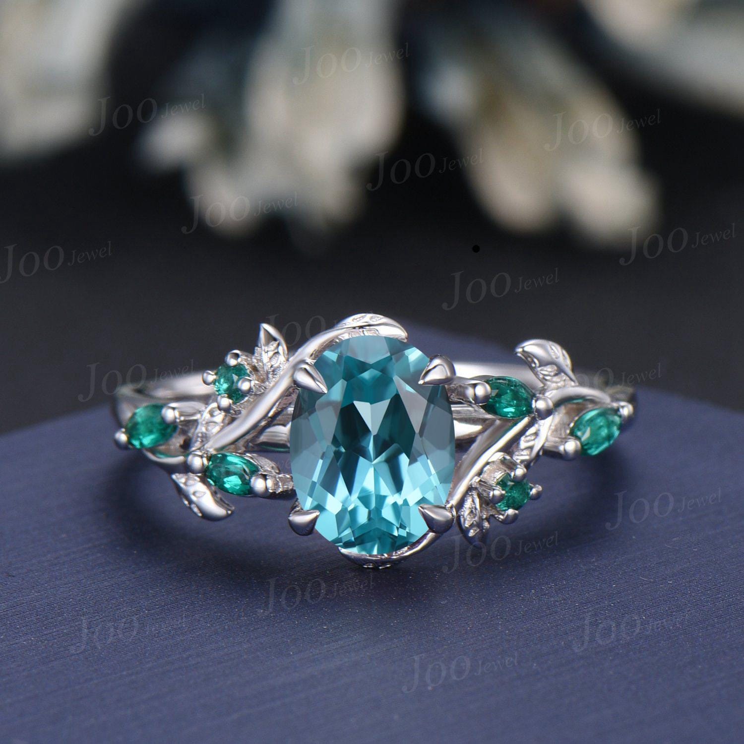 1.5ct Oval Cut Leaf Vine Blue Paraiba Tourmaline Cluster Wedding Ring Sterling Silver Green Emerald Nature Inspired Paraiba Ring for Women