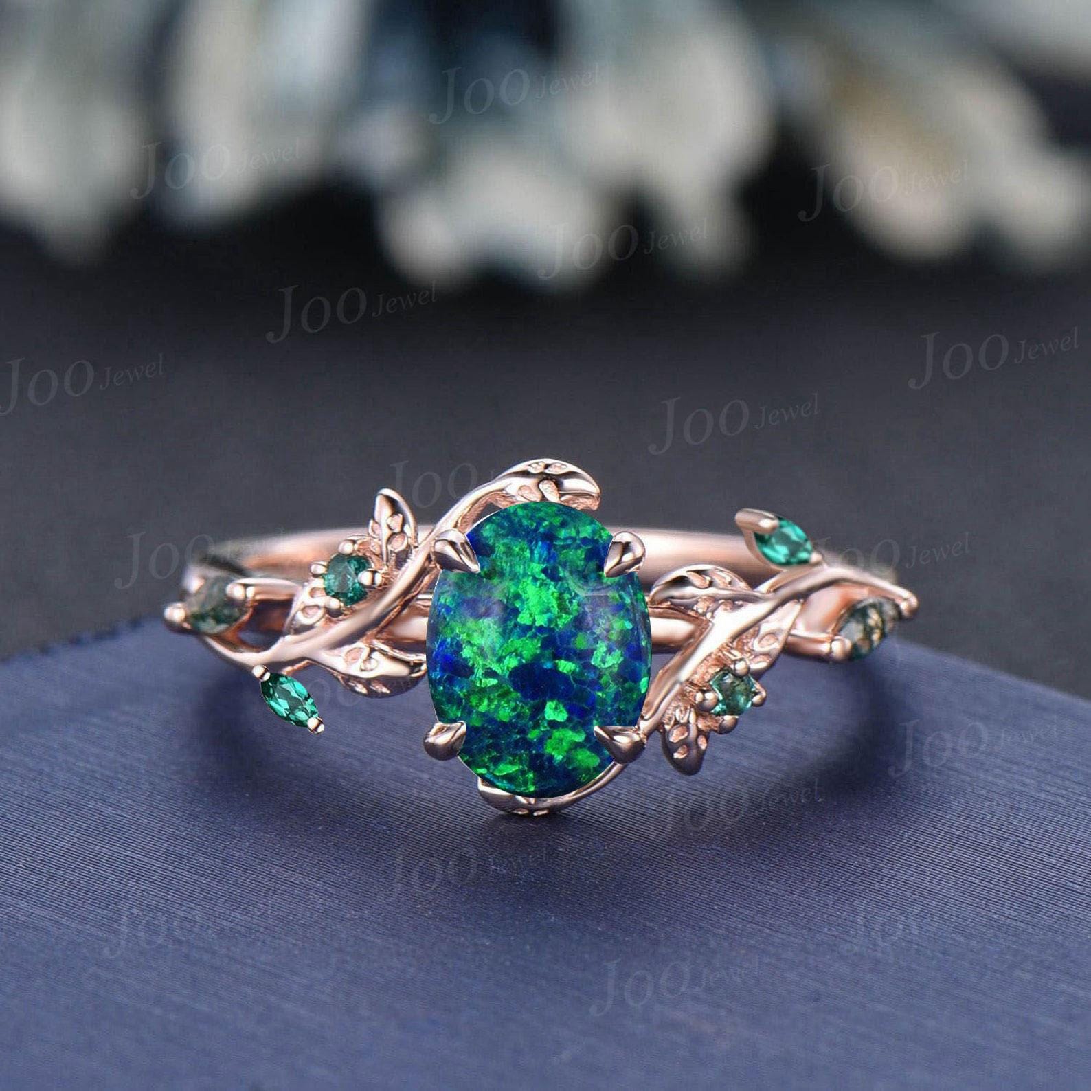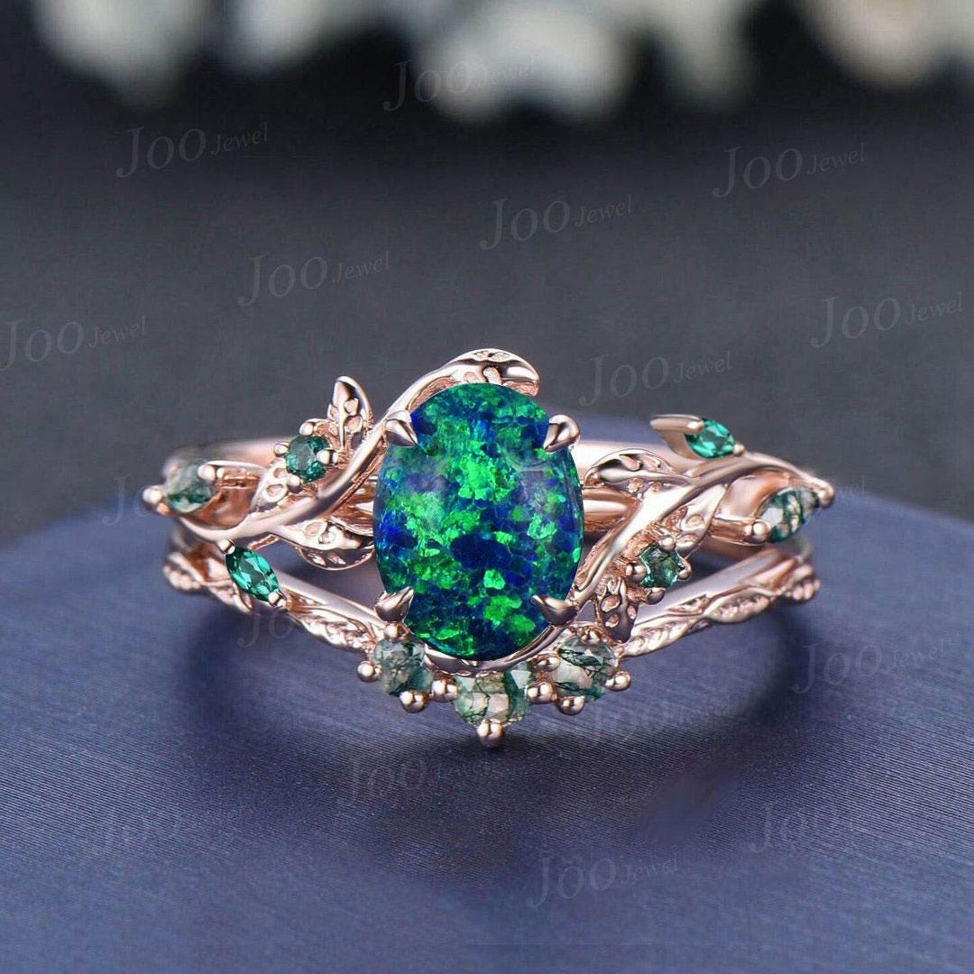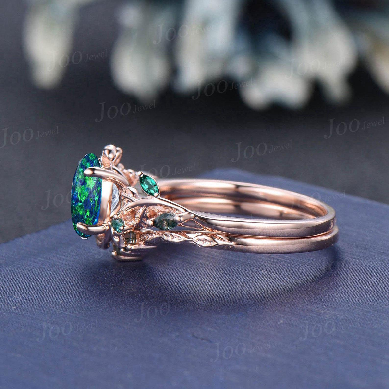 1.5ct Oval Galaxy Black Opal Emerald Bridal Set Vintage 14K Rose Gold Family Stone Jewelry Anniversary Gift Twig Vine Cluster Wedding Ring