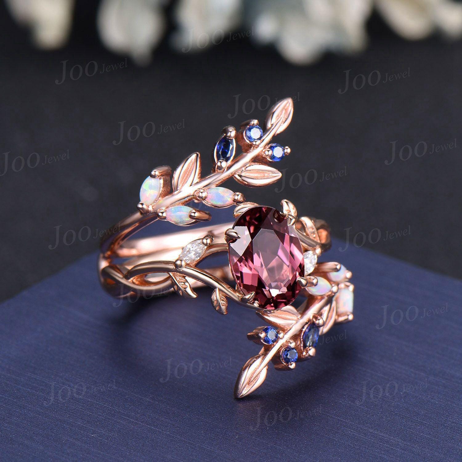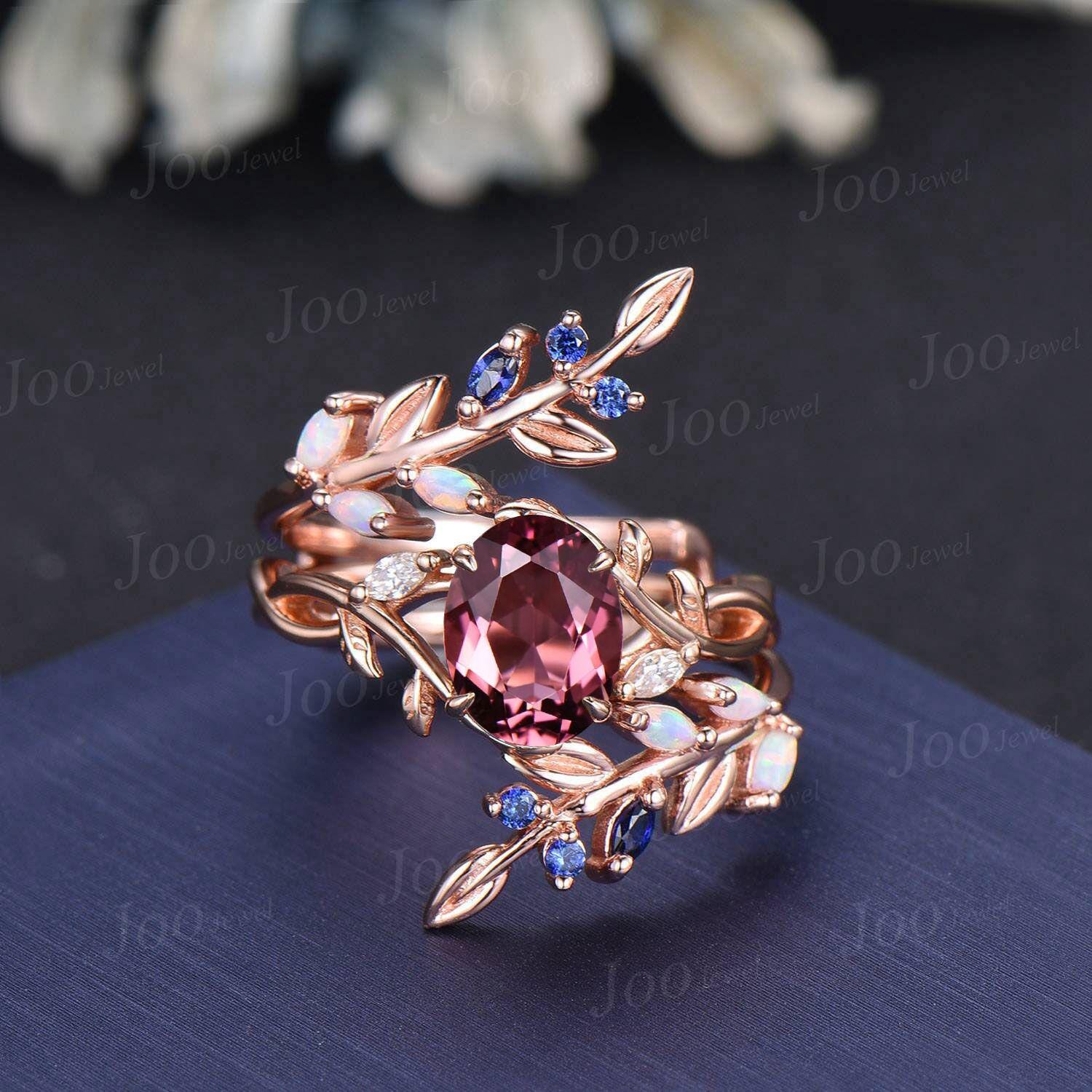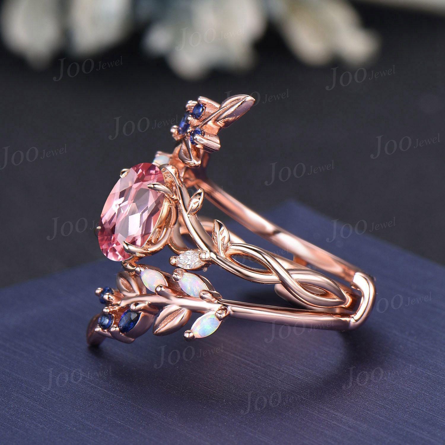 1.5ct Oval Natural Pink Tourmaline Nature Inspired Ring Set- Infinity Leaf Wedding Rings- Blue Sapphire Opal Accent- Enhancer Wedding Band