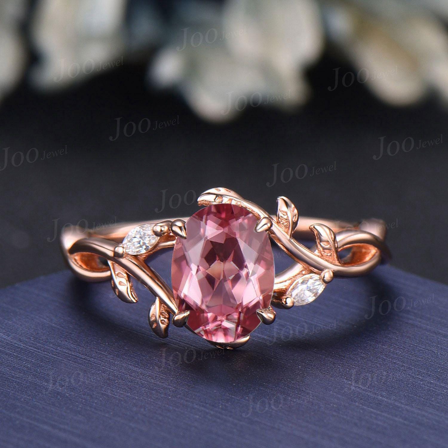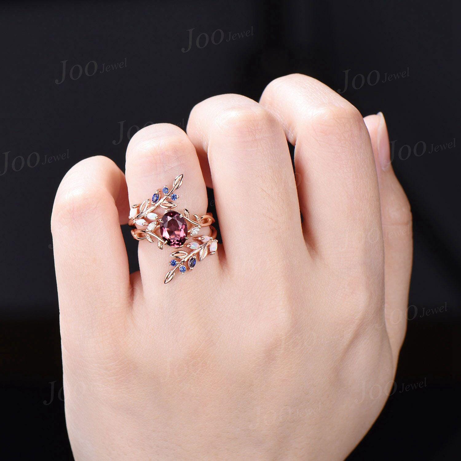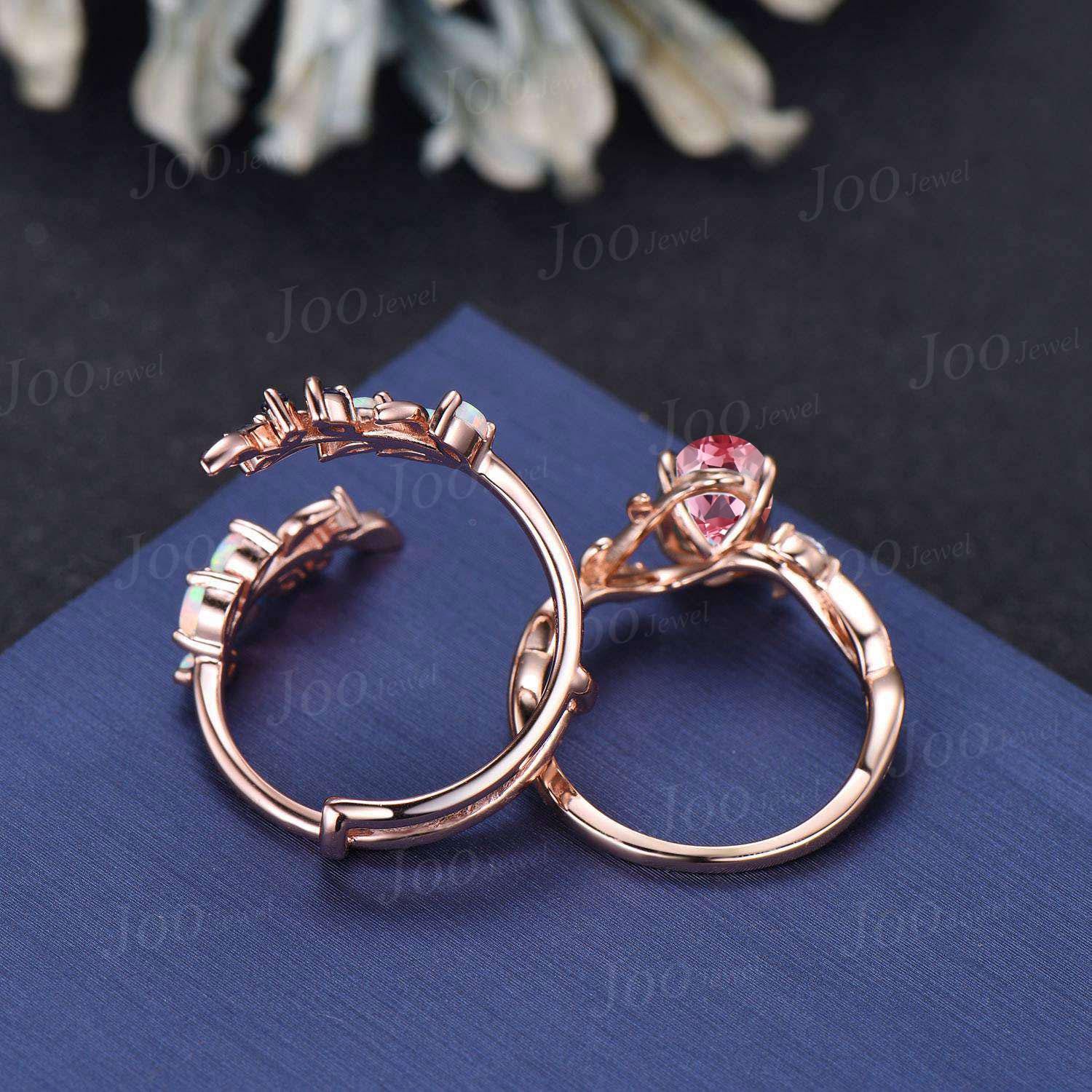 1.5ct Oval Natural Pink Tourmaline Nature Inspired Ring Set- Infinity Leaf Wedding Rings- Blue Sapphire Opal Accent- Enhancer Wedding Band