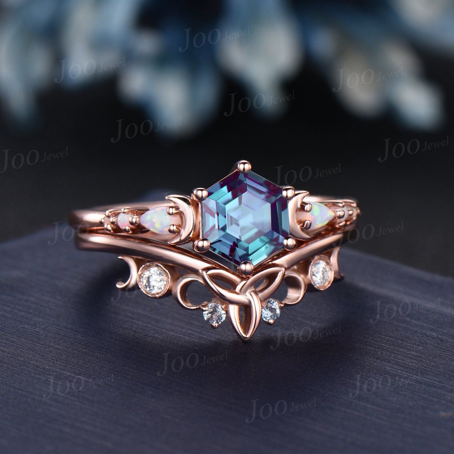 1ct Hexagon Color-Change Alexandrite Opal Engagement Ring Rose Gold Crescent Moon Wedding Ring Trinity Celtic Knot Moissanite Bridal Rings