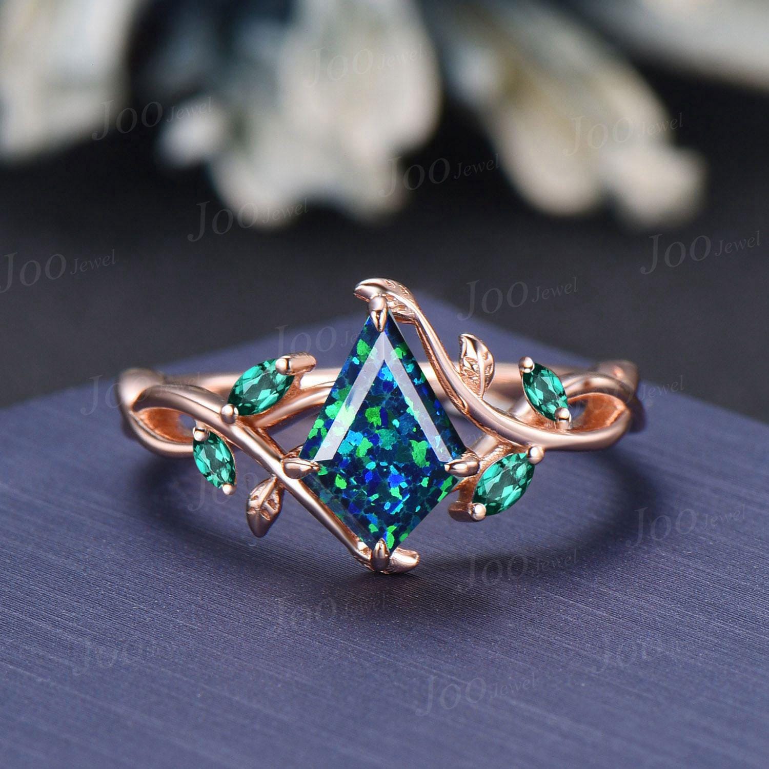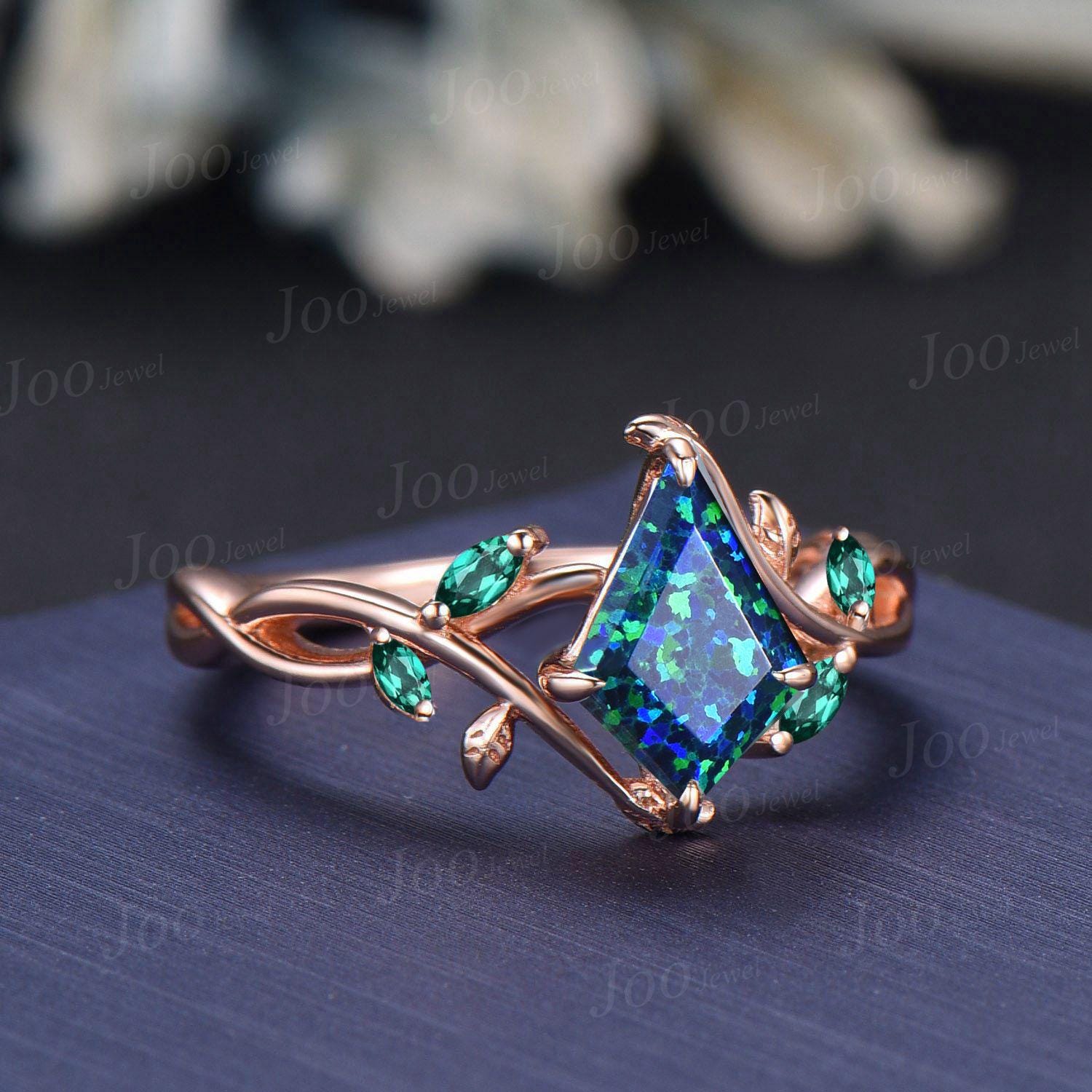 1ct Kite Cut Black Opal Ring | Infinity Leaf Emerald Ring | Twig Vine Black Opal Engagement Ring for Women | Nature Themed Wedding Jewelry