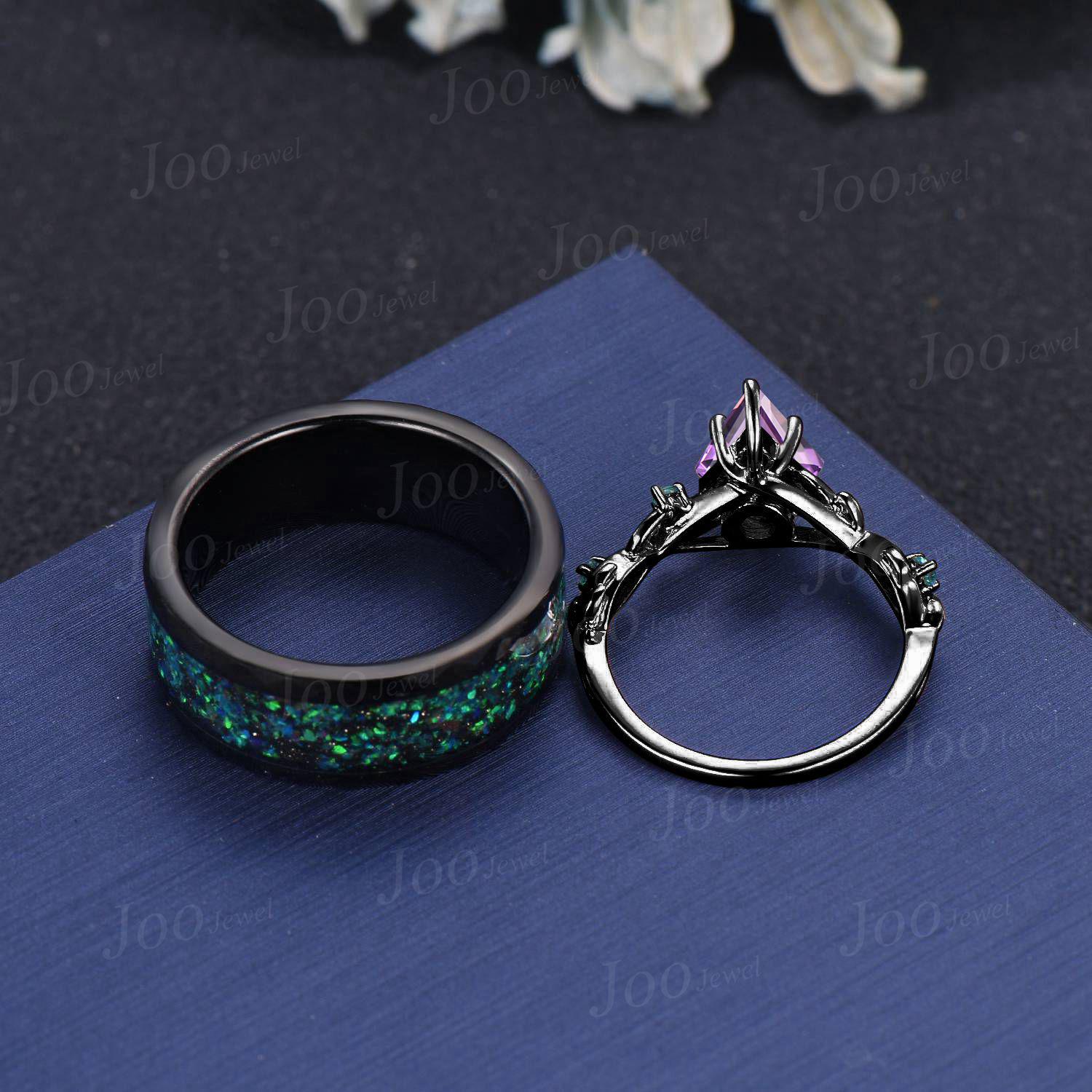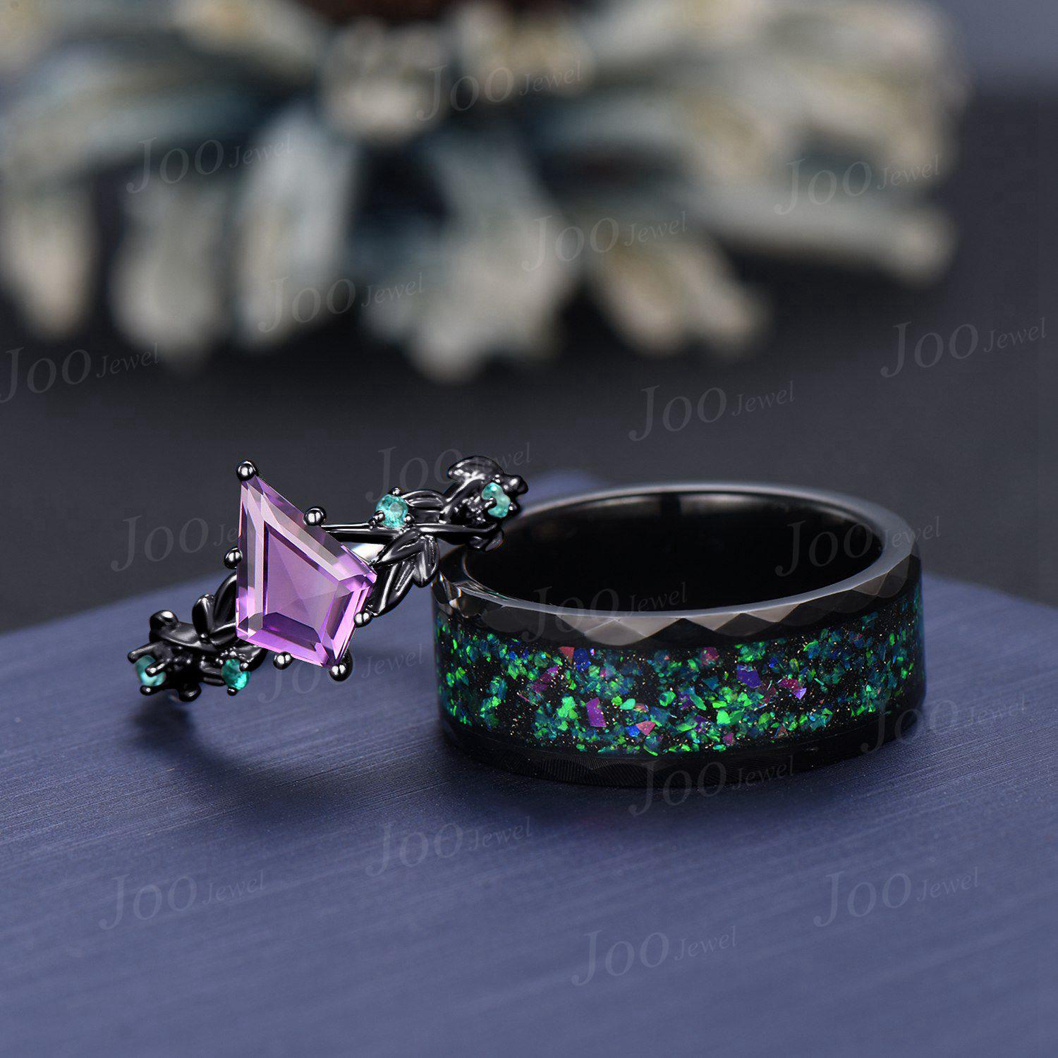 1ct Kite Cut Natural Amethyst Emerald Twig Vine Ring Black Ceramic Tungsten Band for Men Wear-resistant Ring Matching Ring Set for Couple