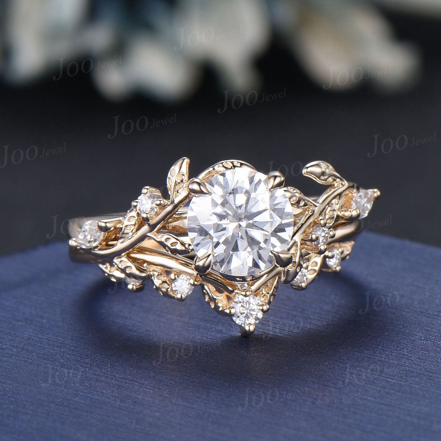 1ct Round Cut Moissanite Engagement Ring 14K Real Gold Nature Inspired Diamond Engagement Ring Leaf Wedding Bridal Set Unique Proposal Gifts