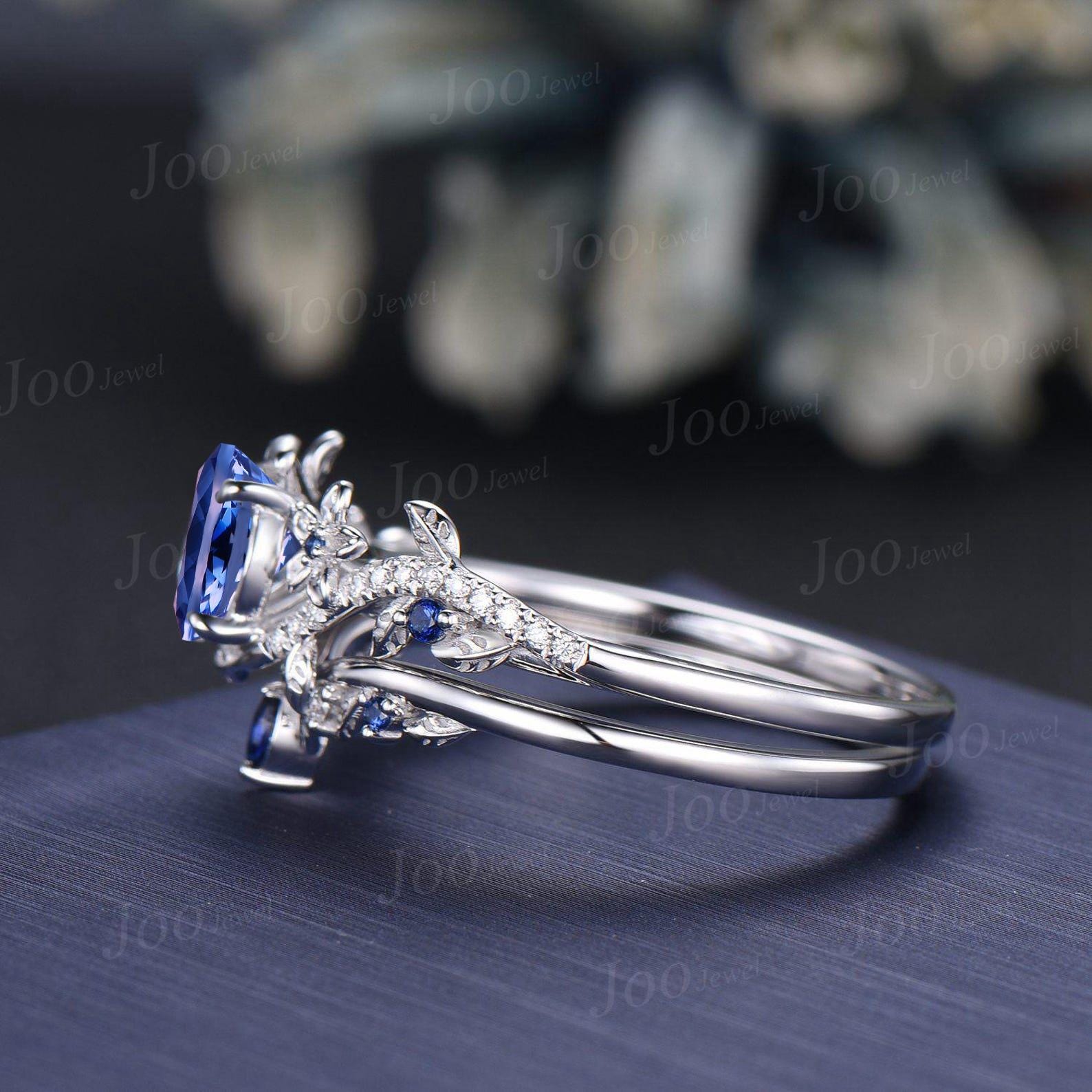 1ct Round Cut Natural Tanzanite Wedding Ring Set Unique Floral Branch Tanzanite Blue Sapphire Bridal Ring Platinum Engagement Ring for Women