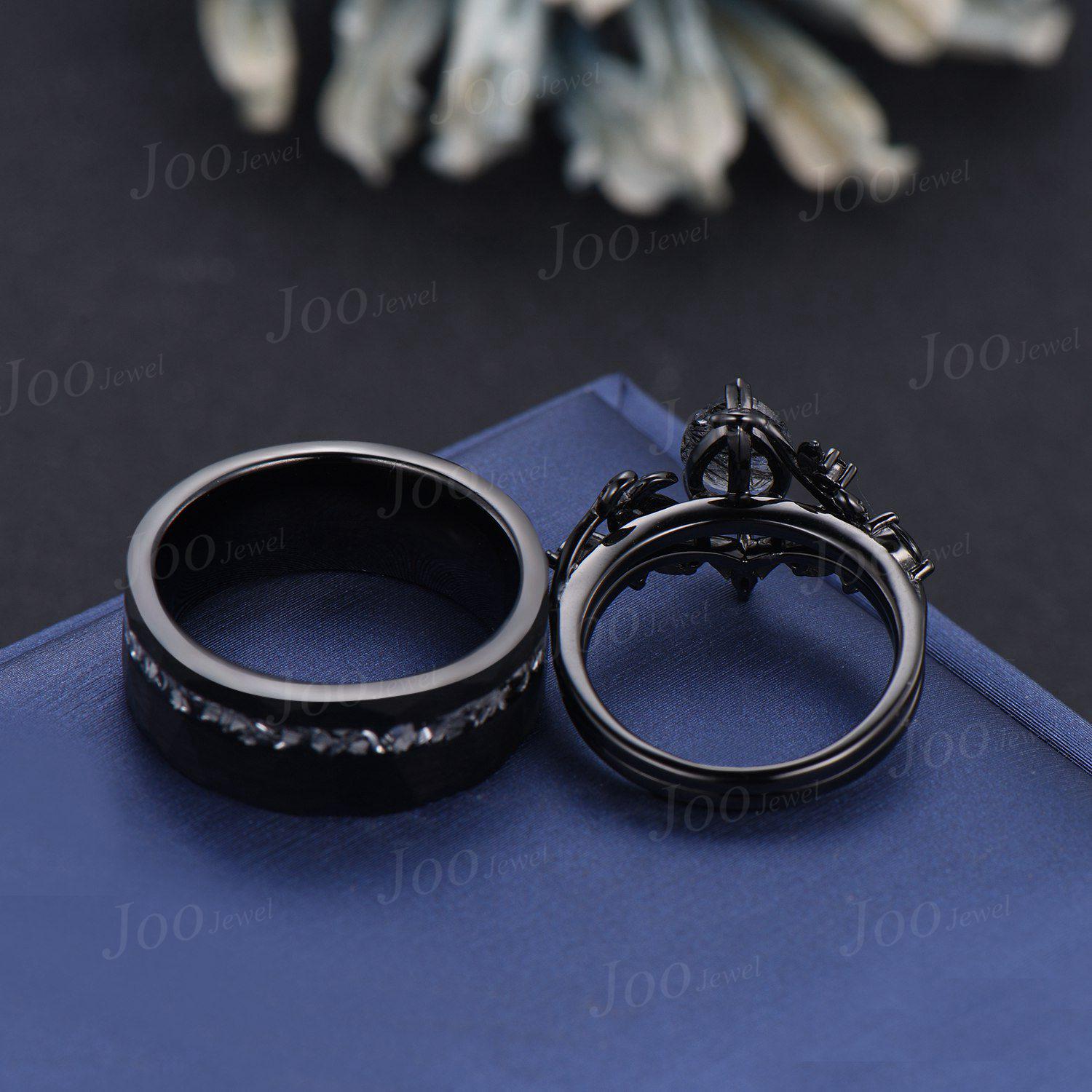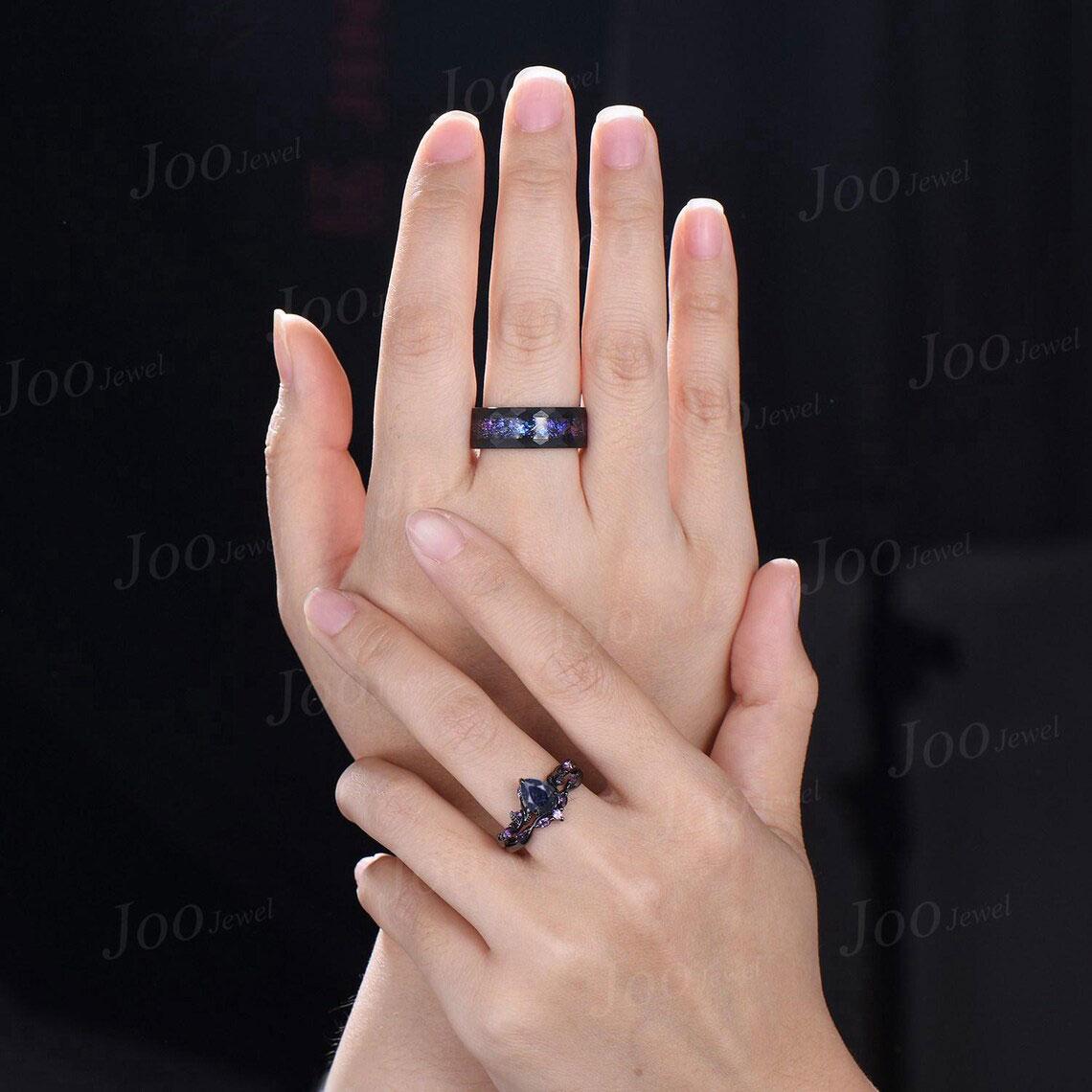2pcs Galaxy Blue Sandstone Couple Ring Set Nature Inspired Gothic His and Her Black Wedding Ring Set Men No-Fading Tungsten Matching Rings