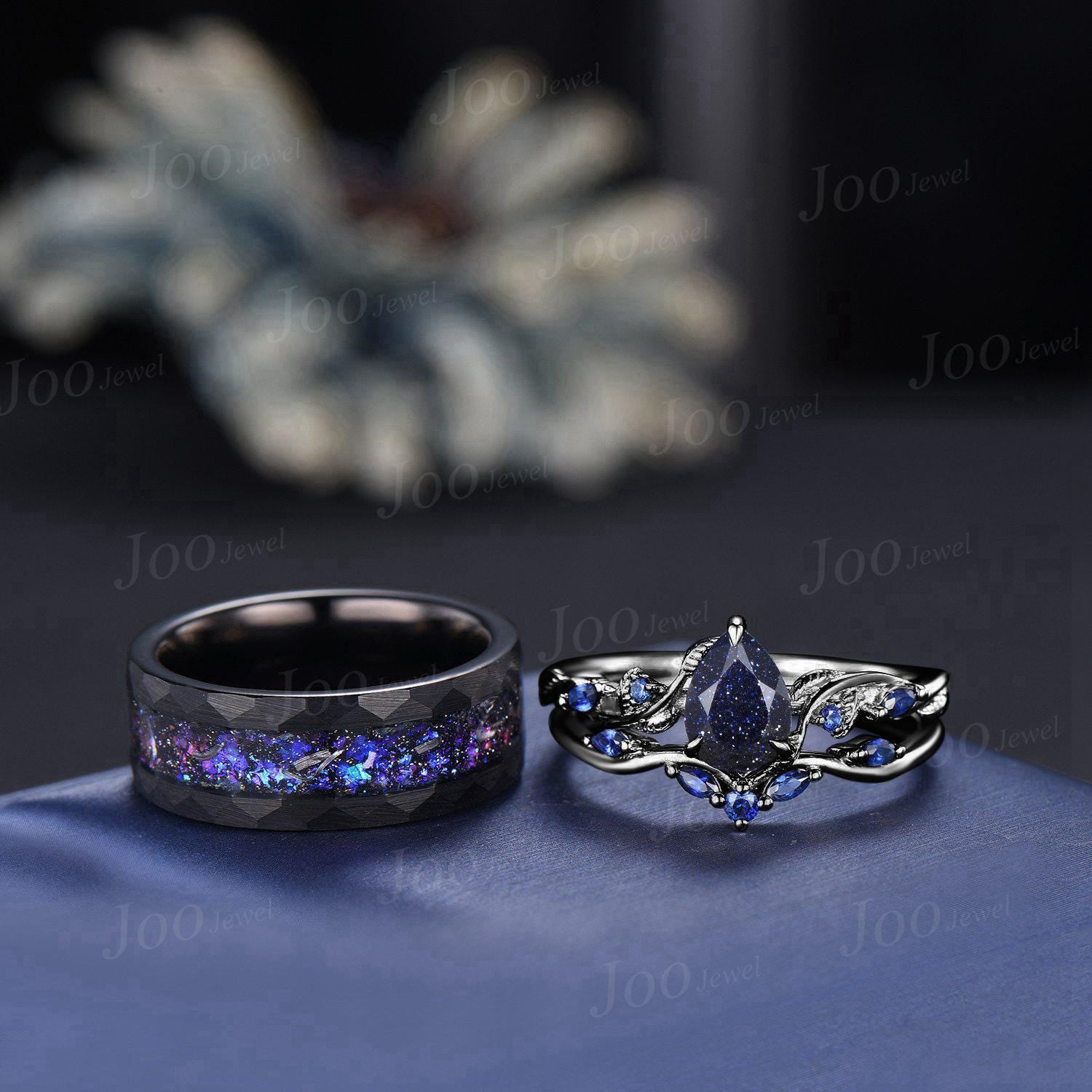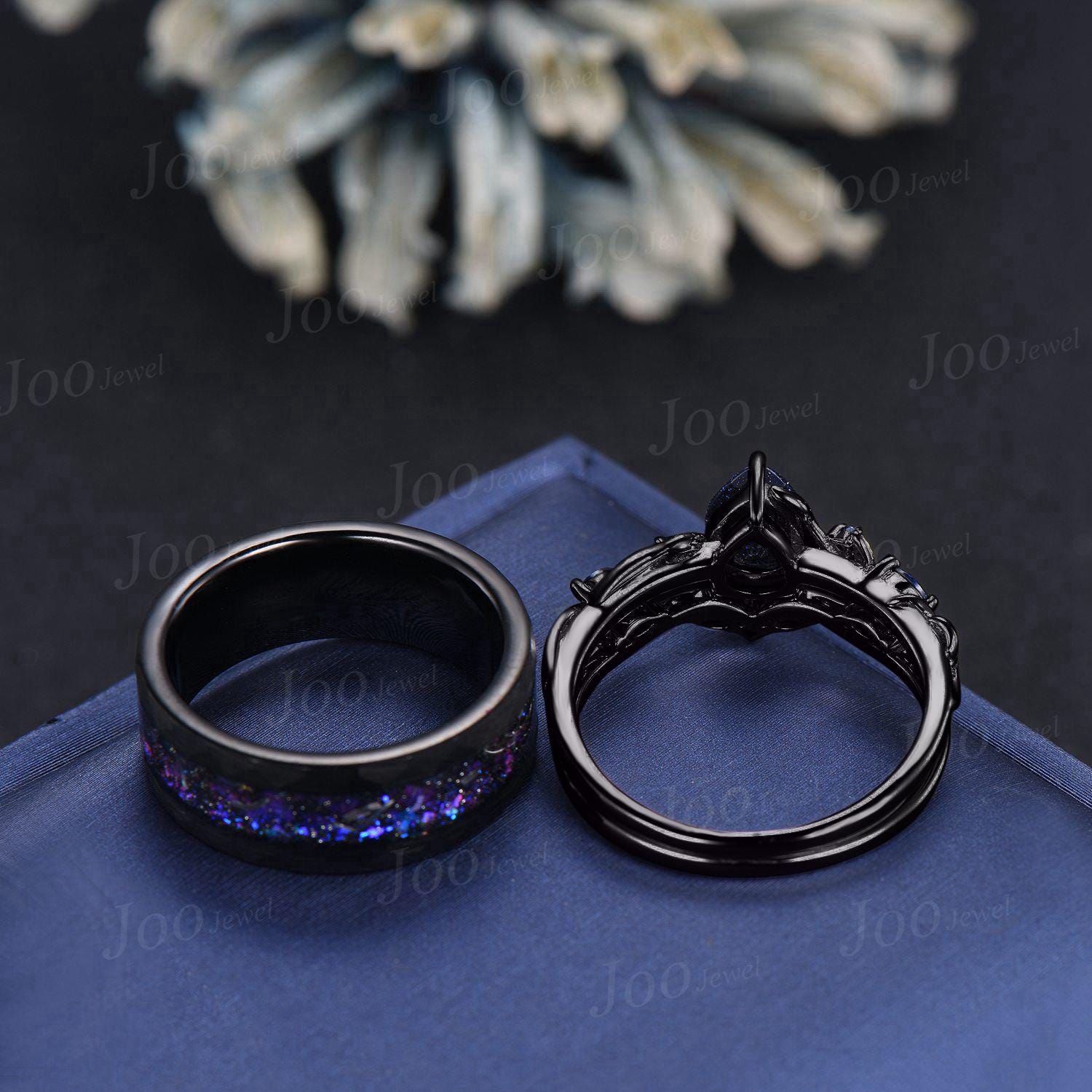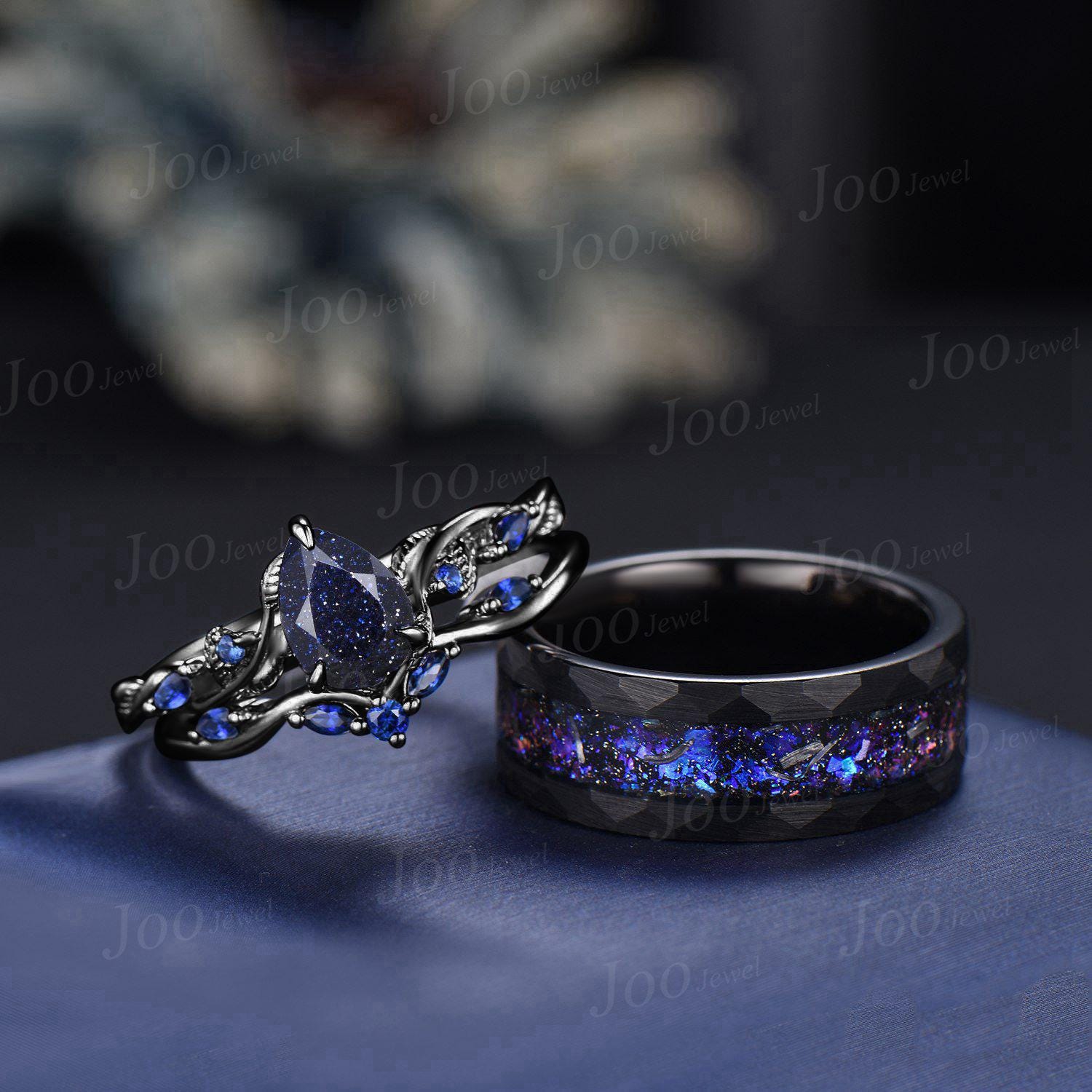 2pcs Galaxy Nebula Couple Ring Set Nature Inspired Pear Blue Sandstone Ring His and Hers Foil Wedding Ring Mens Black Tungsten Matching Ring