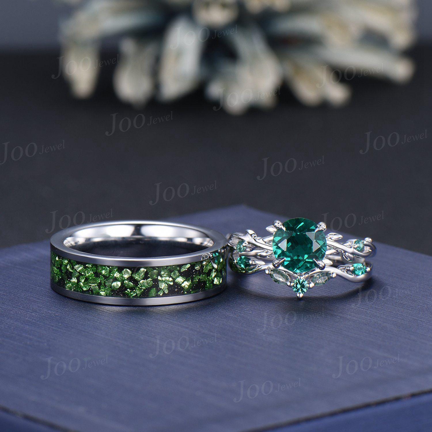 2pcs Round Green Emerald Branch Couples Ring-His and Hers Wedding Band-Sterling Silver Ring-Nature Inspired Matching Band-Anniversary Rings