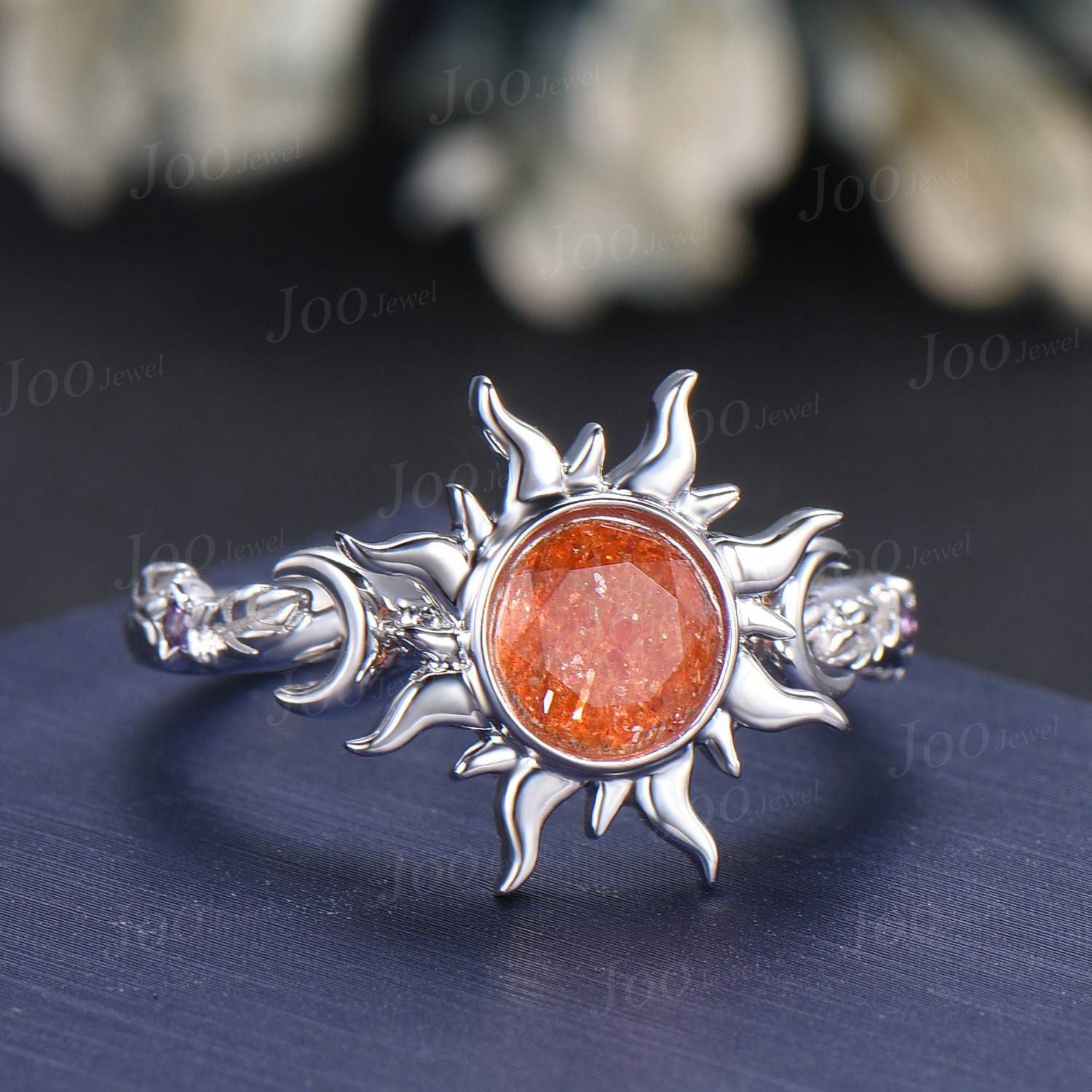 6mm Round Cut Natural Sunstone Sun Engagement Ring Unique Celestial Wedding Ring Moon Star & Sun Genuine Sunstone Jewelry Proposal Ring Gift