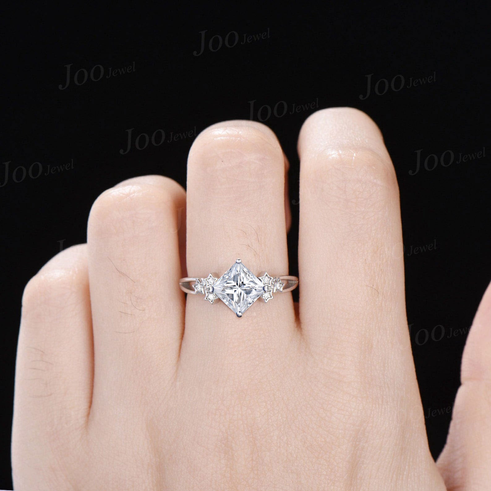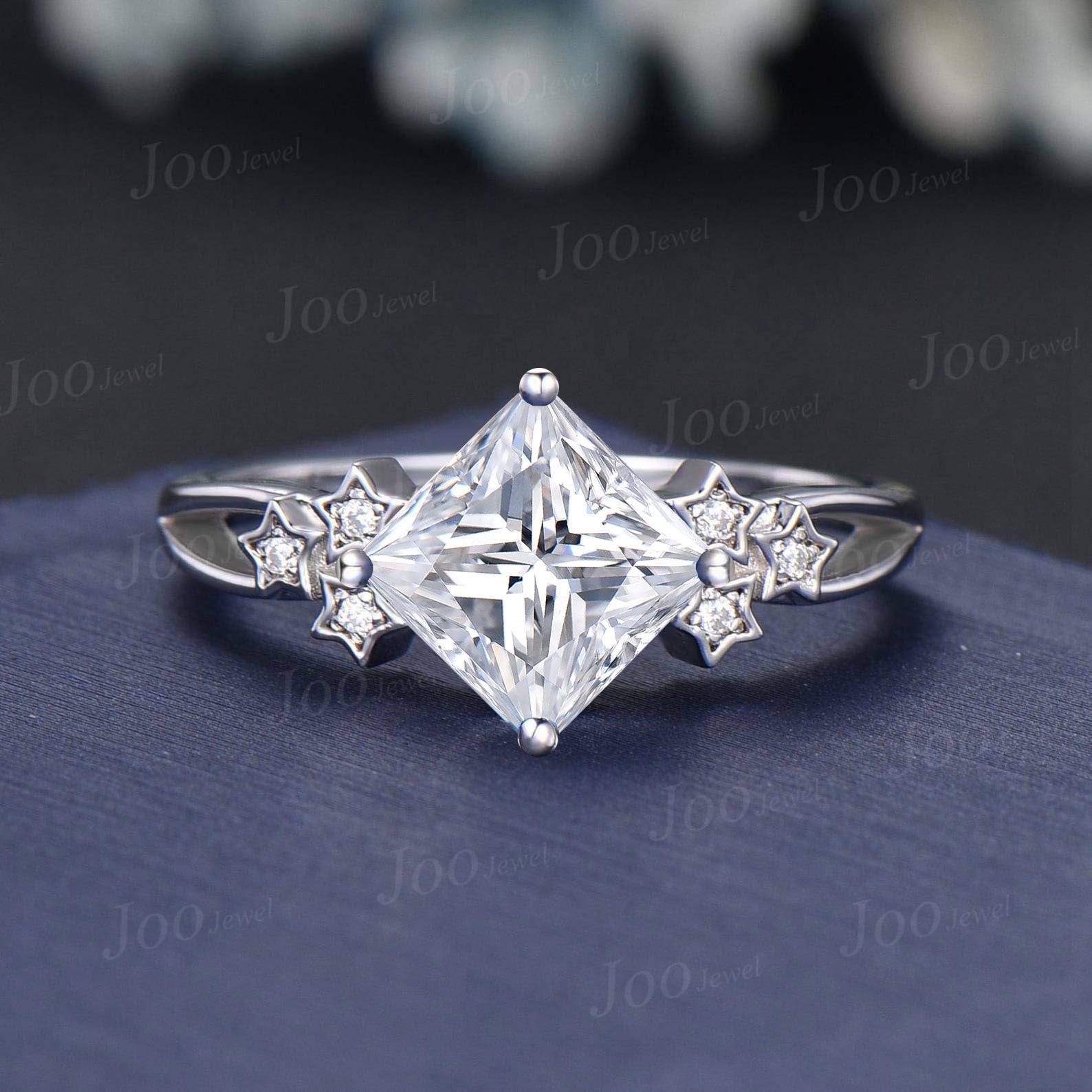 7mm Princess Cut Moissanite Diamond Engagement Ring 14K White Gold Cluster Star Wedding Ring Split Shank Band Women Unique Anniversary Gift