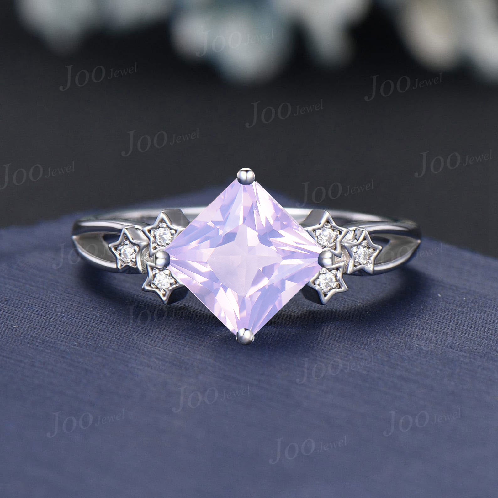 7mm Princess Cut Natural Lavender Amethyst Diamond Engagement Ring 14K White Gold Cluster Amethyst Star Wedding Ring Split Shank Band Women