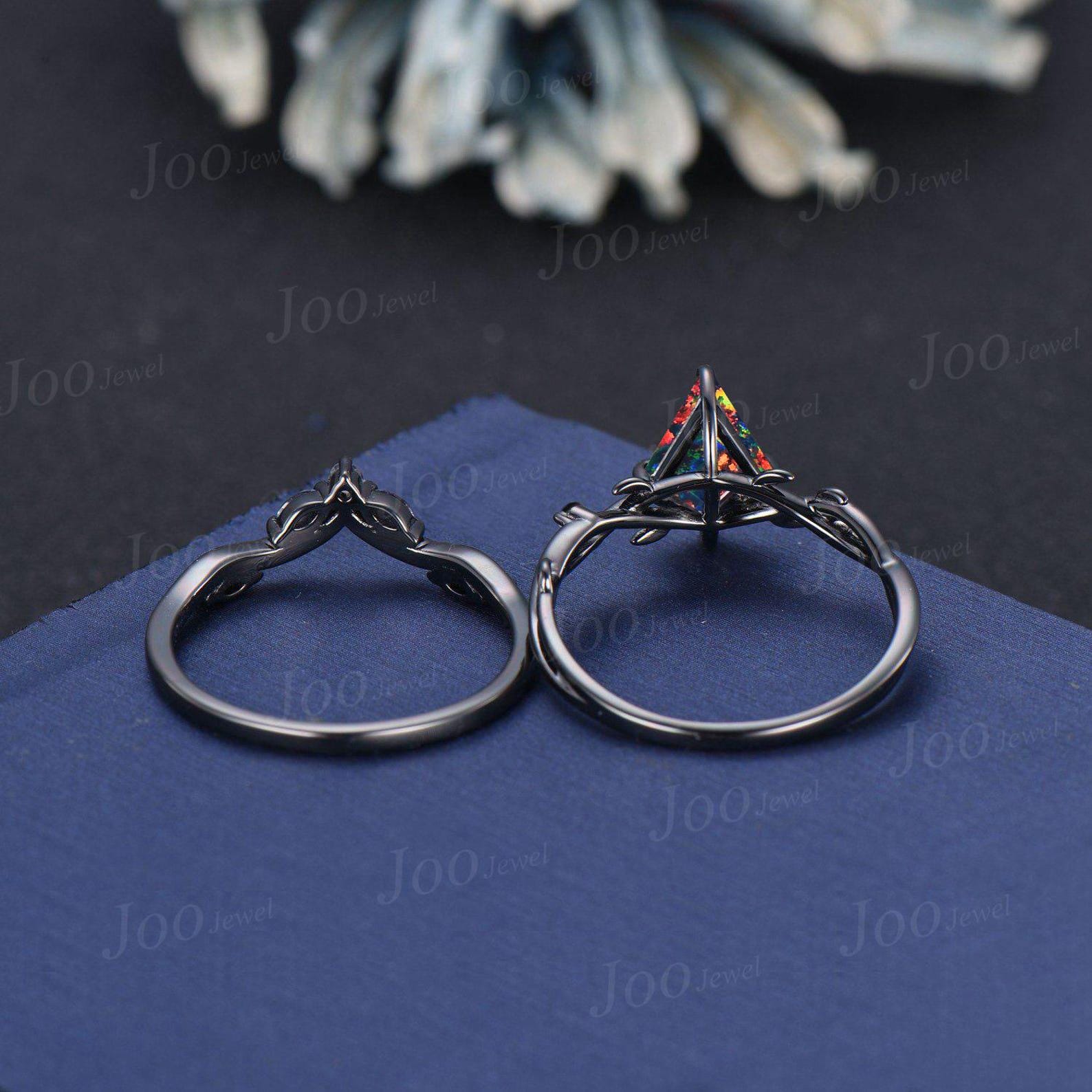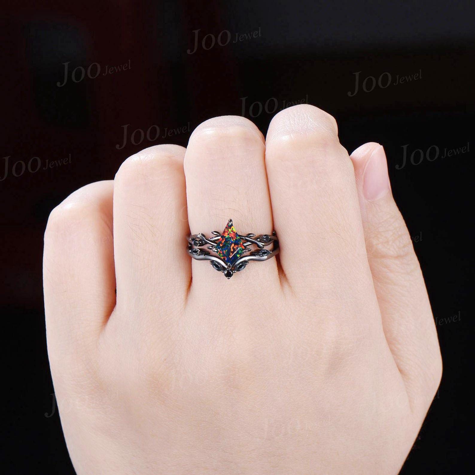 Antique Kite Cut Black Fire Opal Engagement Ring Set Twig Vine Black Onyx Wedding Ring Kite Bridal Set Gothic Black Opal Ring Set for Women