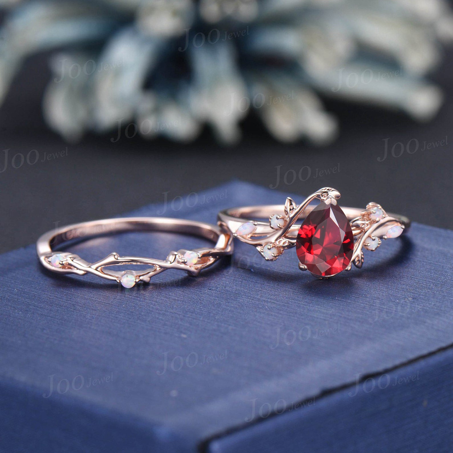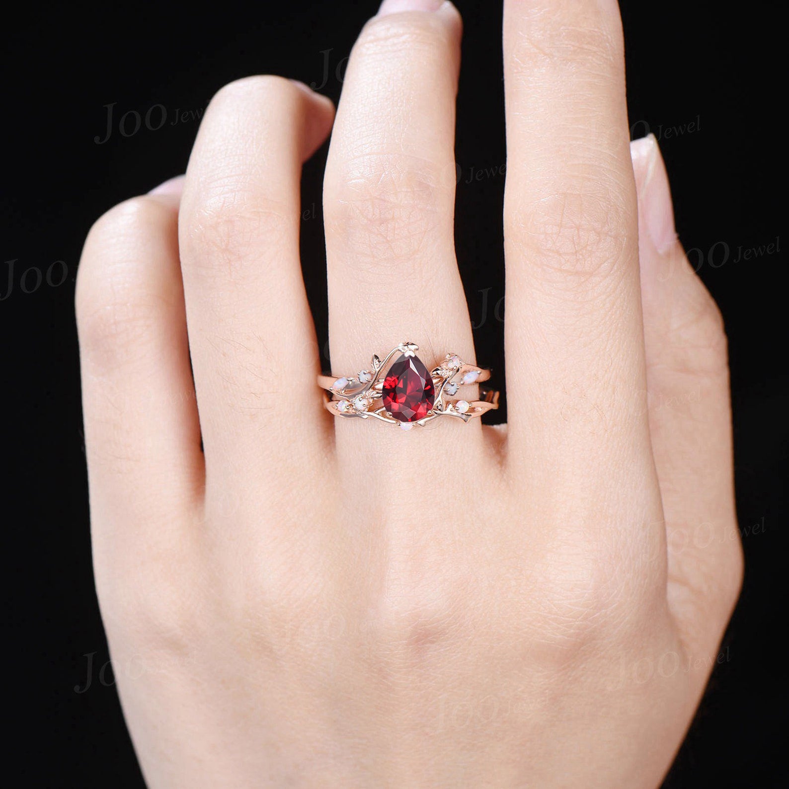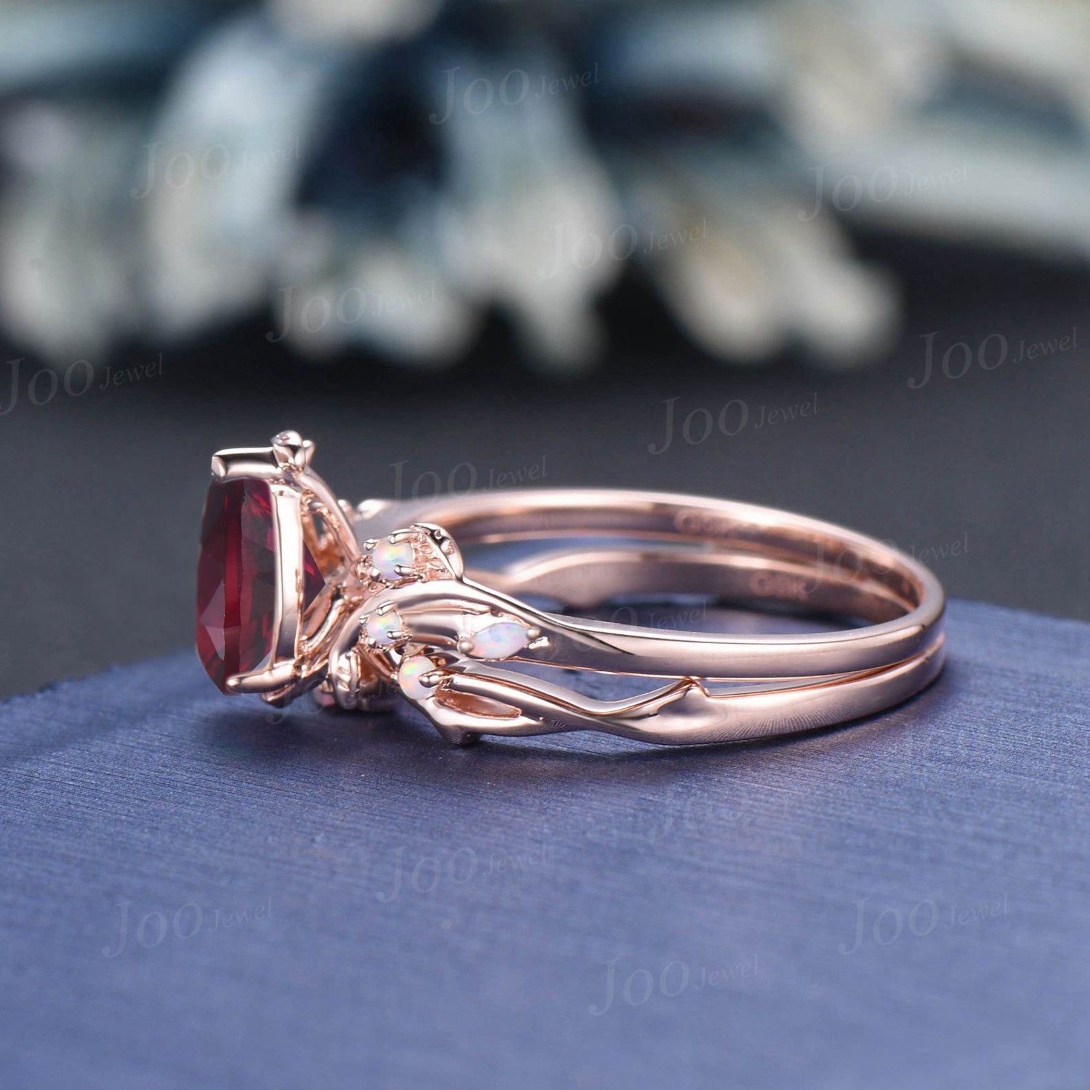 Cluster Ruby Wedding Ring 1.25ct Teardrop Cut Red Ruby Opal Engagement Ring Set Unique Leaf Vine Promise Ring for Women July Birthstone Gift