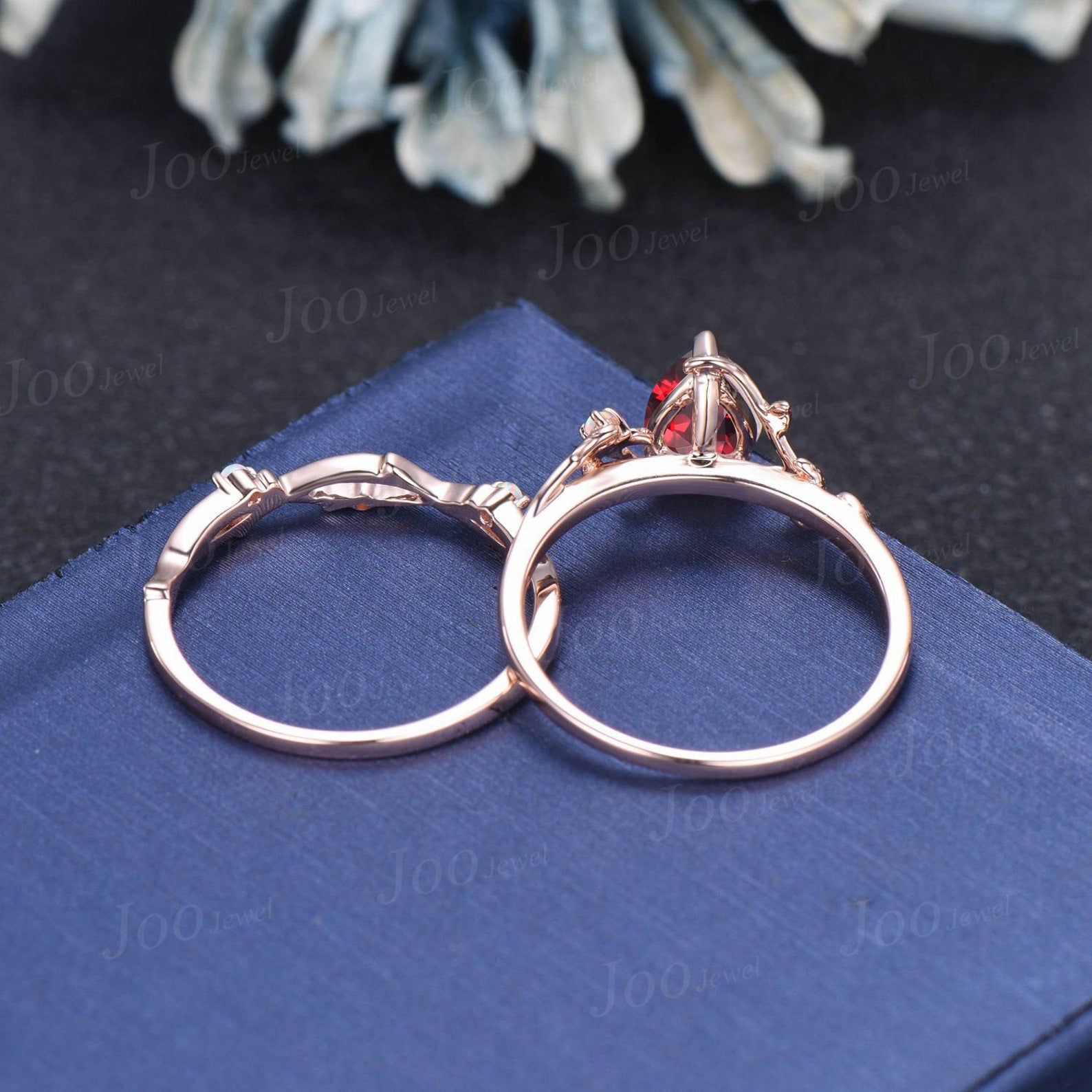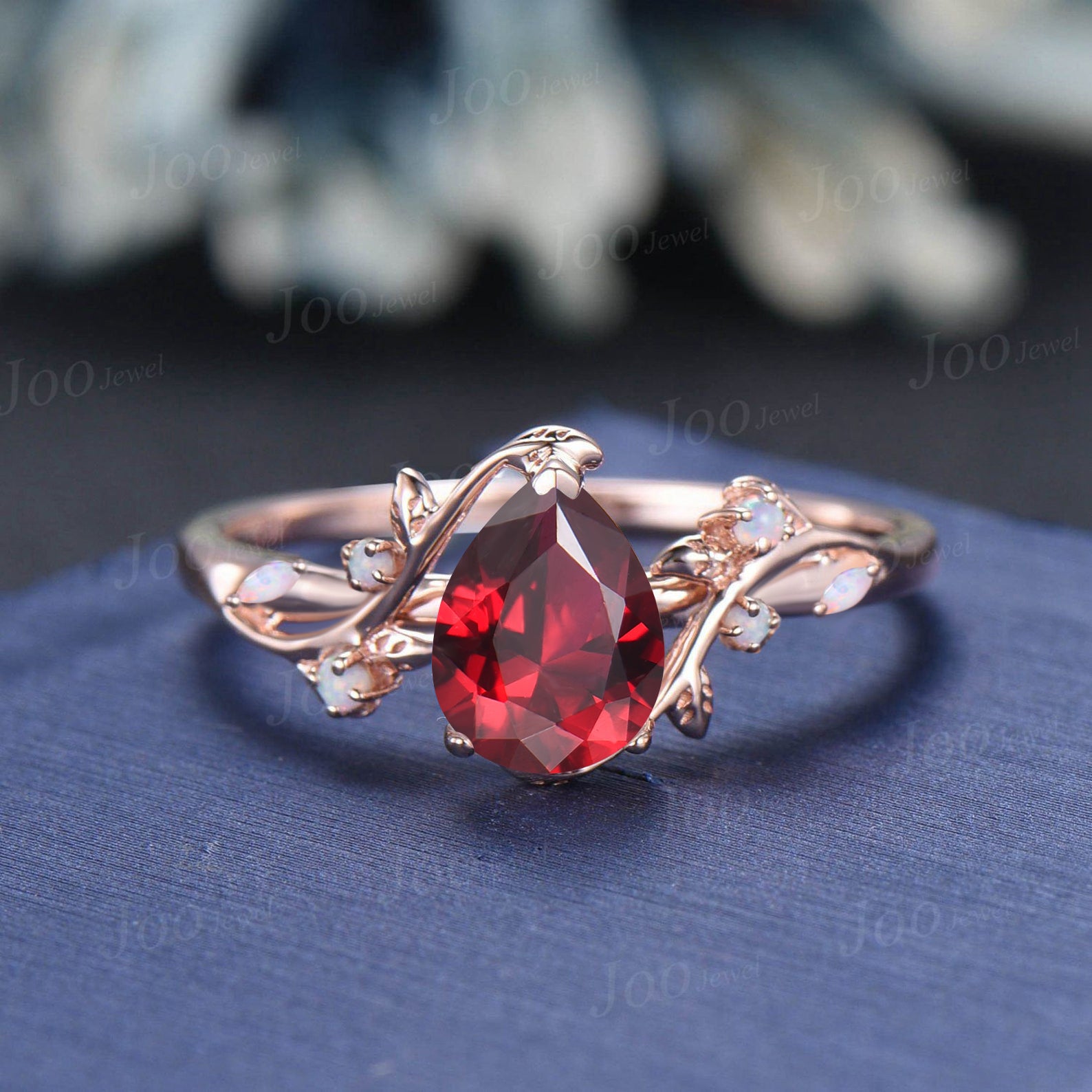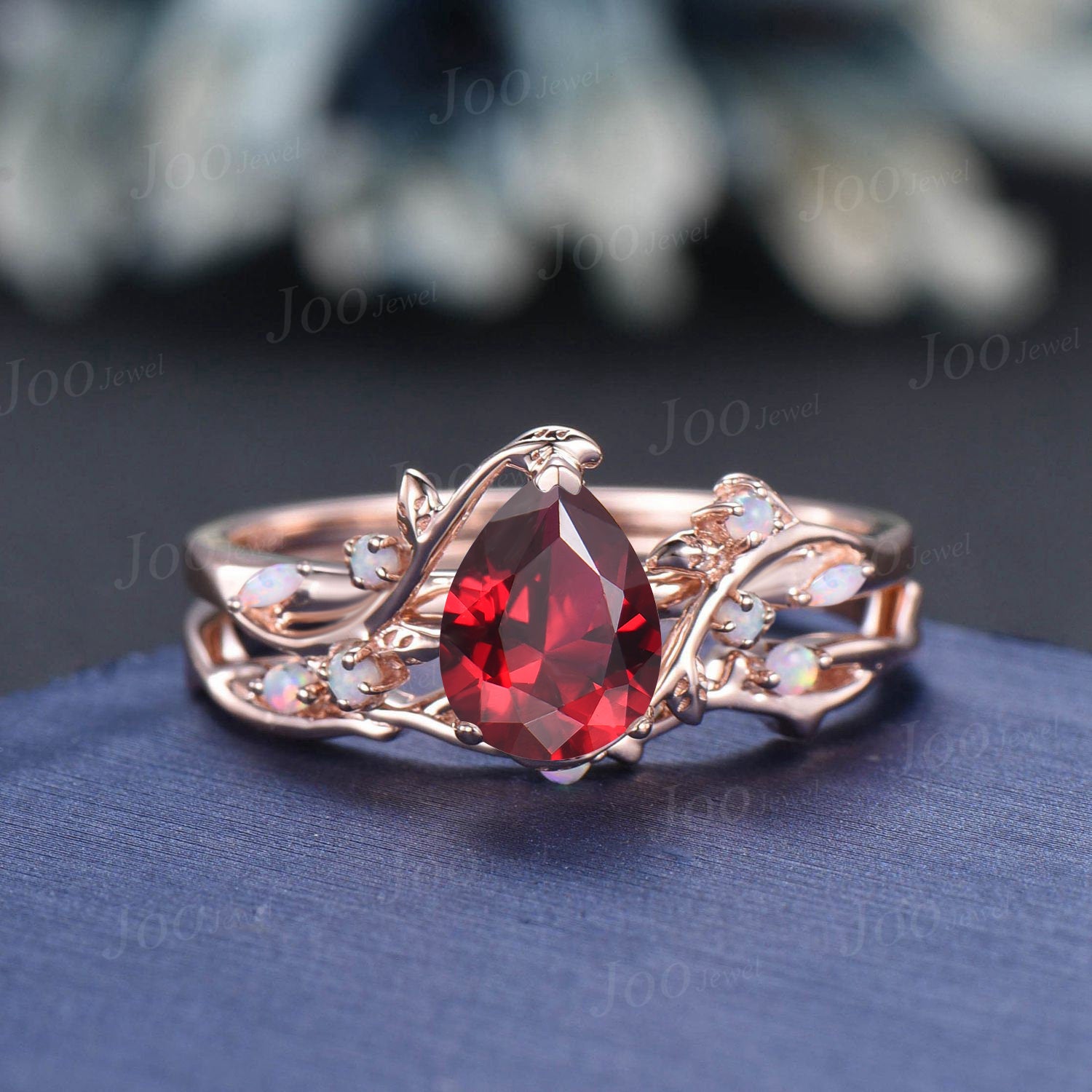 Cluster Ruby Wedding Ring 1.25ct Teardrop Cut Red Ruby Opal Engagement Ring Set Unique Leaf Vine Promise Ring for Women July Birthstone Gift