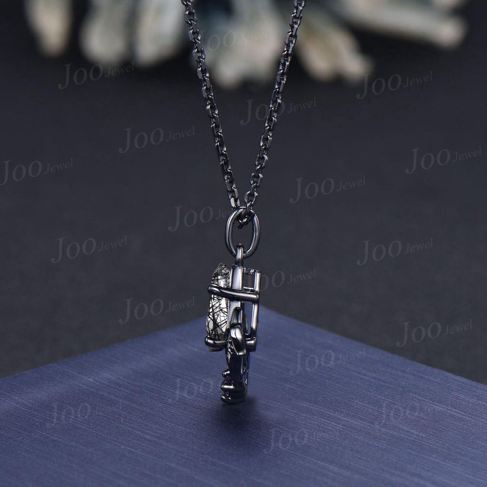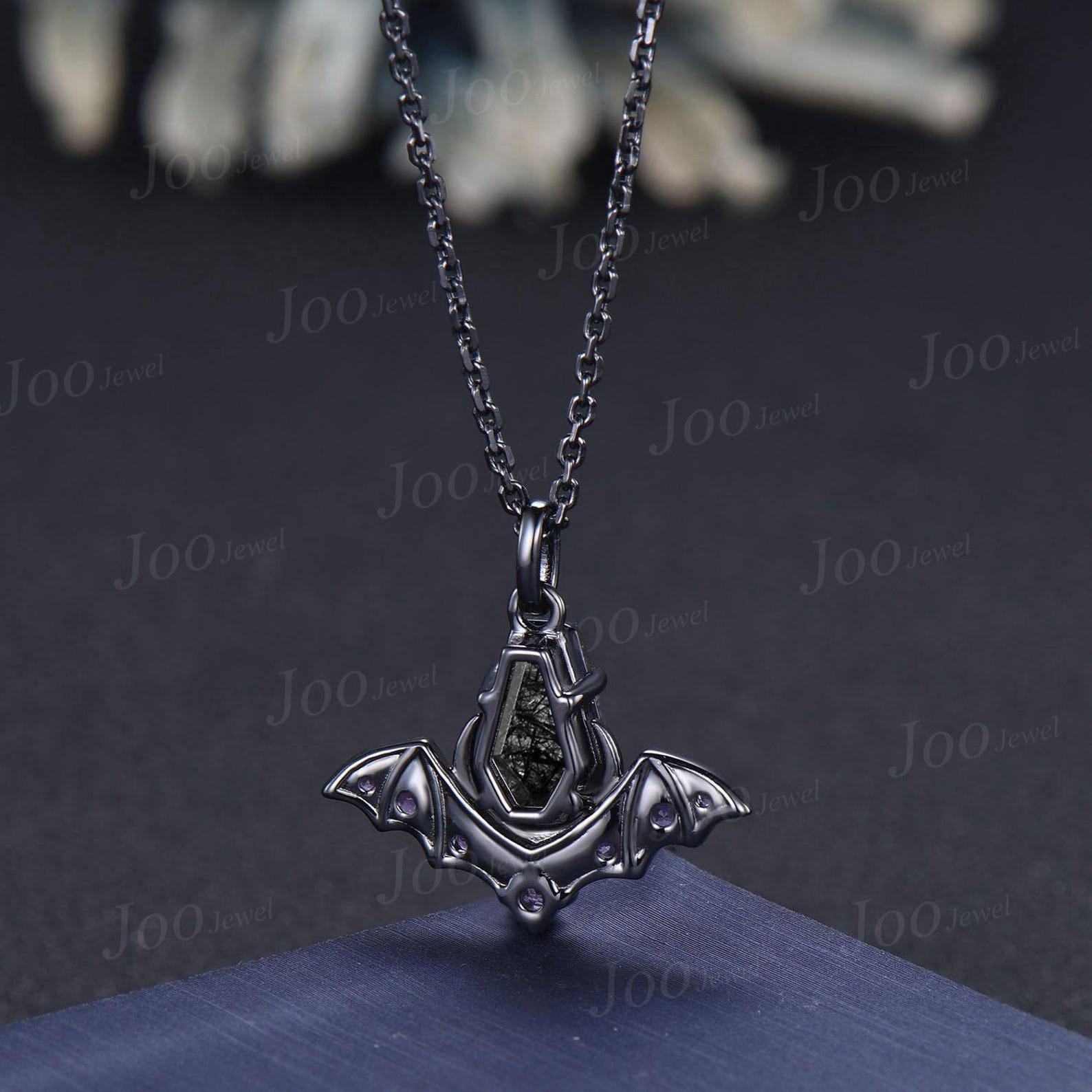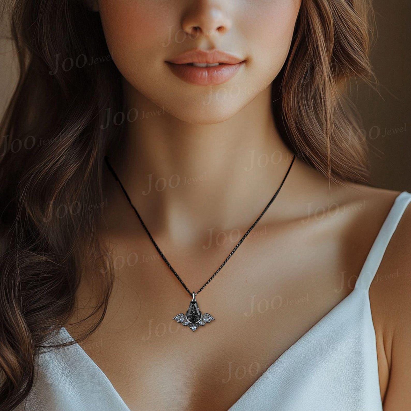Coffin Cut Natural Black Rutilated Quartz Crescent Moon Bat Pendant Necklace Natural Black Rutilated Quartz Bat Wing Gothic Retro Necklaces