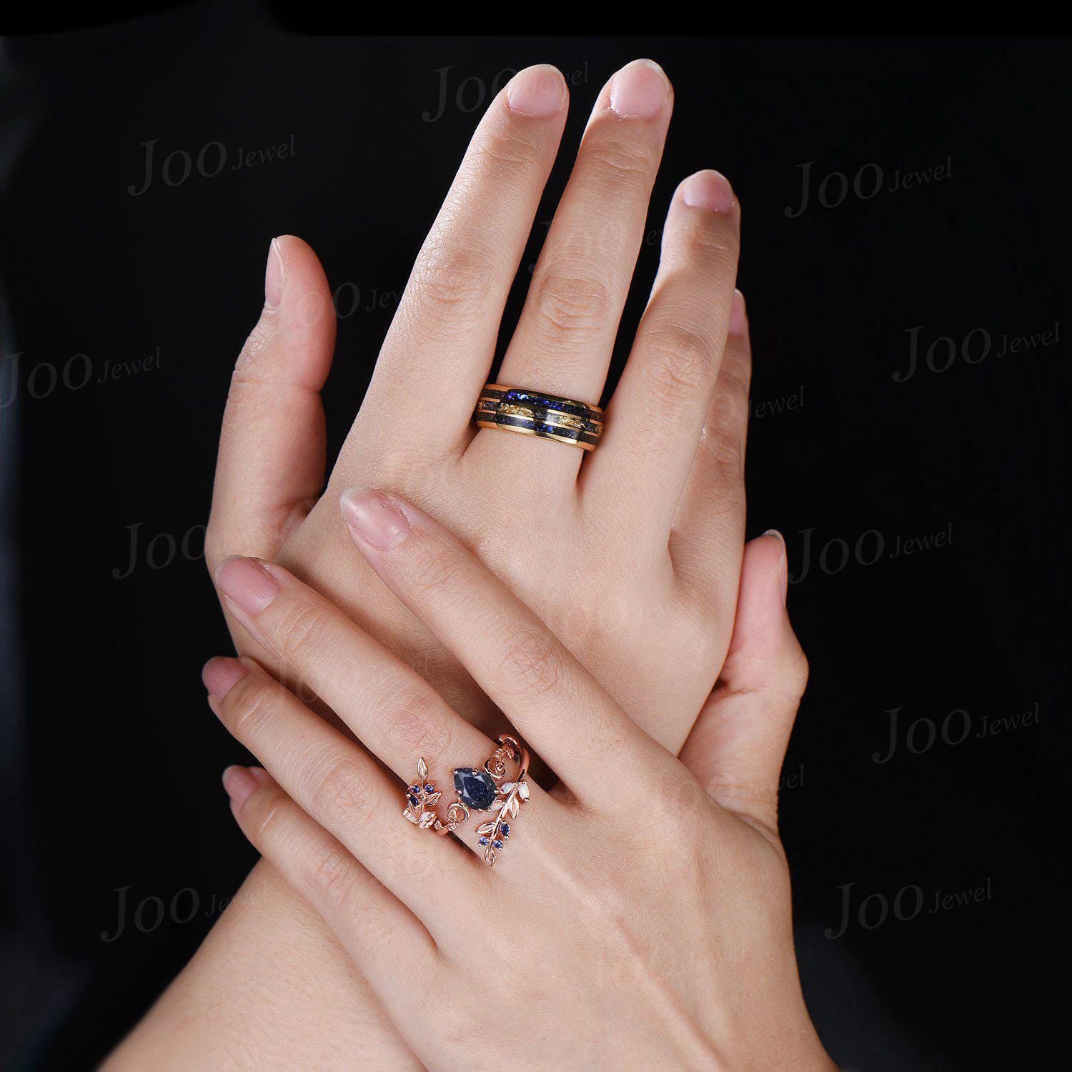 Galaxy Blue Sandstone Couple Wedding Ring Set | Pear Bridal Ring | Enhancer Leaf Band | Tungsten Nebula Promise Ring Men | Anniversary Gift