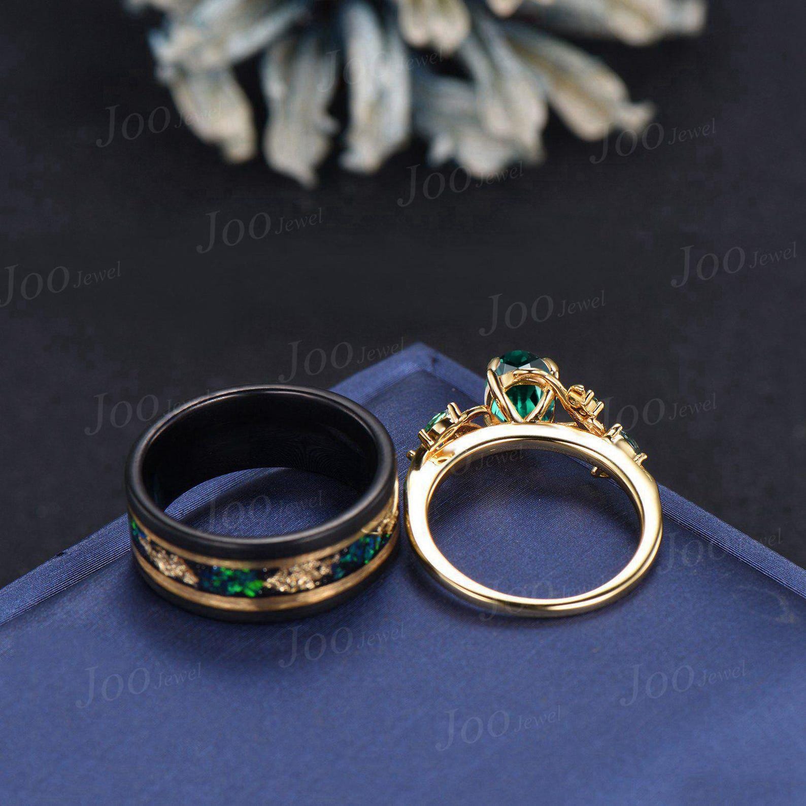 Green Emerald & Meteorite Gold Leaf Couples Ring-His and Hers Wedding Band-Gold Ring Set-Matching Nature Couples Unique Vintage Promise Ring