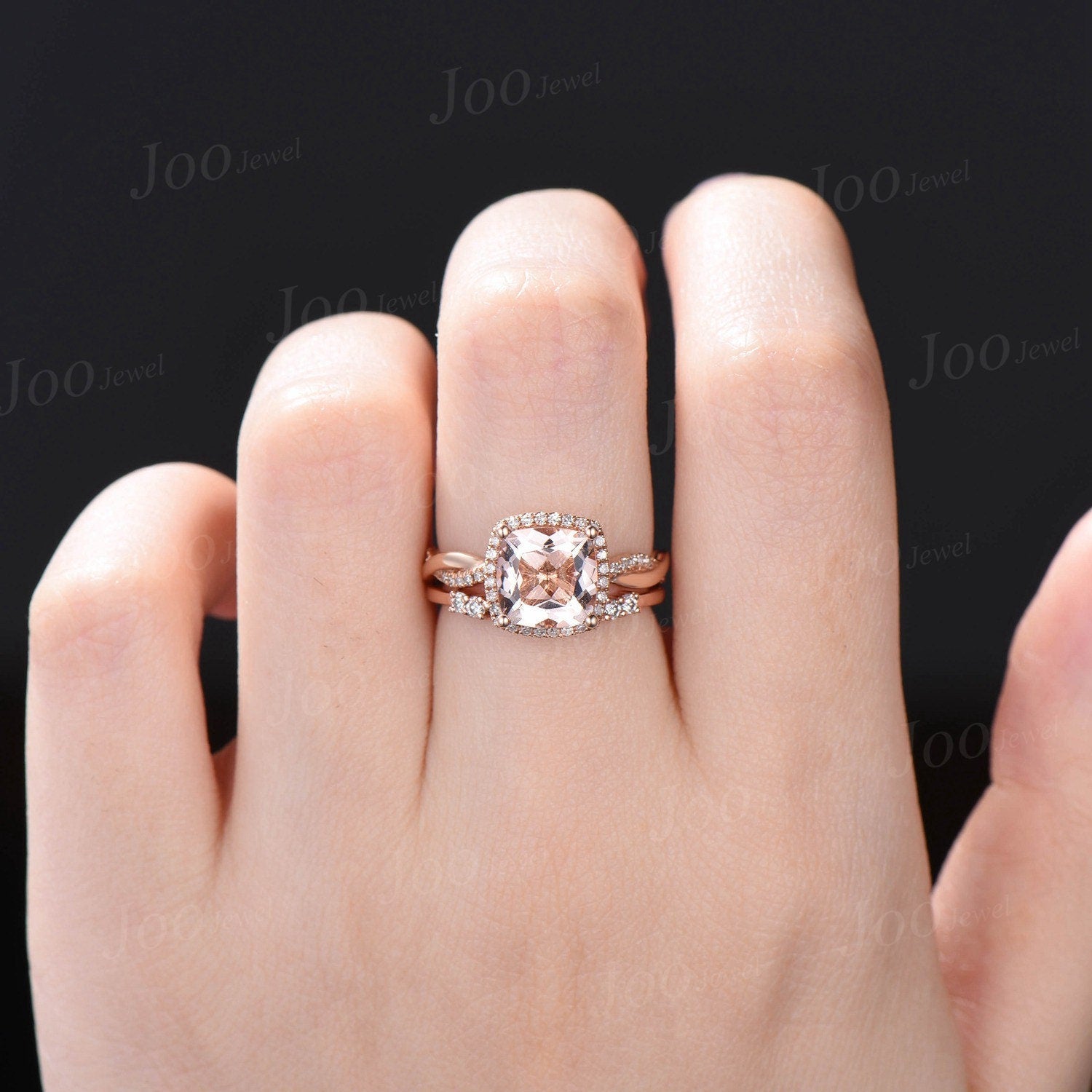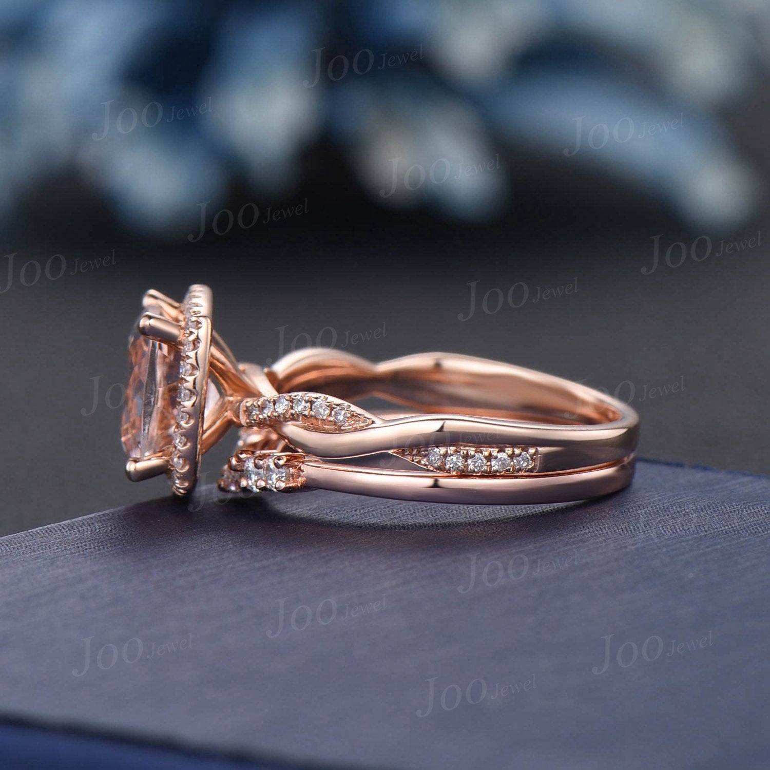 Infinity Morganite Bridal Set 10K Rose Gold Cushion Natural Peach Morganite Diamond Halo Wedding Ring Twist Half Eternity Anniversary Gifts