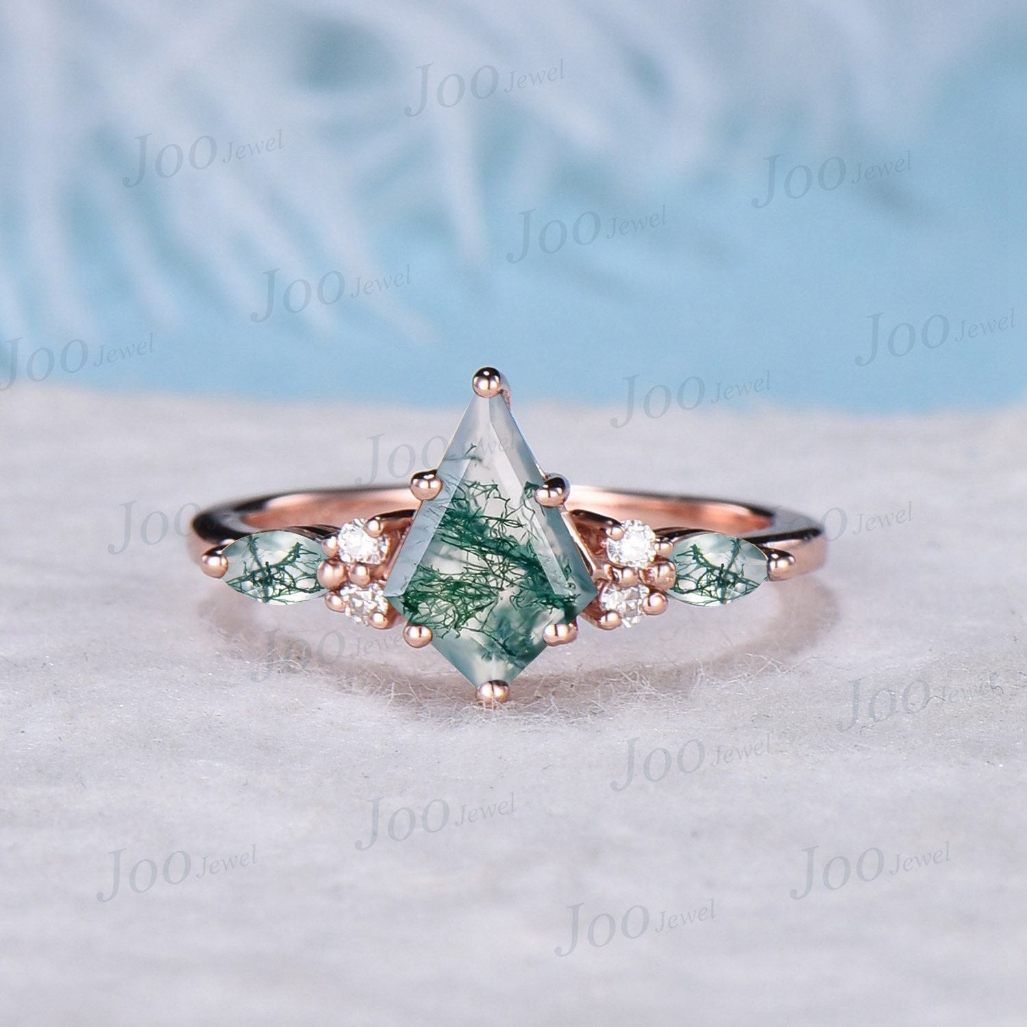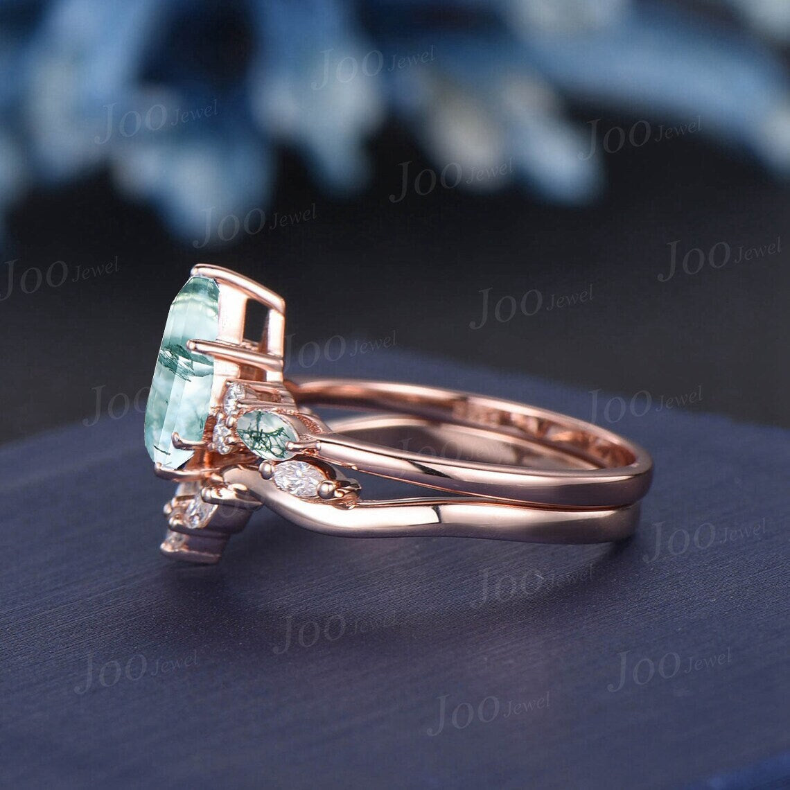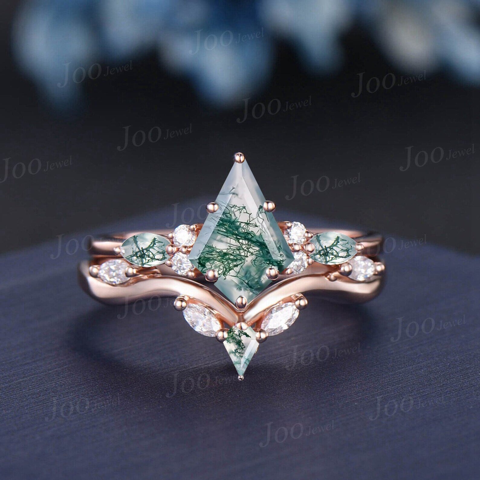 Kite Natural Green Moss Agate Ring Set Rose Gold Unique Engagement Ring Women Dainty Moissanite Bridal Ring Personalized Anniversary Gifts