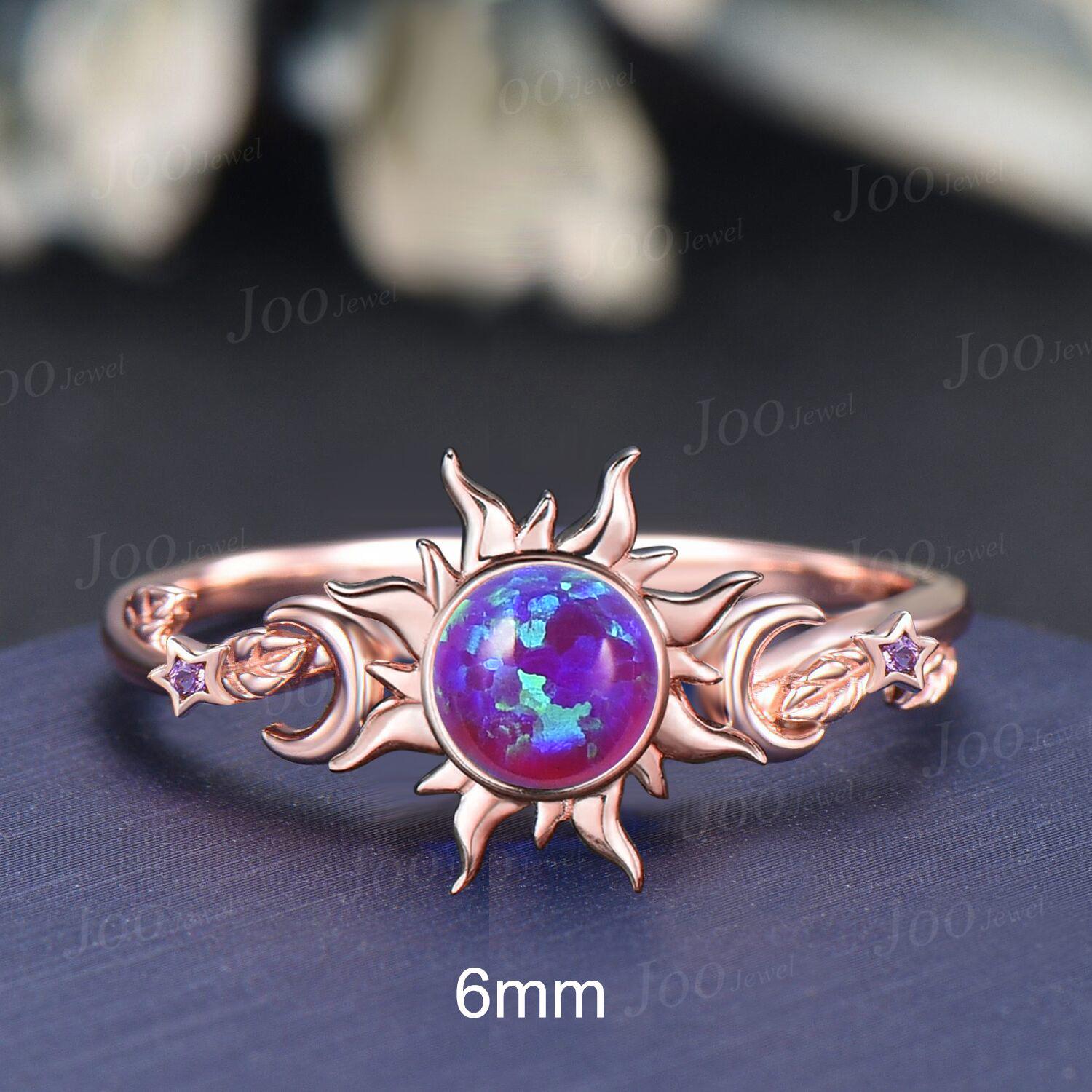 Lavender Purple Opal Engagement Ring Round Amethyst Opal Sun Moon Wedding Rings Unique Anniversary Gifts Leaf Bridal Promise Ring for Women