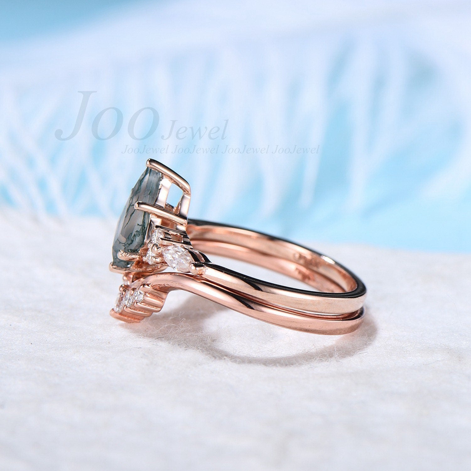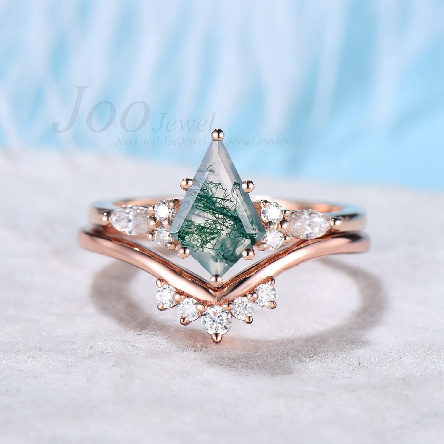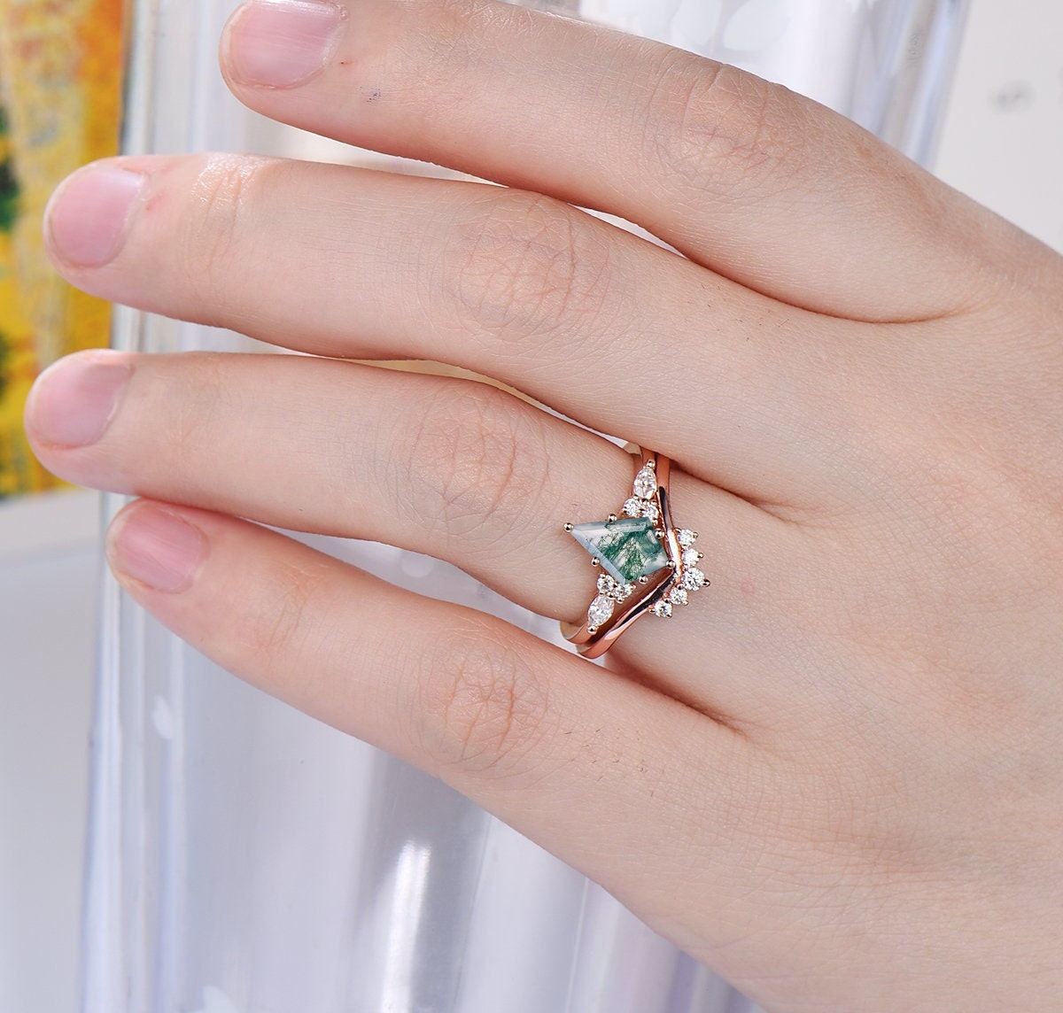 Natural Green Moss Agate Ring Set Vintage Kite Engagement Ring Set Unique Kite Cut Bridal Set Crystal Healing Gift Unique Wedding Ring Set