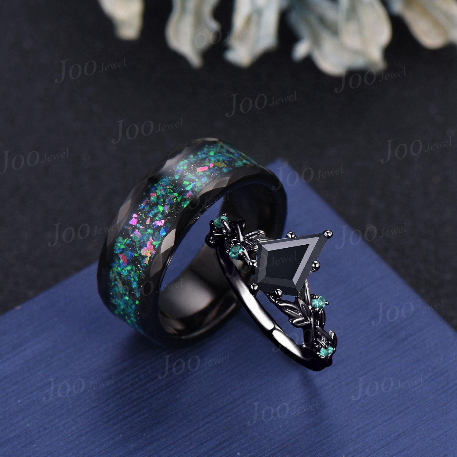 Natural Kite Black Onyx Tungsten Wedding Ring Set Men Green Emerald Couple Promise Rings Marriage Anniversary Gift Outer Space Galaxy Band