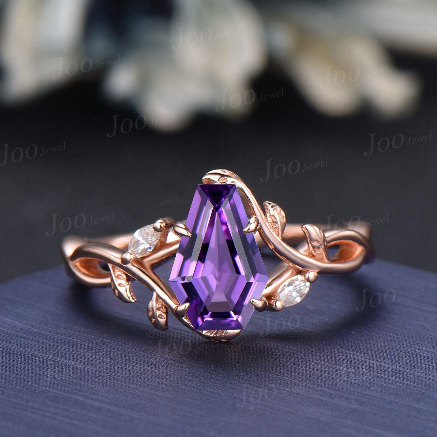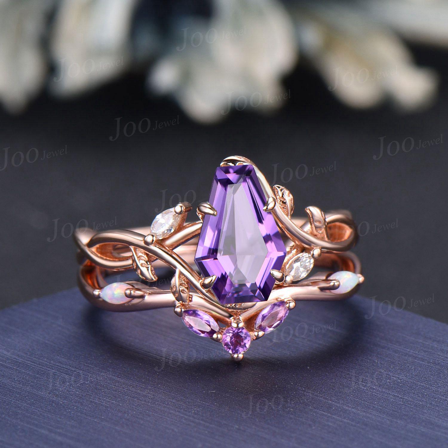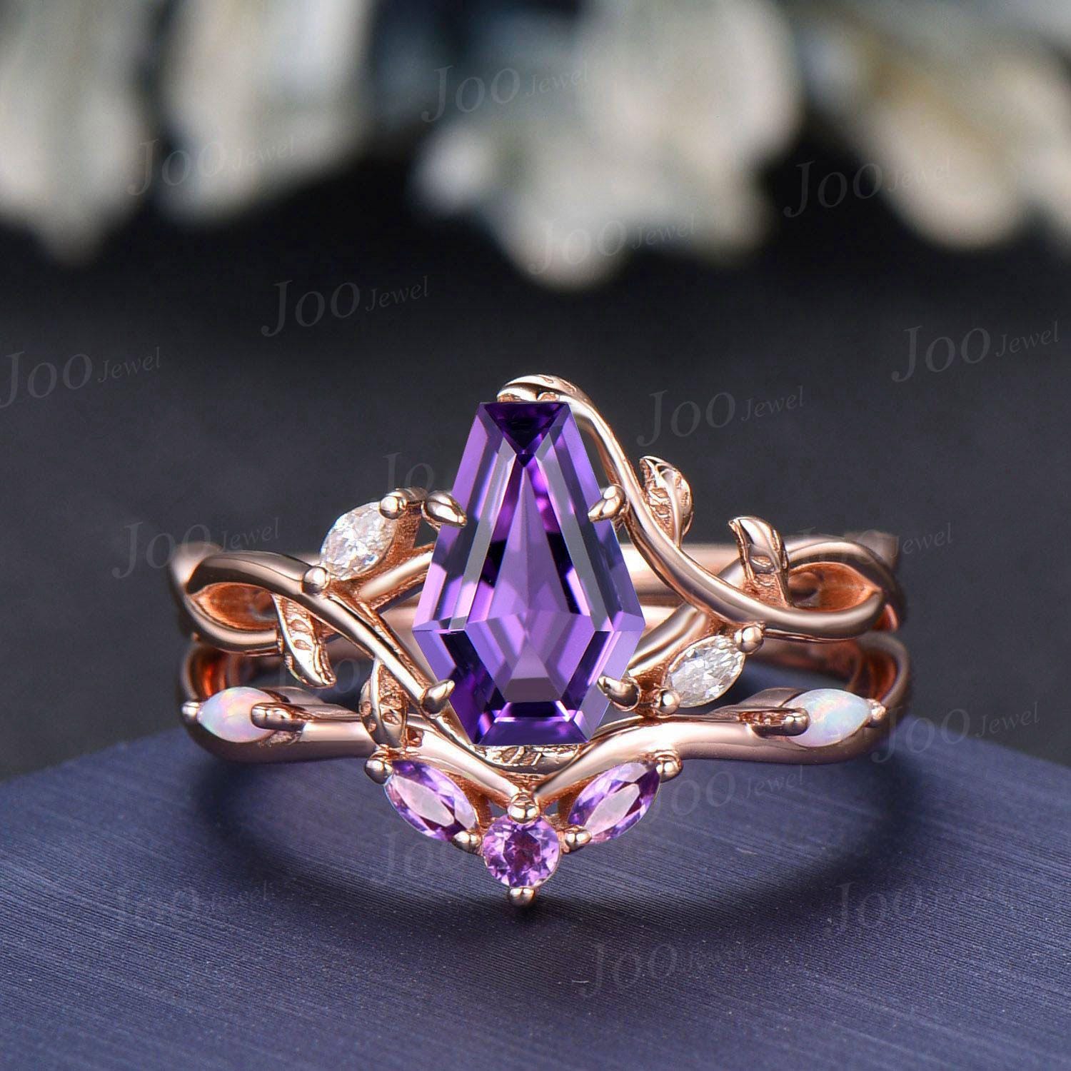 Nature Inspired Coffin Cut Natural Genuine Amethyst Bridal Ring Set Infinity Leaf Engagement Ring
