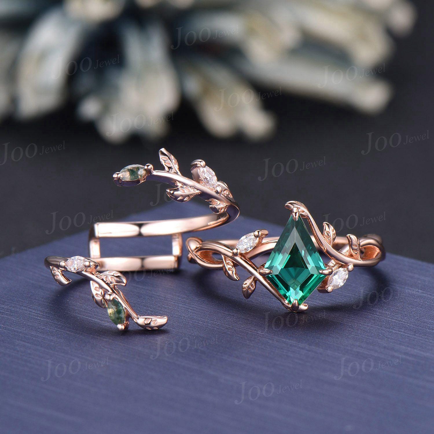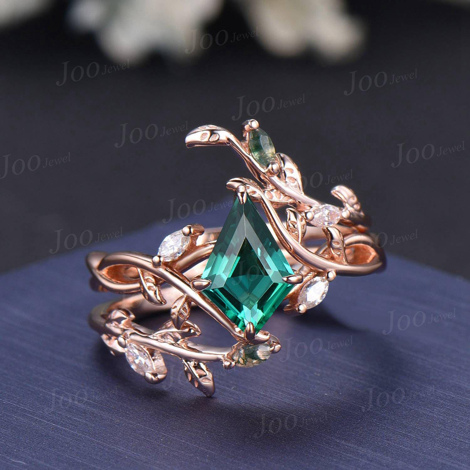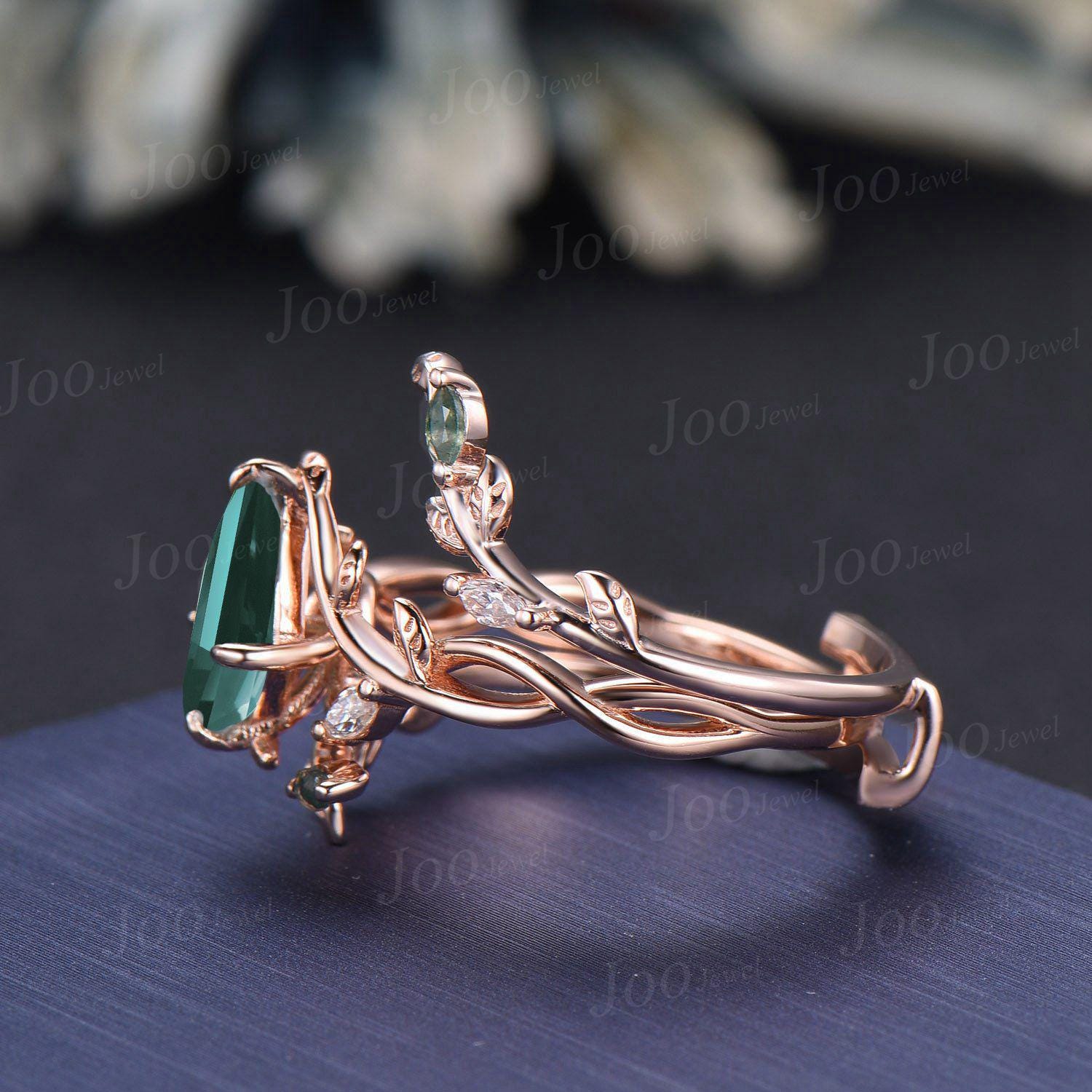 Nature Inspired Kite Cut Green Emerald Twisted Infinity Wedding Ring Enhancer Moss Agate Bypass Wedding Band Unique Non-Traditional Jewelry