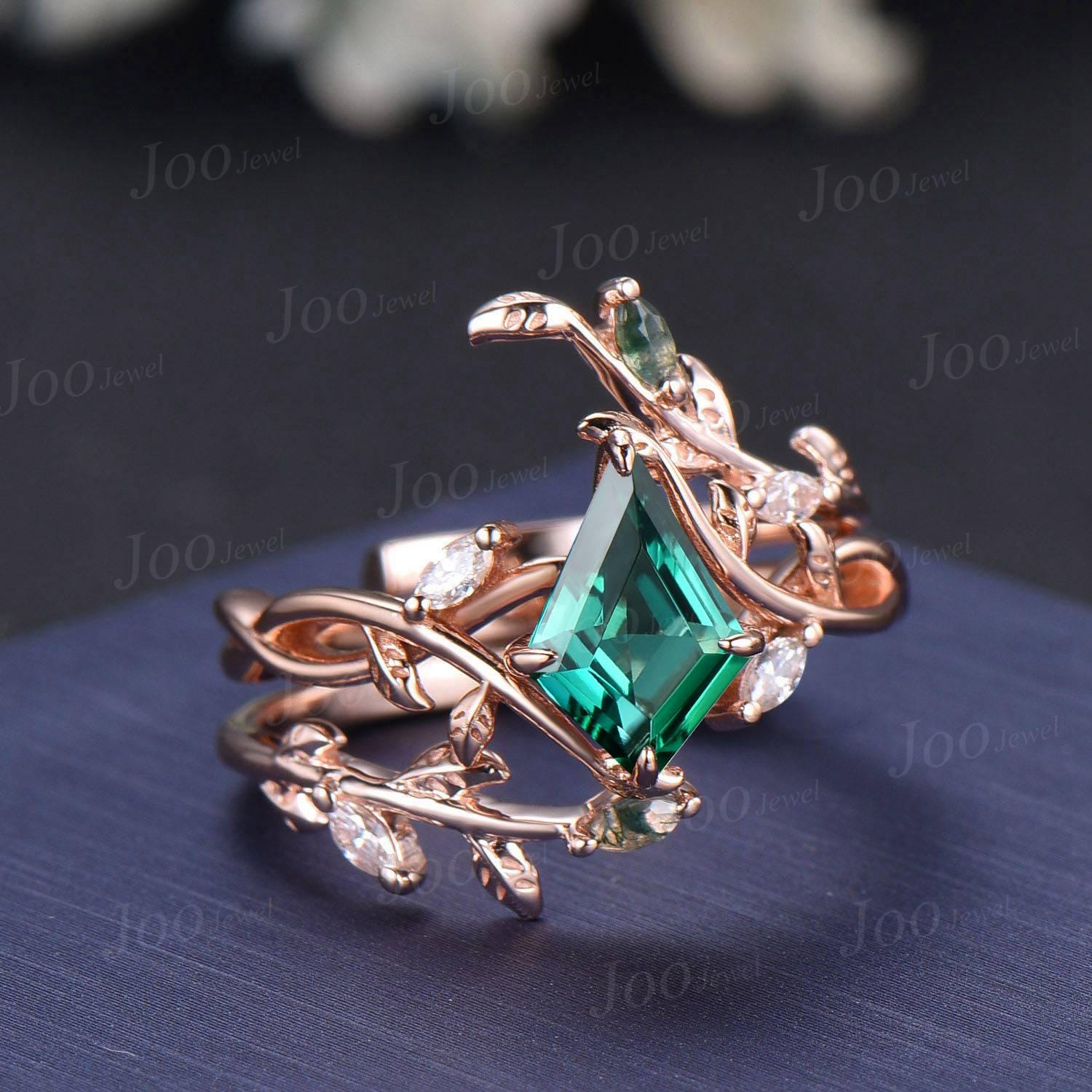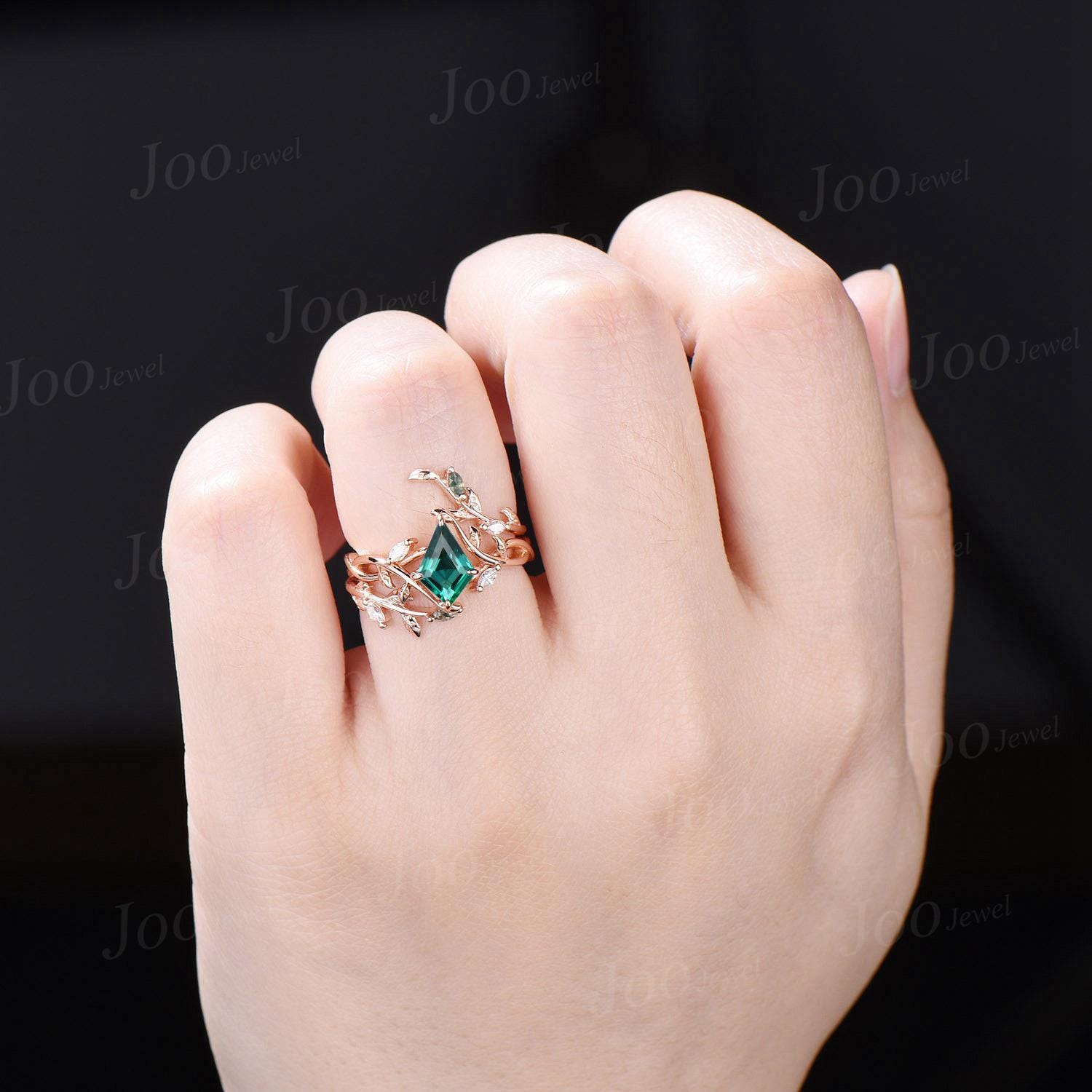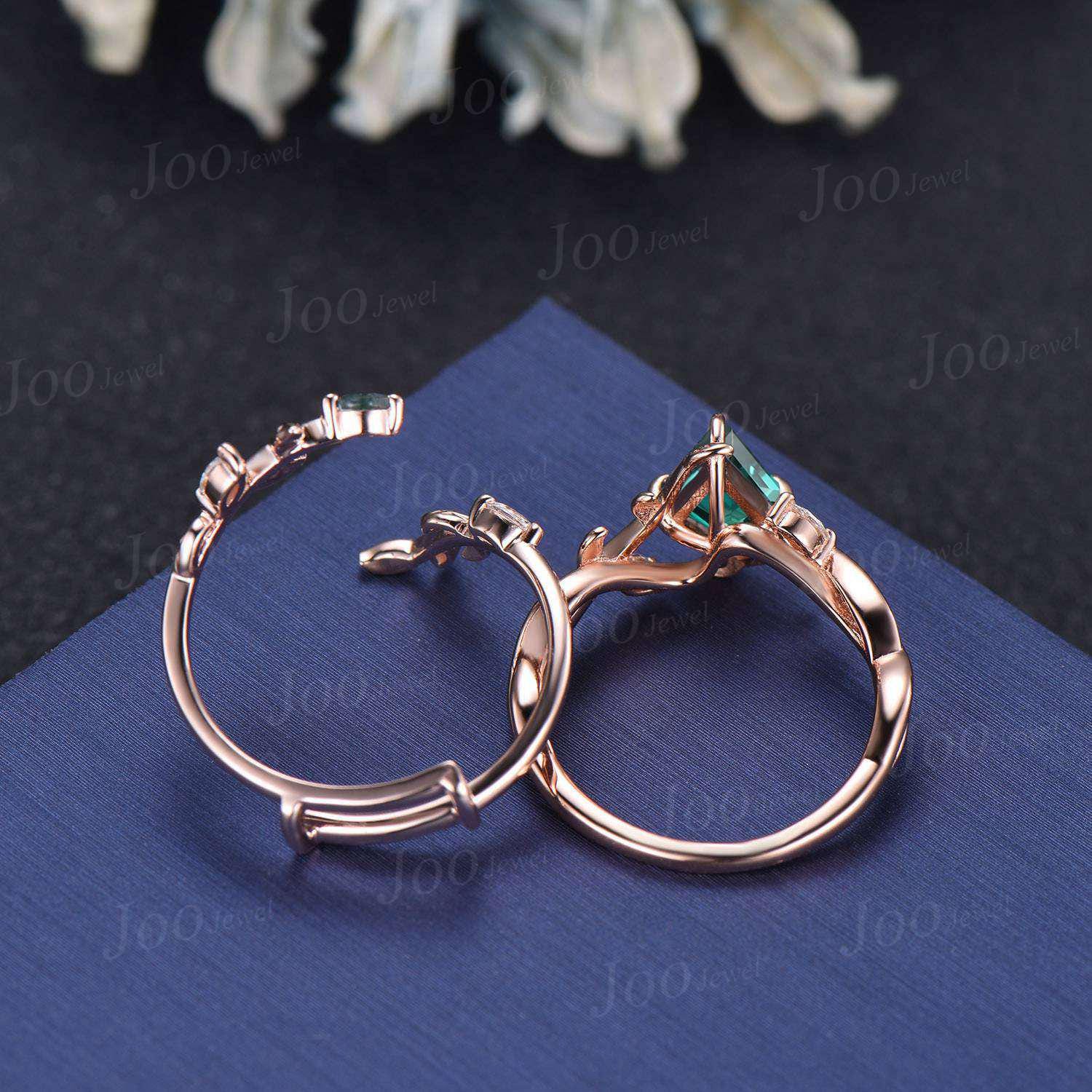 Nature Inspired Kite Cut Green Emerald Twisted Infinity Wedding Ring Enhancer Moss Agate Bypass Wedding Band Unique Non-Traditional Jewelry