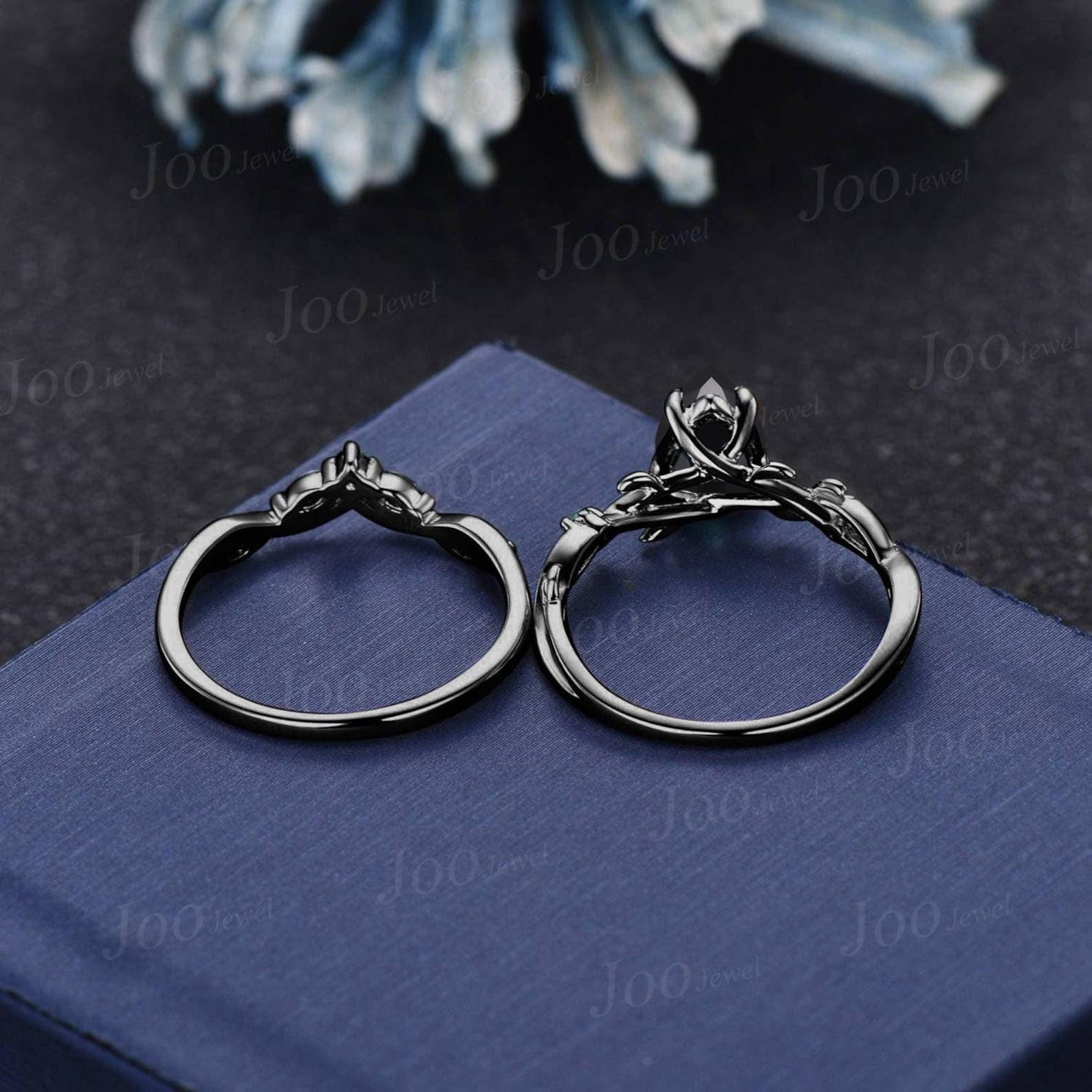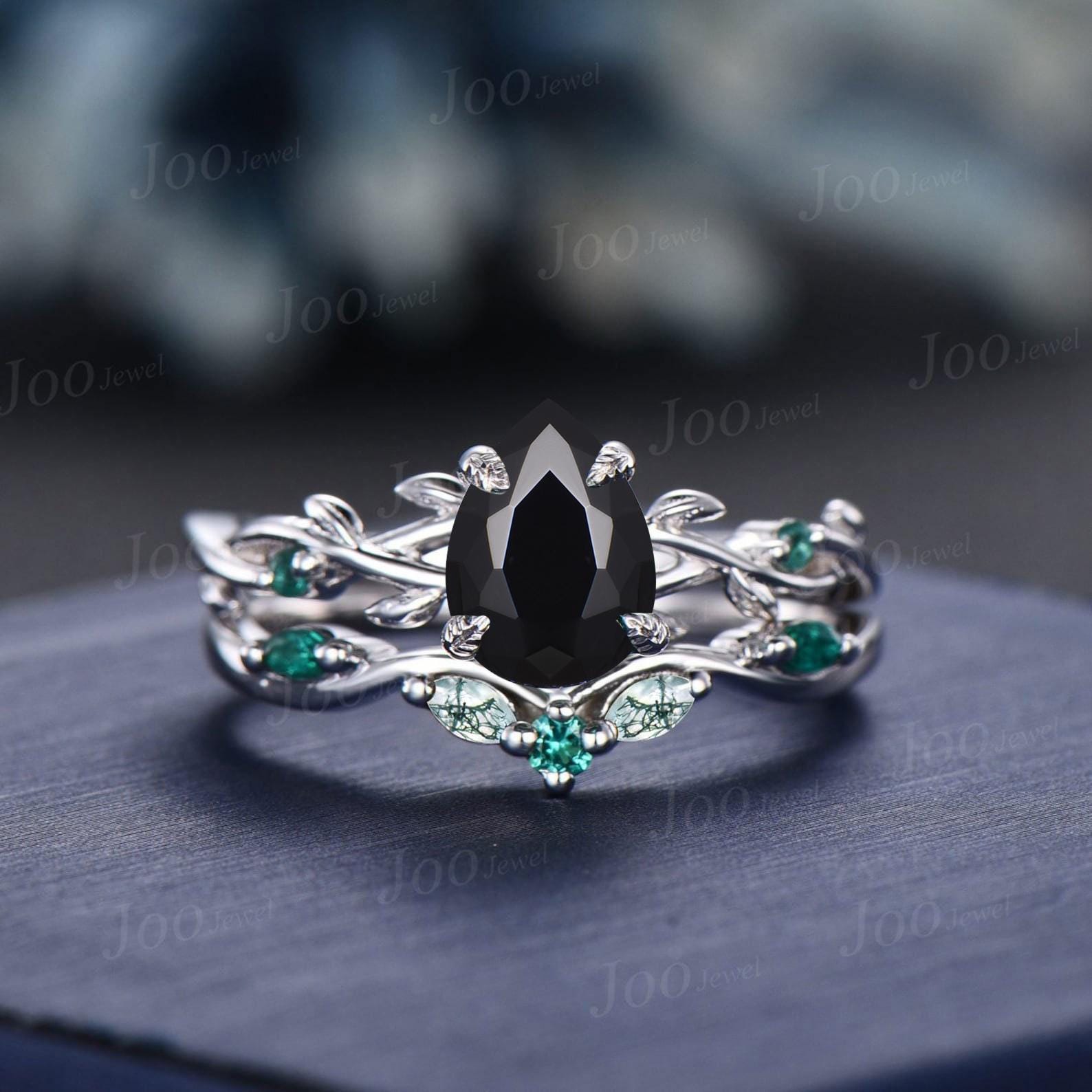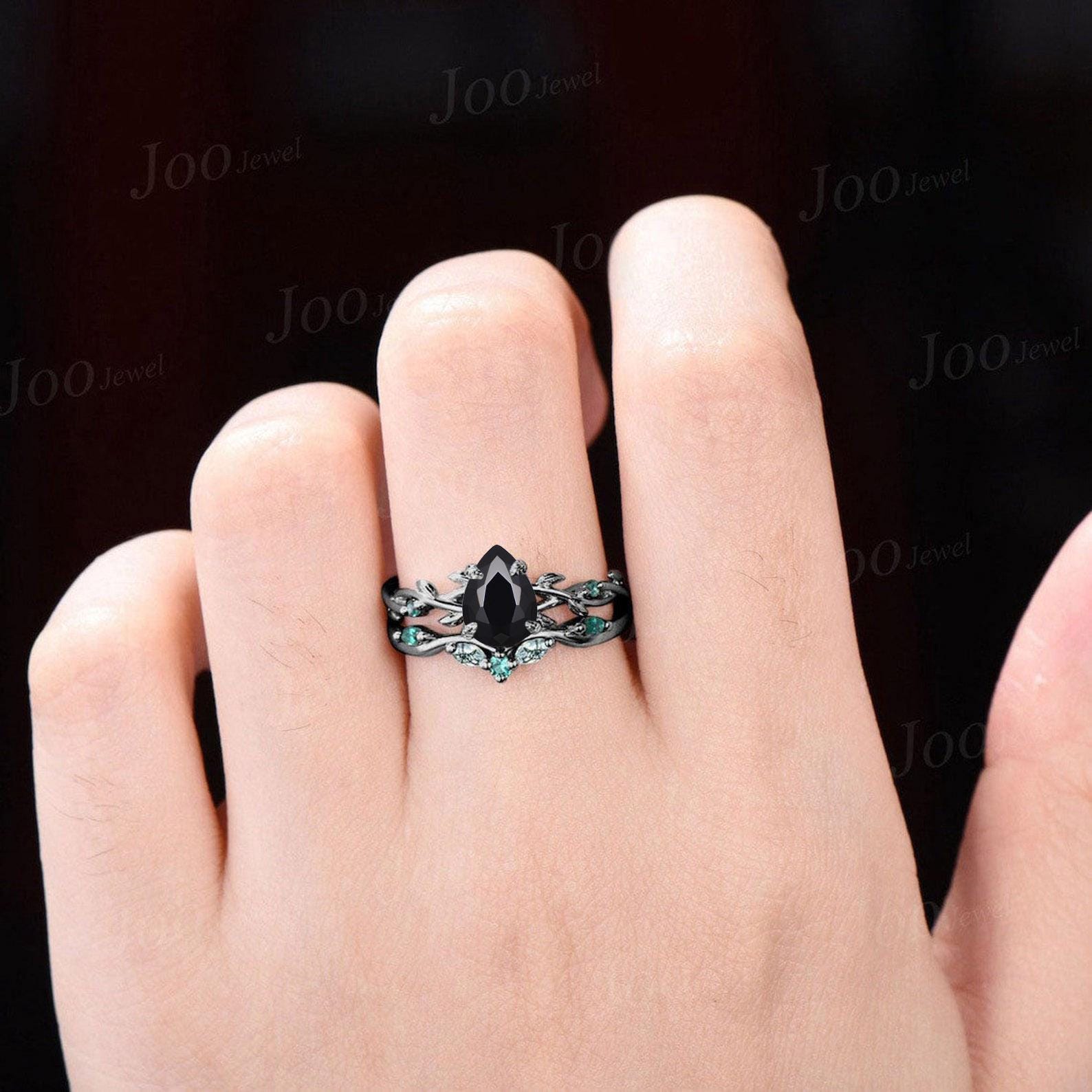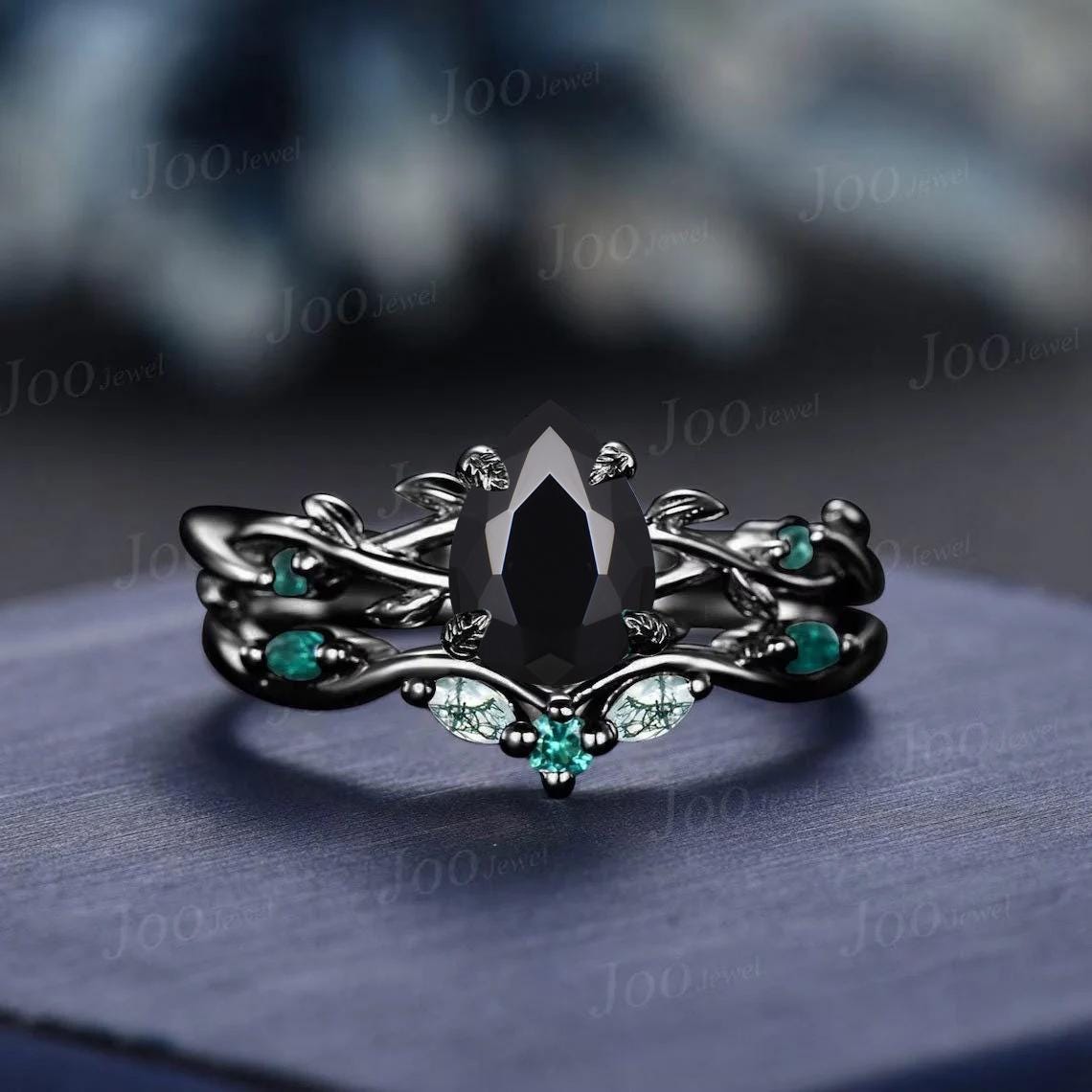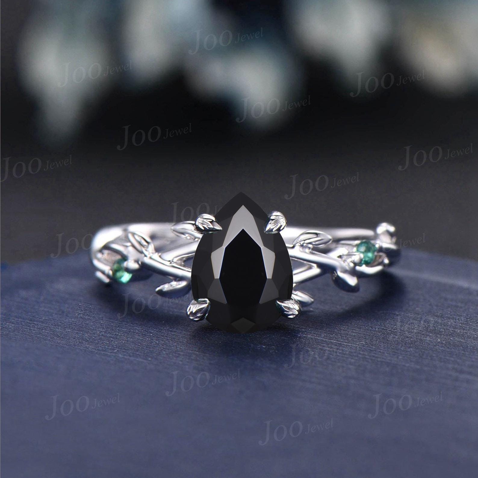 Pear Cut Natural Black Onyx Engagement Ring Black Gold Ring Twisted Vine Emerald Agate Wedding Ring Nature Inspired Ring Bridal Promise Ring