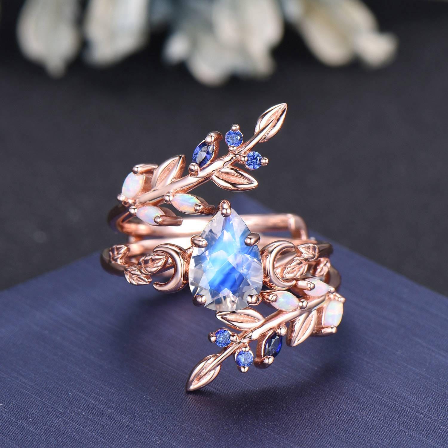 Pear Cut Natural Moonstone Solitaire Bridal Ring 14K Solid Gold Enchanted Vine Bypass Wedding Band Opal Blue Sapphire Leaf Moon Ring Women
