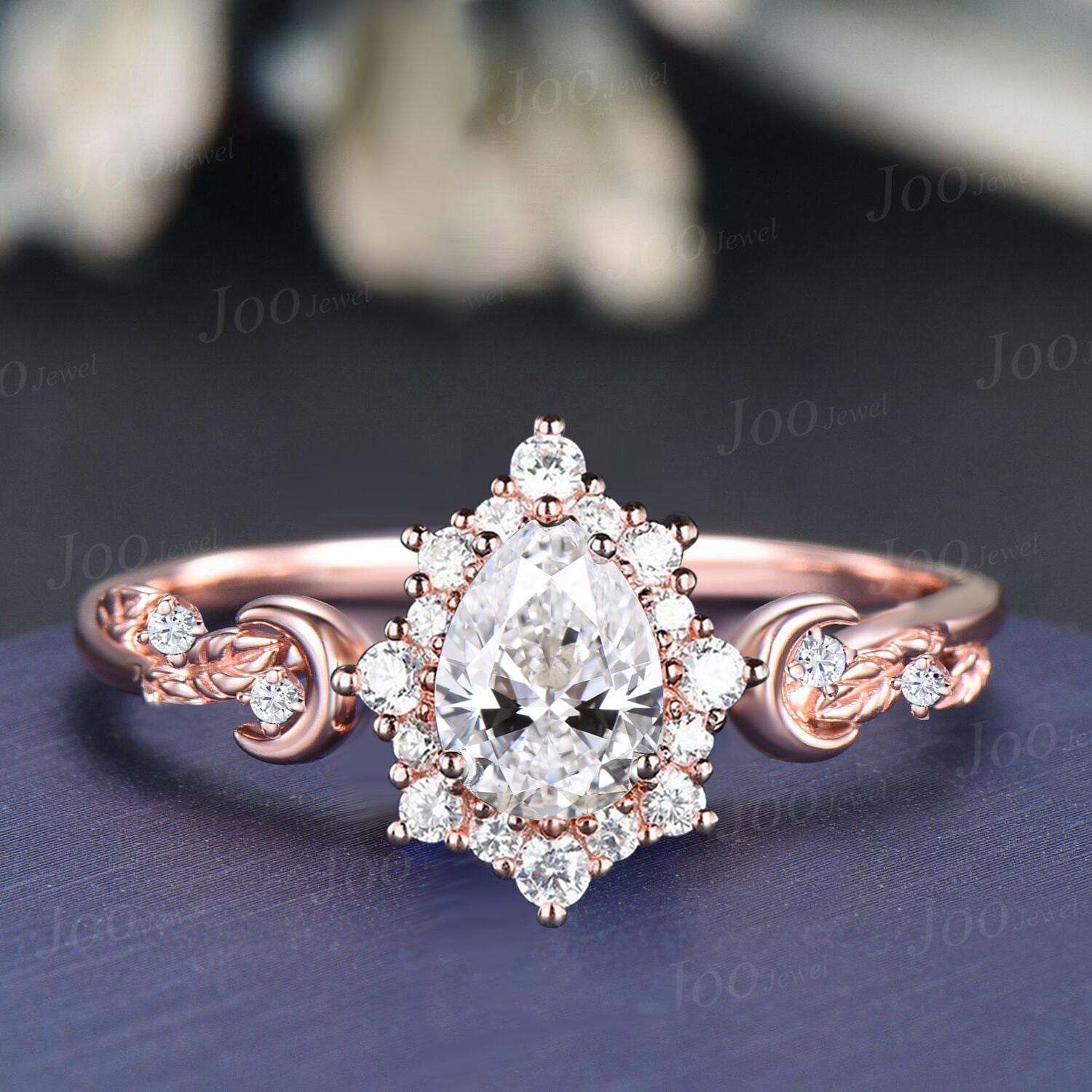 Pear Shaped Halo Diamond Engagement Ring 10K Rose Gold Moon Leaf Design VVS D Lab Grown Diamond Wedding Ring with IGI Certificate for Women