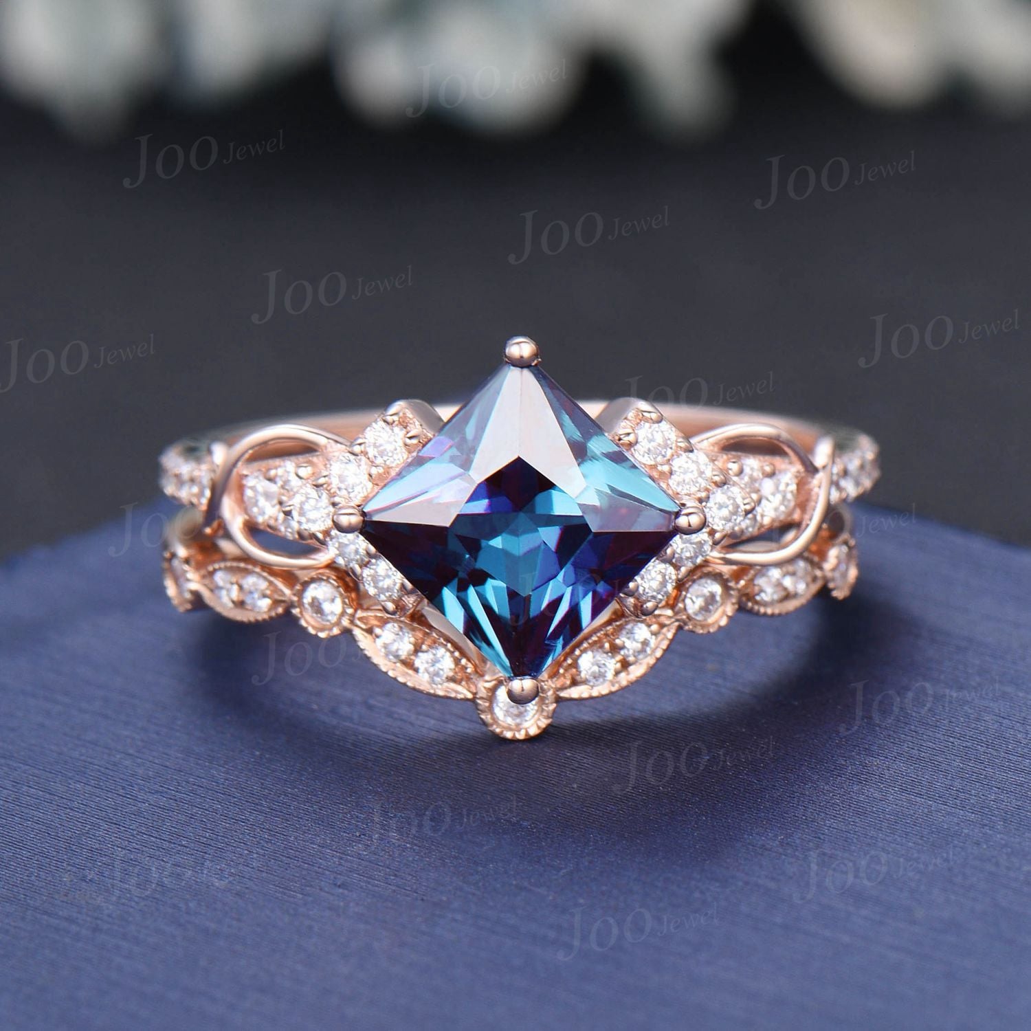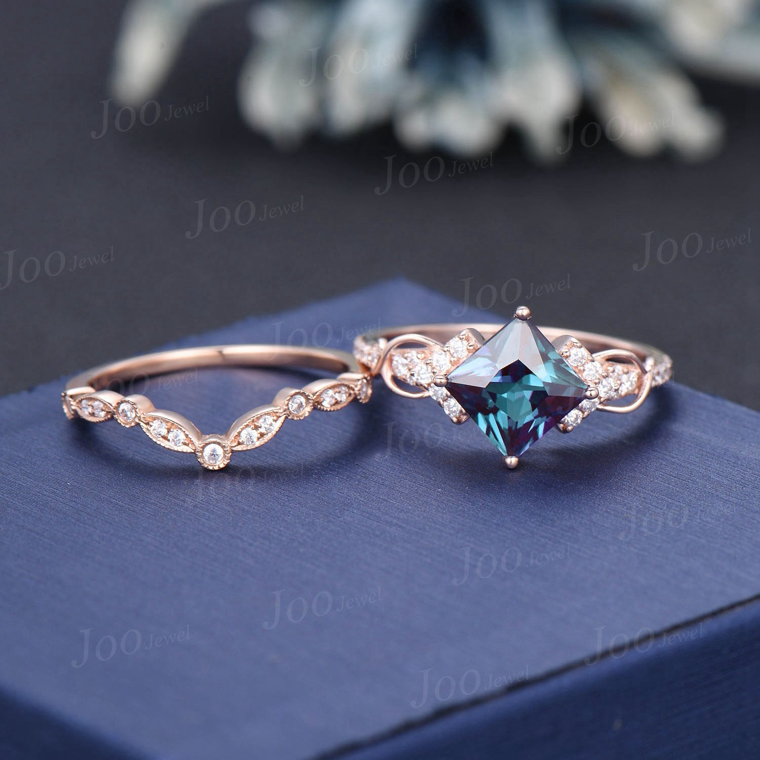 Princess Cut Color-Change Alexandrite Wedding Ring Set Rose Gold Half Eternity Moissanite Ring Unique Infinity Love Promise/Anniversary Ring