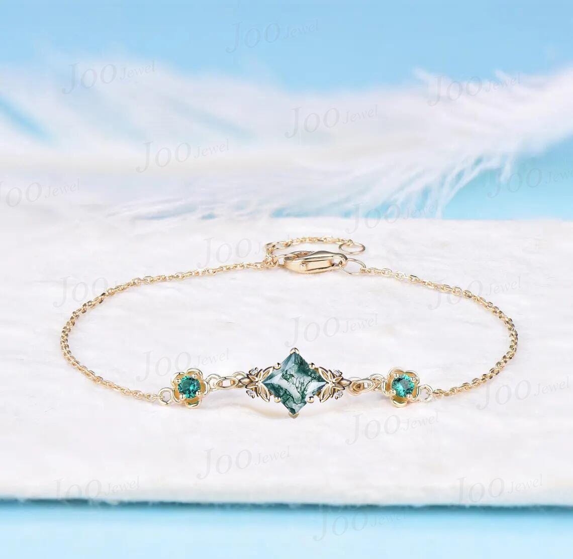 Princess Cut Natural Moss Agate Flower Chain Bracelet Genuine Agate Emerald Adjustable Bracelet Unique Birthday/Graduation/Anniversary Gifts
