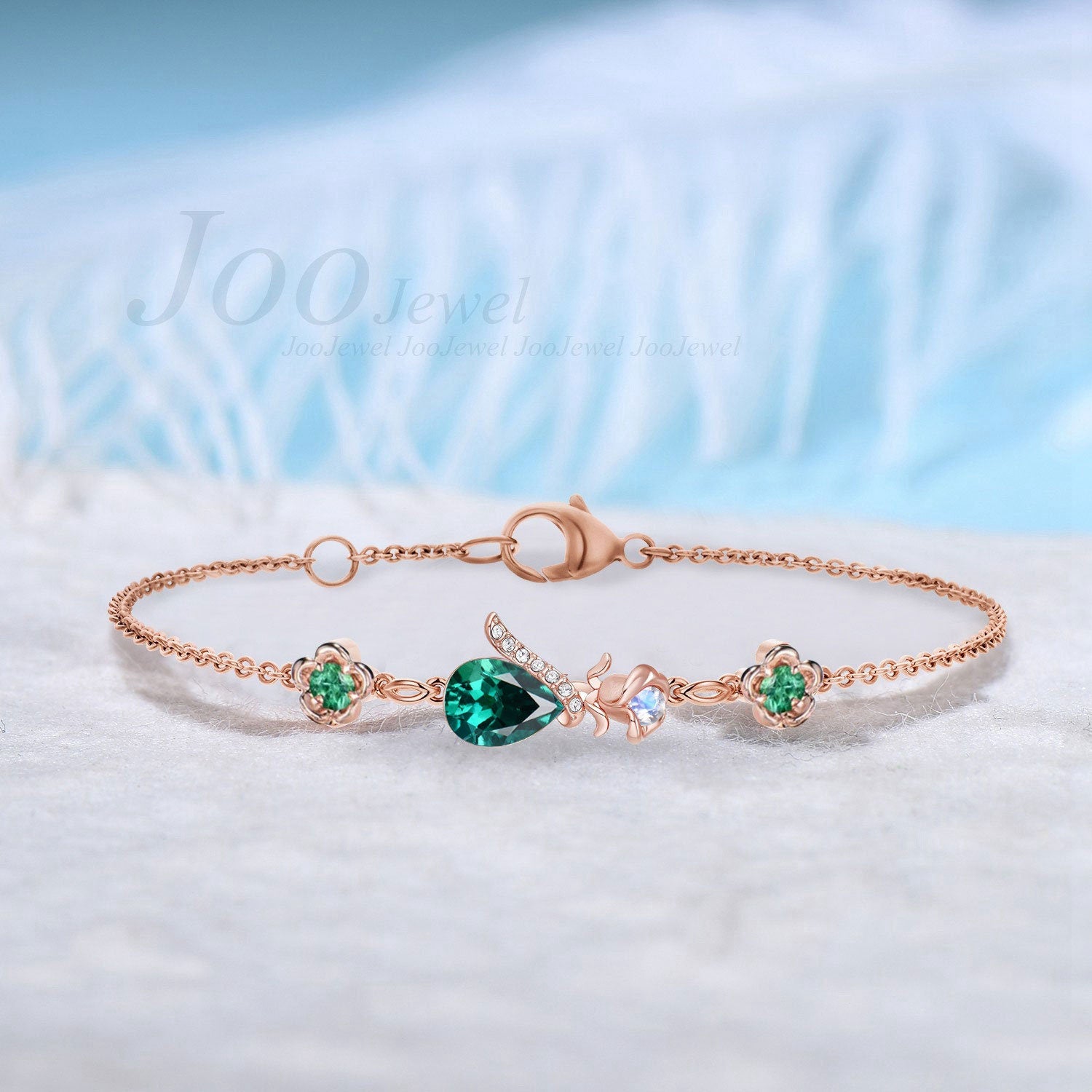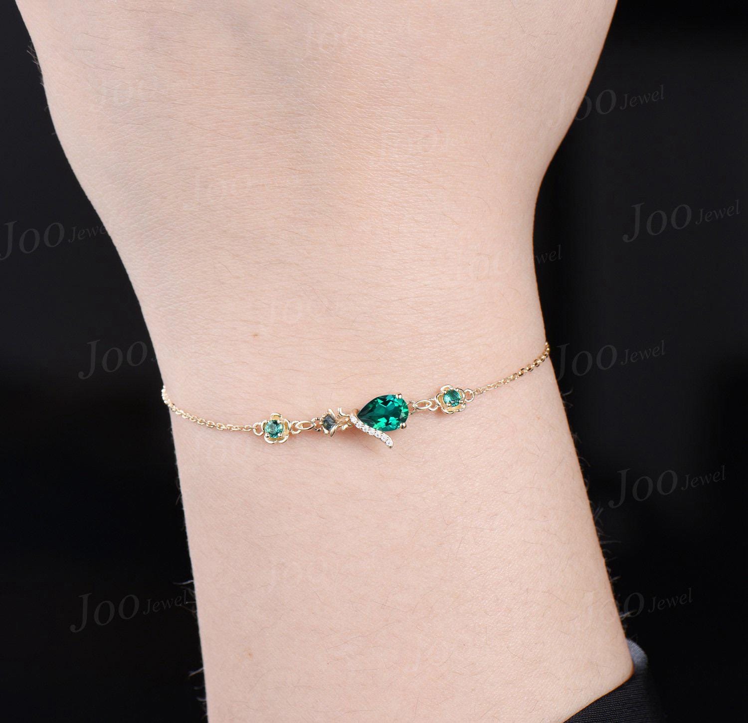 Sterling Silver Floral Flower Bracelet Teardrop Cut Emerald Moonstone Chain Bracelet Dainty Green Gemstone Charm Bracelet for Wedding Bridal