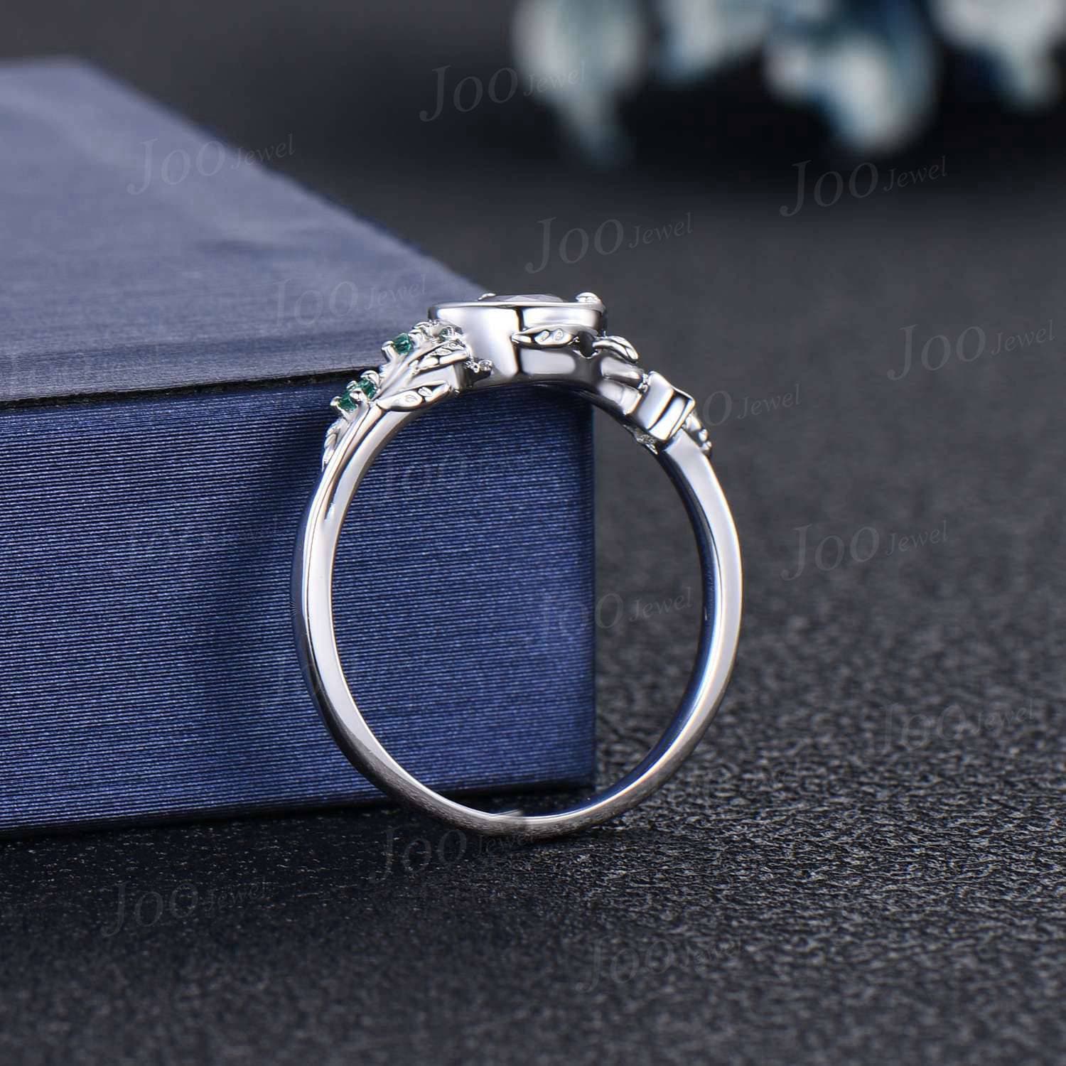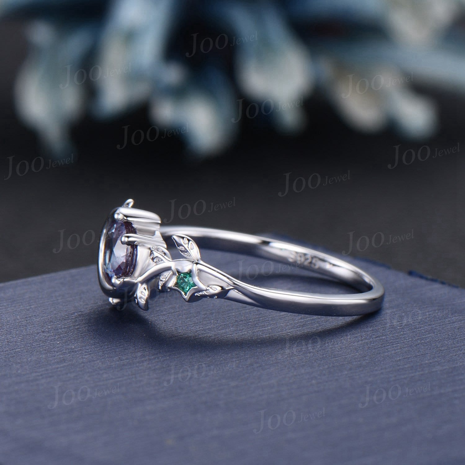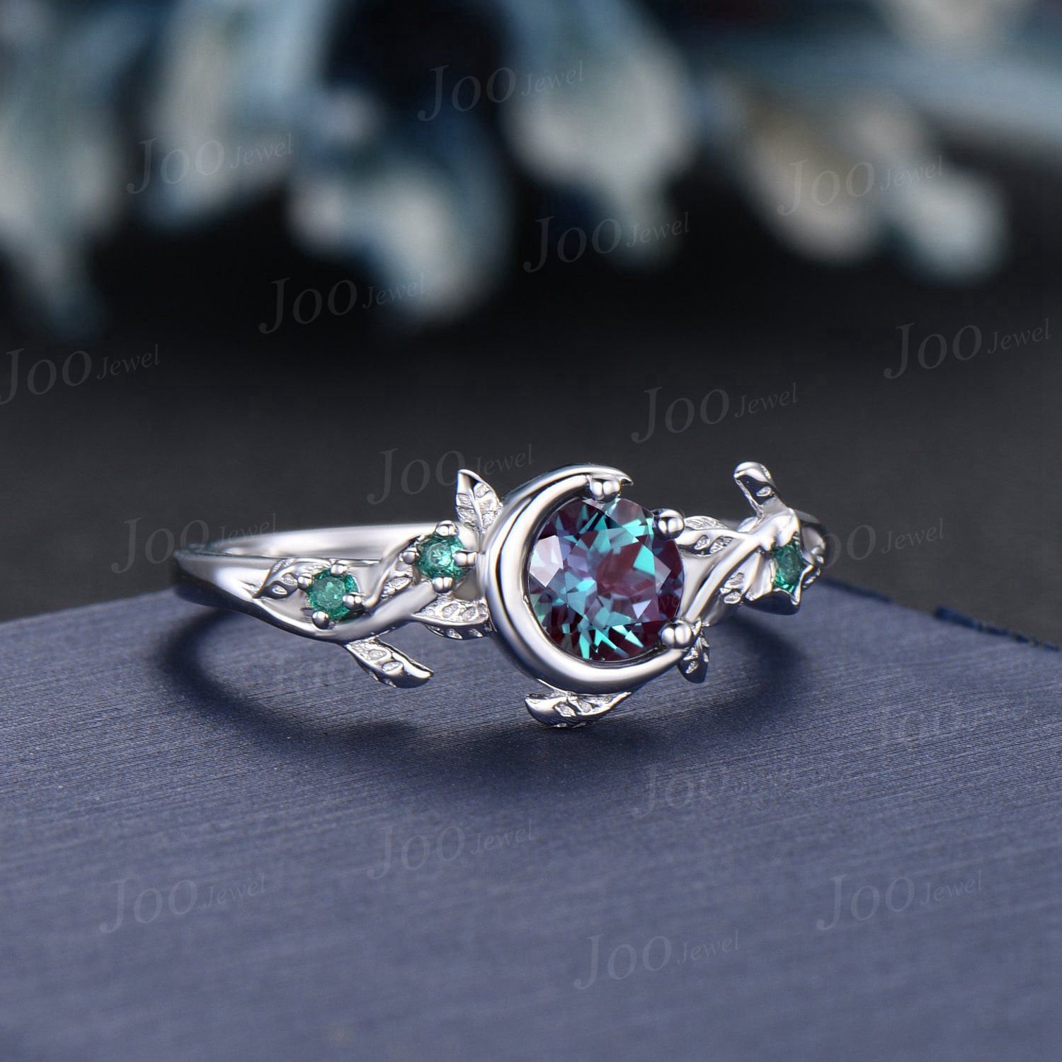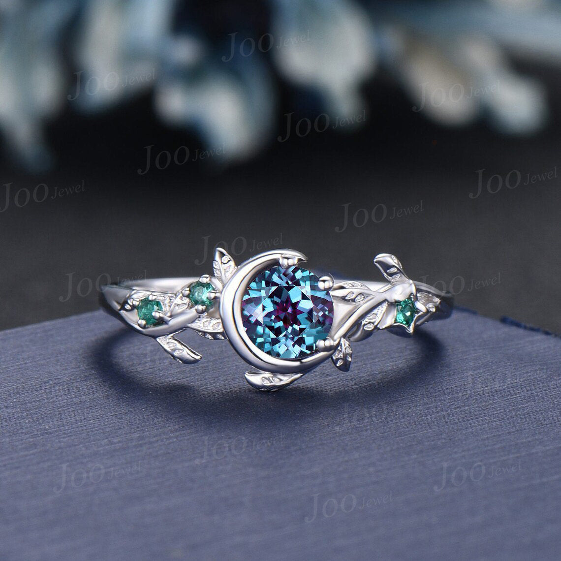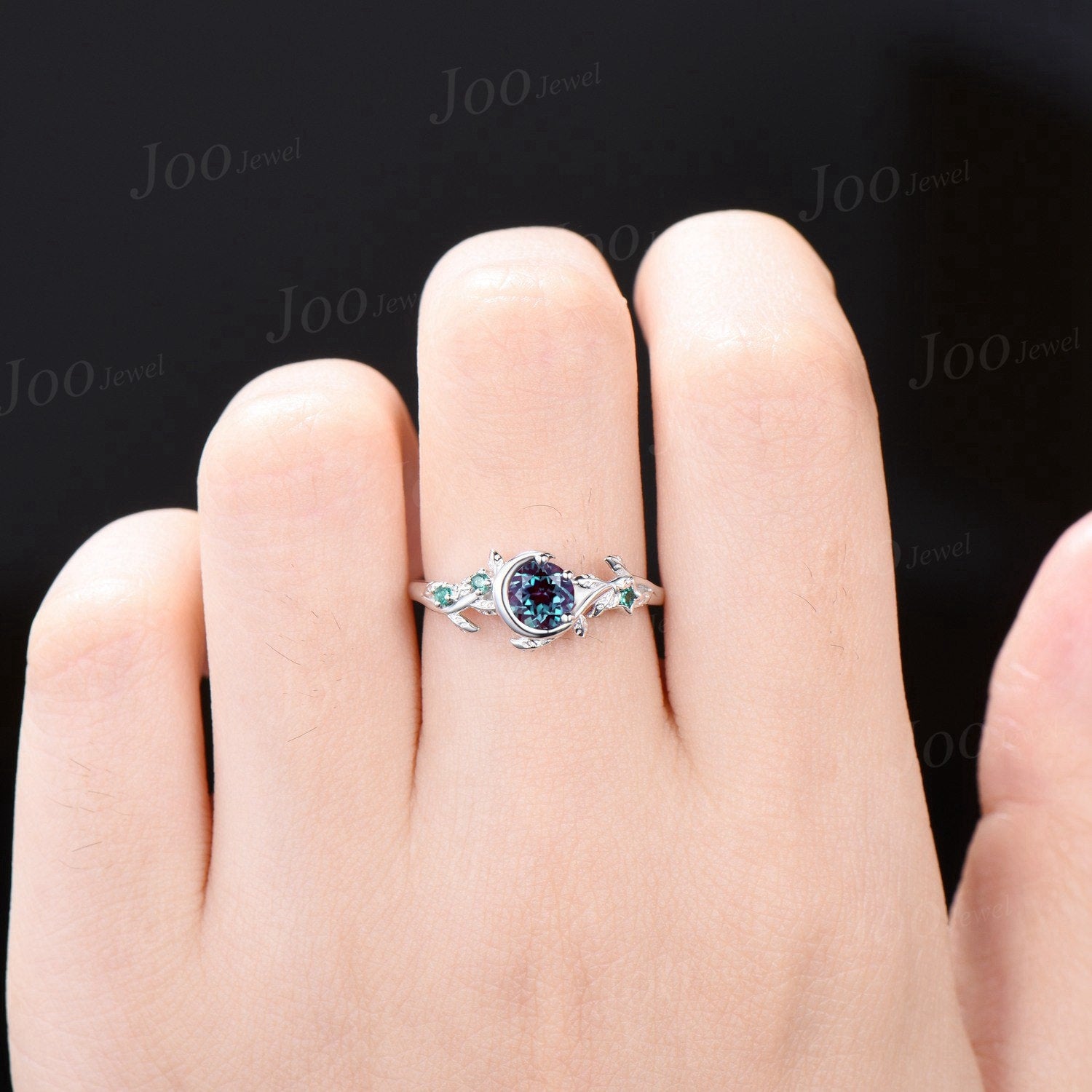 Sterling Silver Round Alexandrite Nature Engagement Ring June Birthstone Gift Cluster Emerald Moon Wedding Ring Unique Birthday Gift Women
