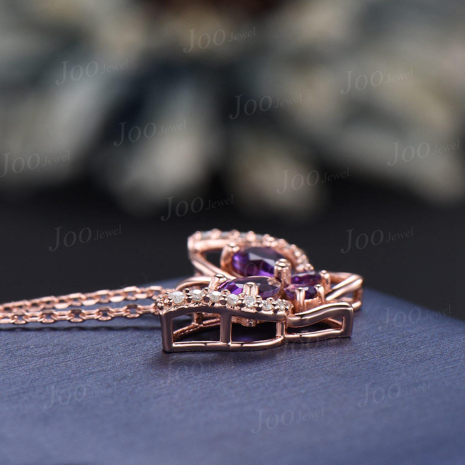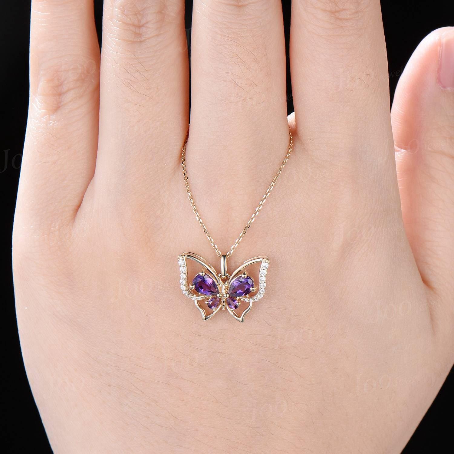 Teardrop Real Amethyst Butterfly Necklace Vintage 14K Rose Gold Vintage Purple Crystal Pendant Unique February Birthstone Gifts For Daughter