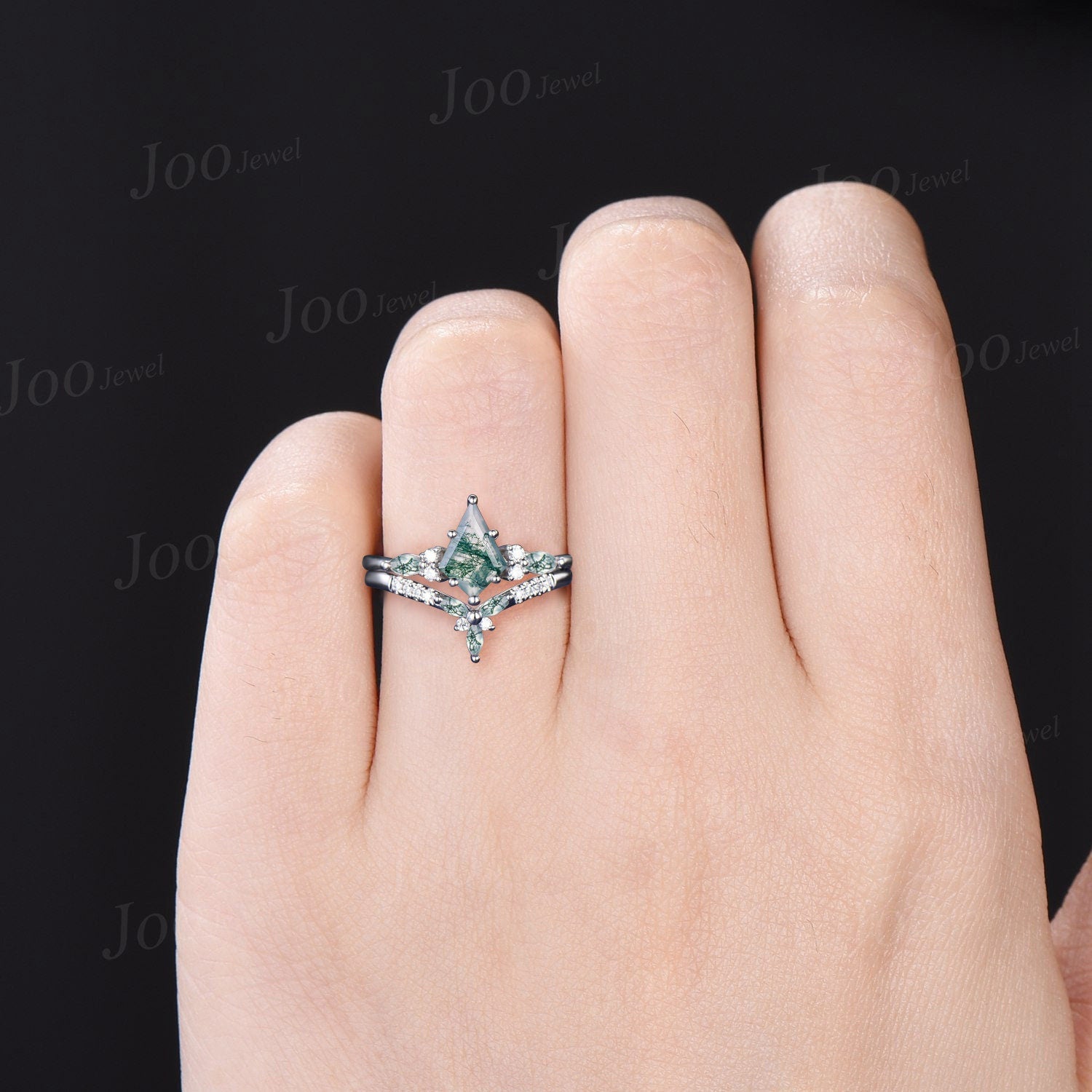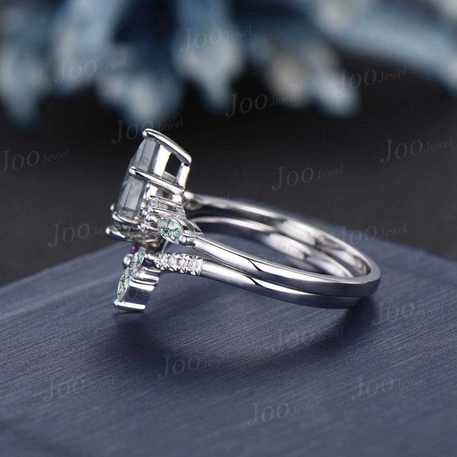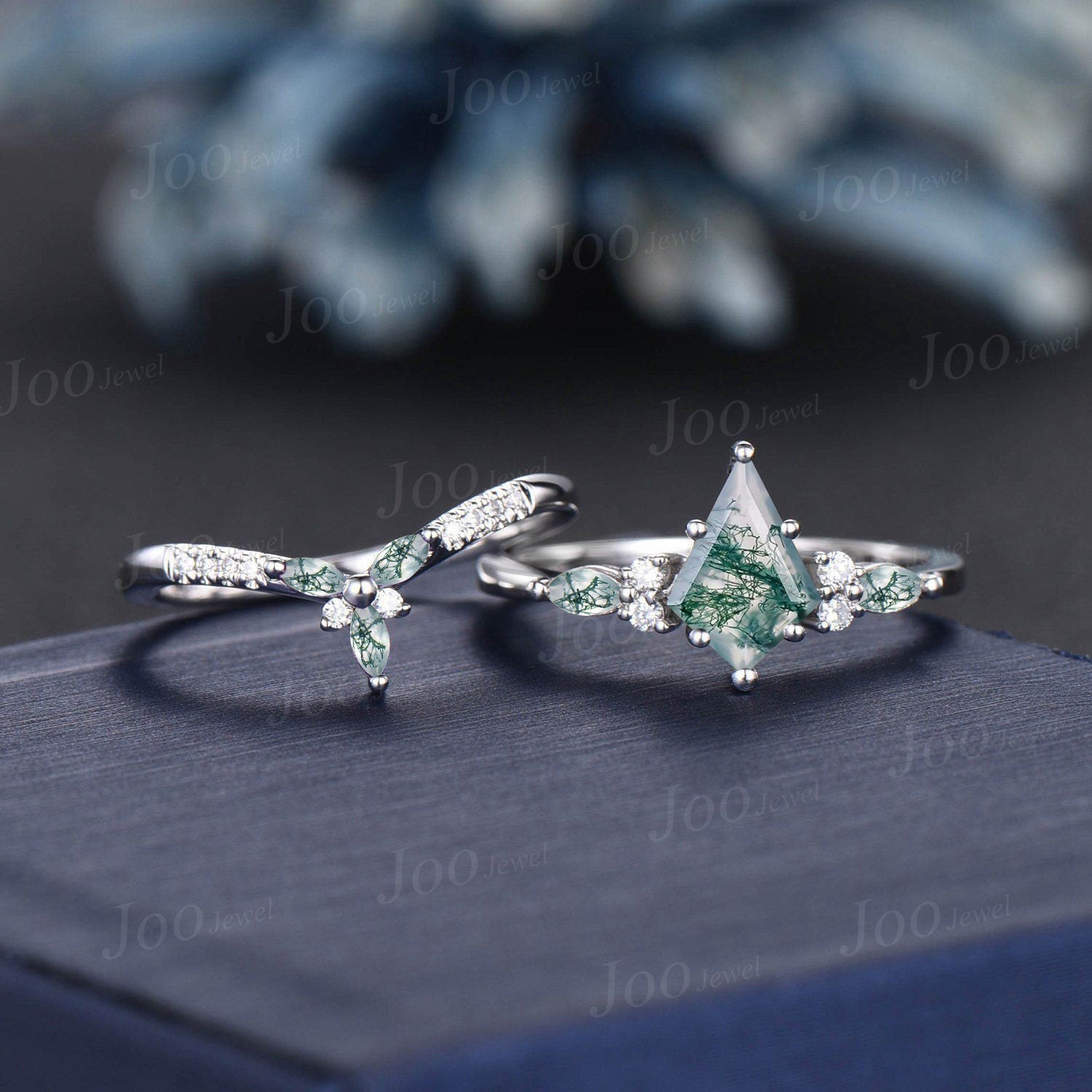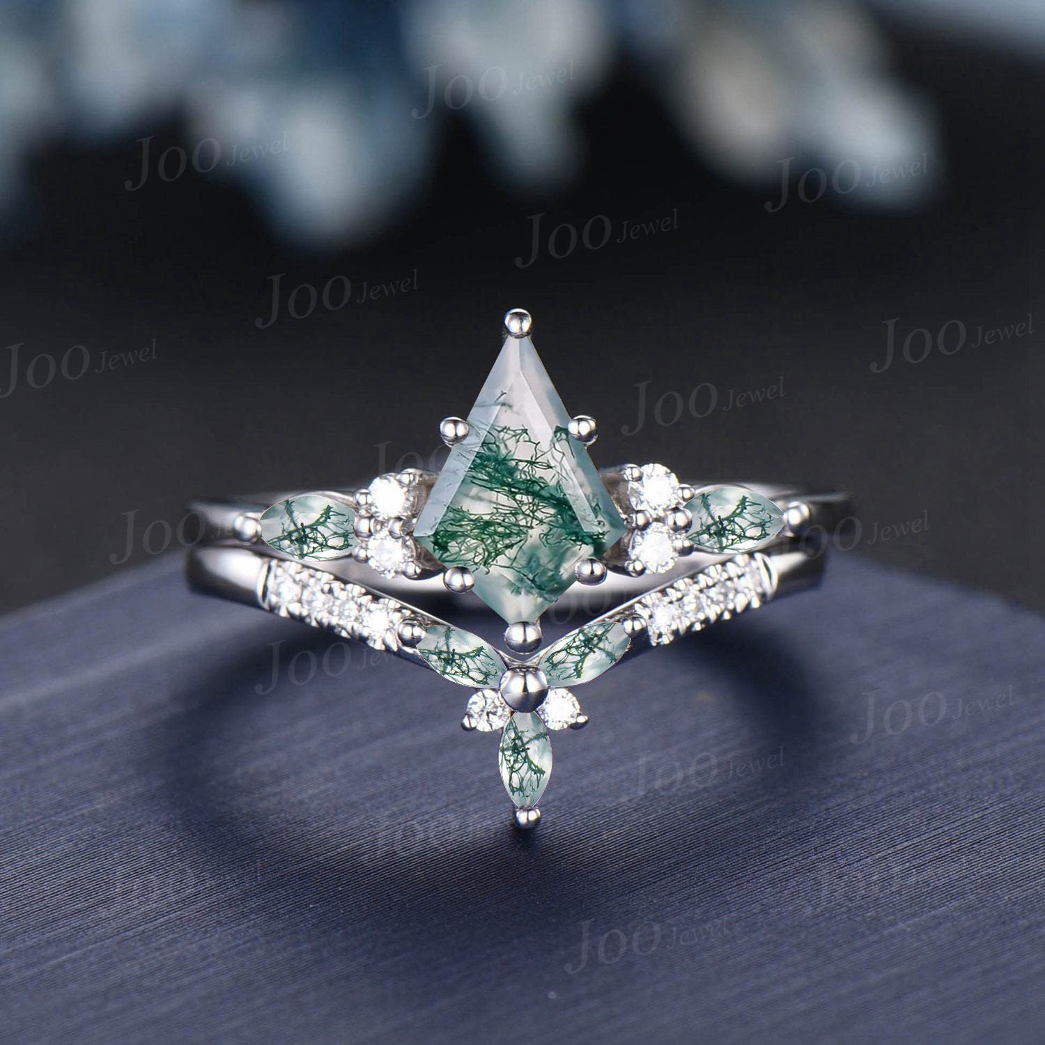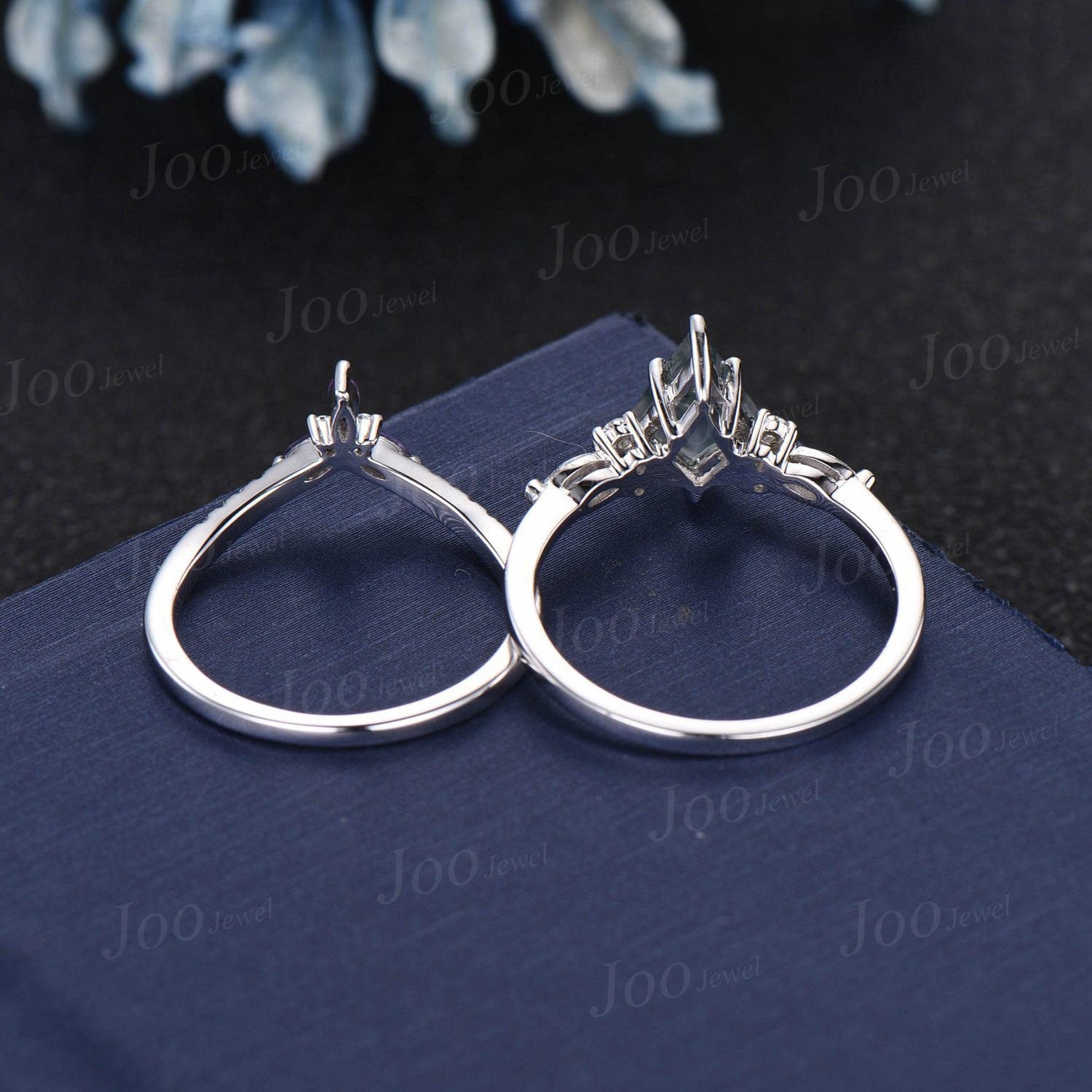 Vintage Kite Cut Green Moss Agate Engagement Ring Set 14k White Gold Marquise Moss Moissanite Ring Women Unique Agate Stone Wedding Ring Set