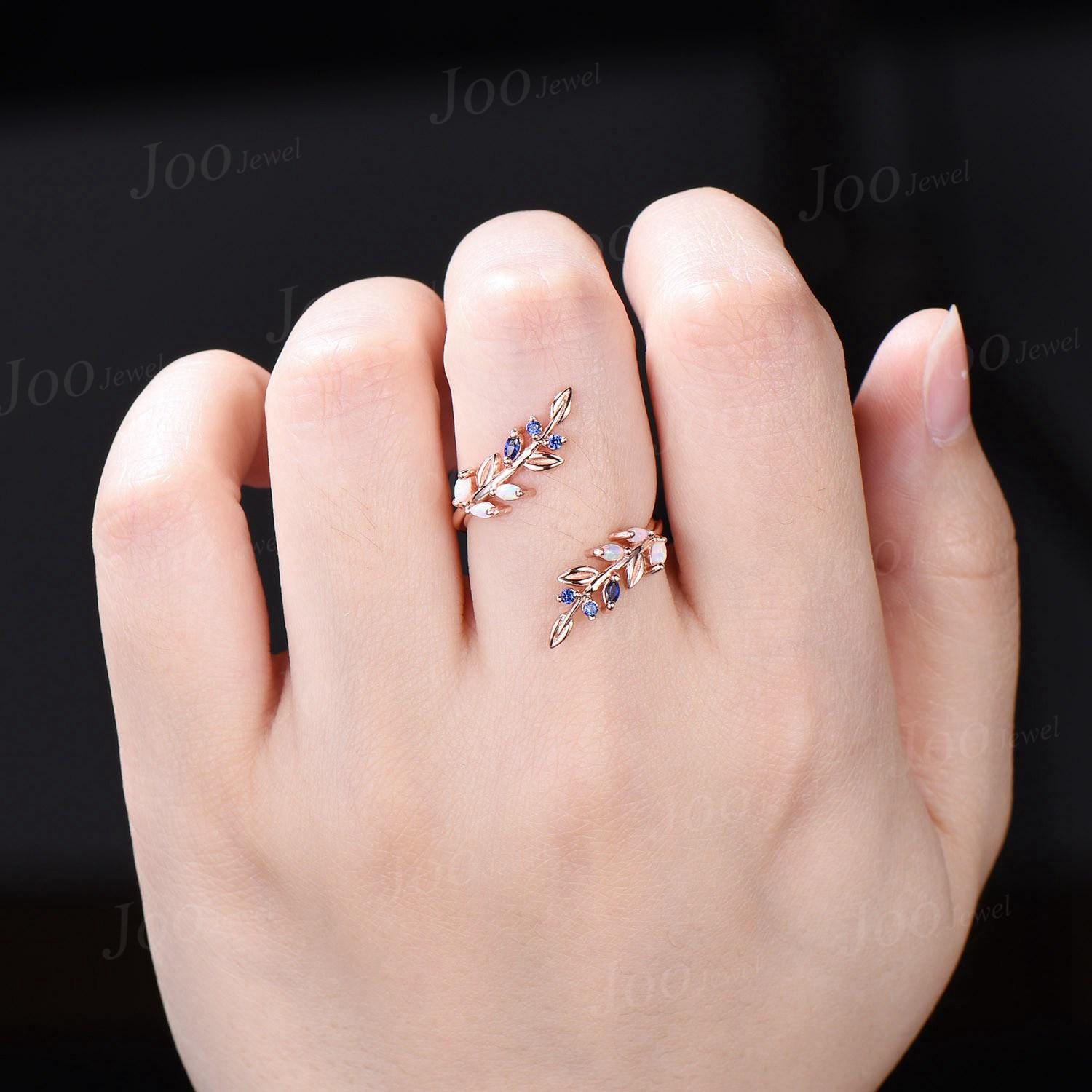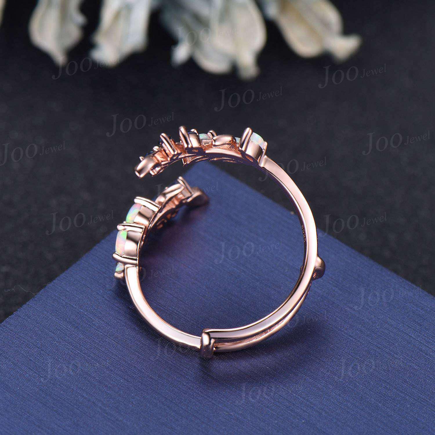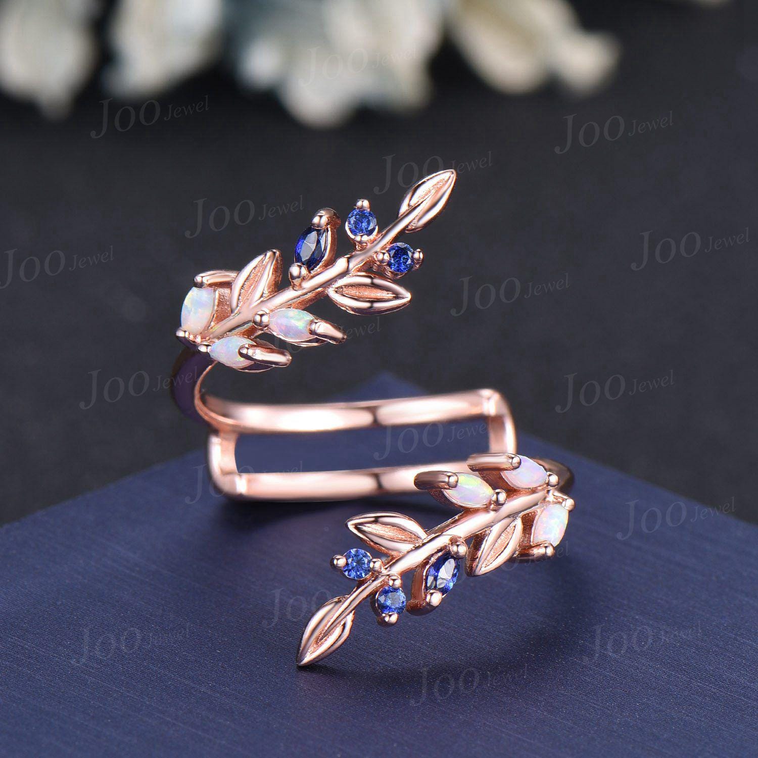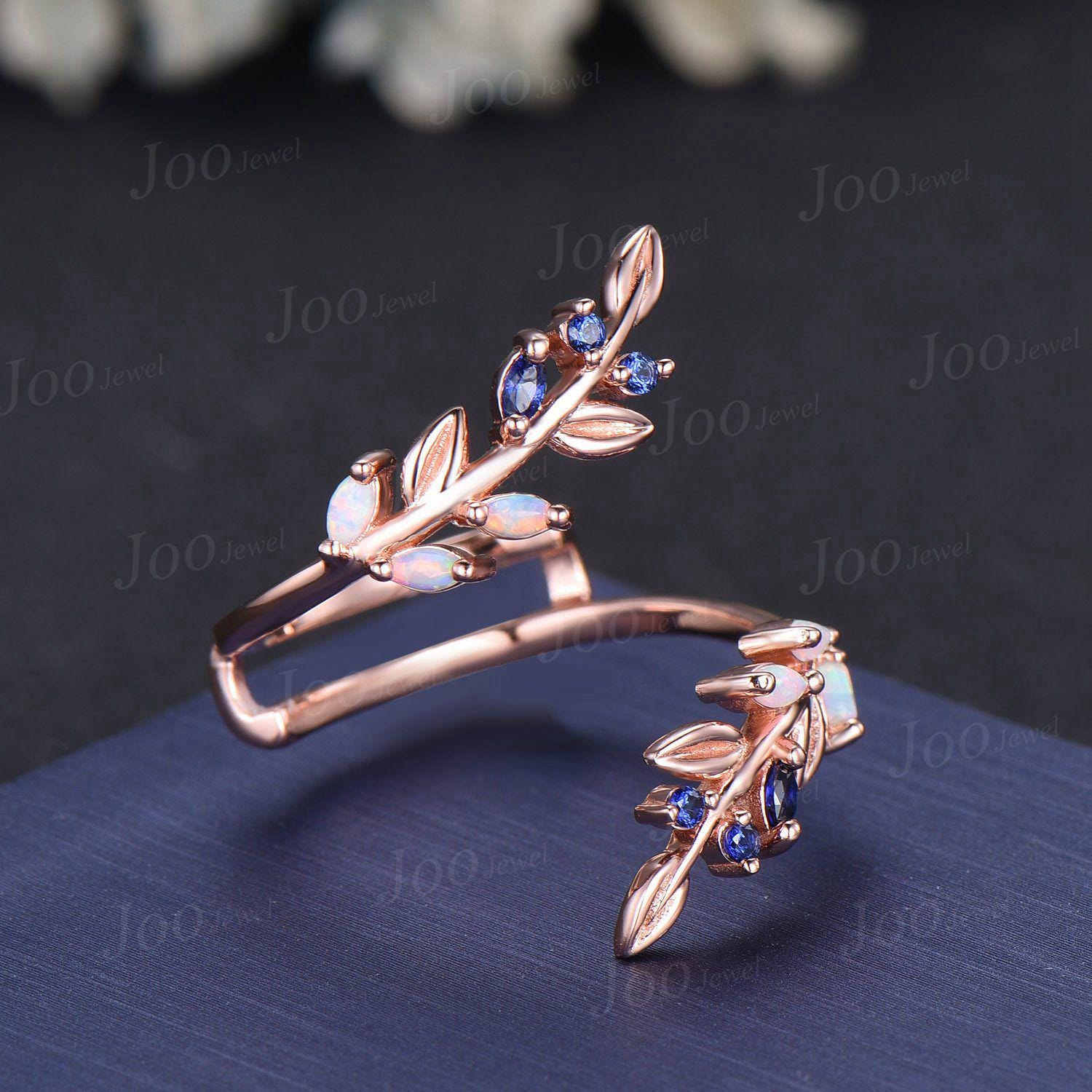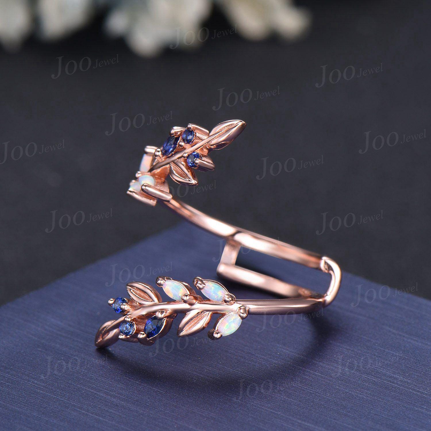 Vintage Opal Blue Sapphire Leaf Bypass Enhancer Wedding Band Art Deco Wraps Ring Solid 14k Rose Gold Cluster Double Wedding Band for Women